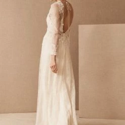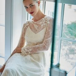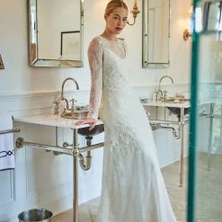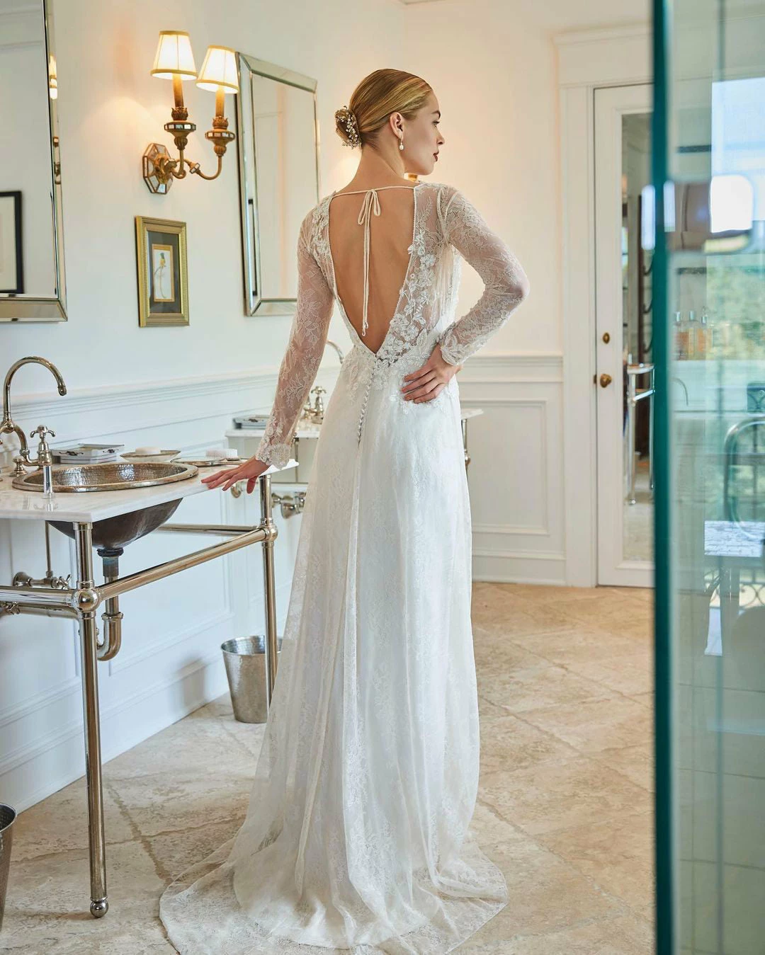 This gorgeously detailed gown offers two vintage-inspired looks in one. A long-sleeve overlay in gossamer lace with pearly beadwork (including a beaded belt) makes the perfect ceremony look. Remove the overlay to reveal an open-backed champagne slip dress for dancing the night away!