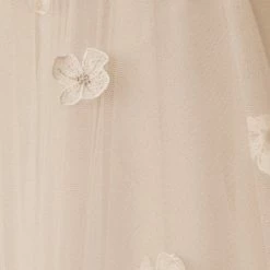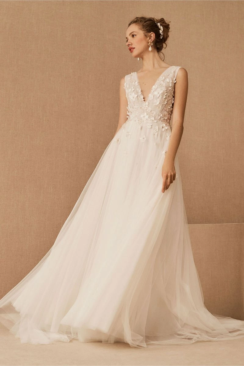 Dimensional floral appliques flutter atop this gown’s V-neck bodice, which has a plunging back with dainty covered buttons. An airy tulle skirt with a flowy train completes this romantic look. By Jenny Yoo.