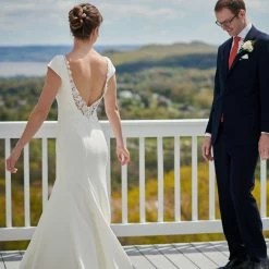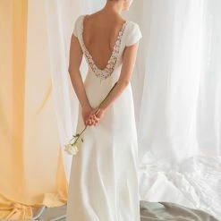 Modern and understated at first glance, this cap-sleeved gown reveals its romantic side with an open back edged in scalloped lace embroidery. Princess seams and a fitted skirt assure a flattering and subtly sexy fit, white nearly invisible illusion mesh secures the deep v-neckline. By Jenny Yoo.