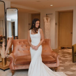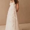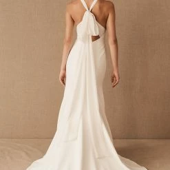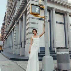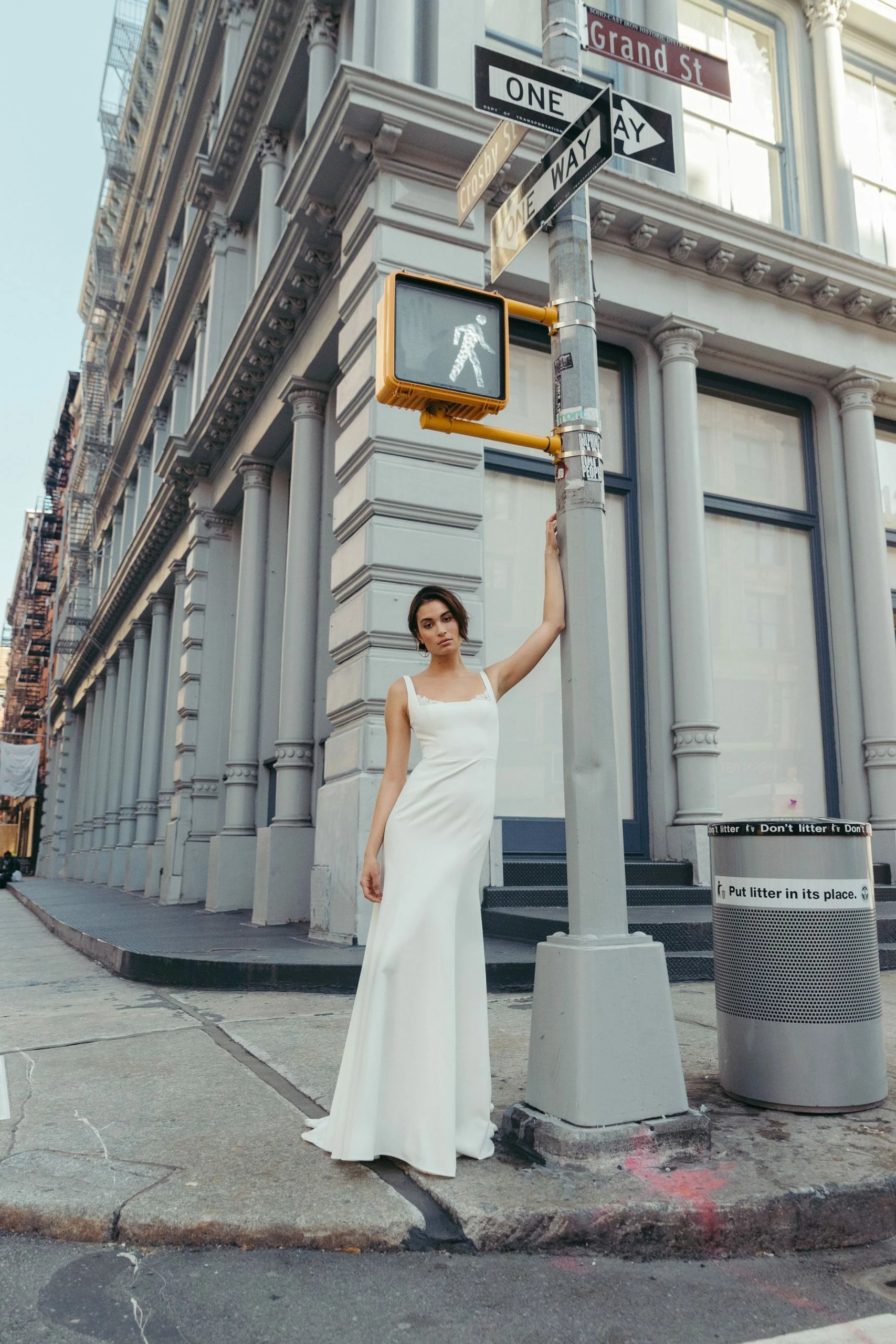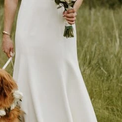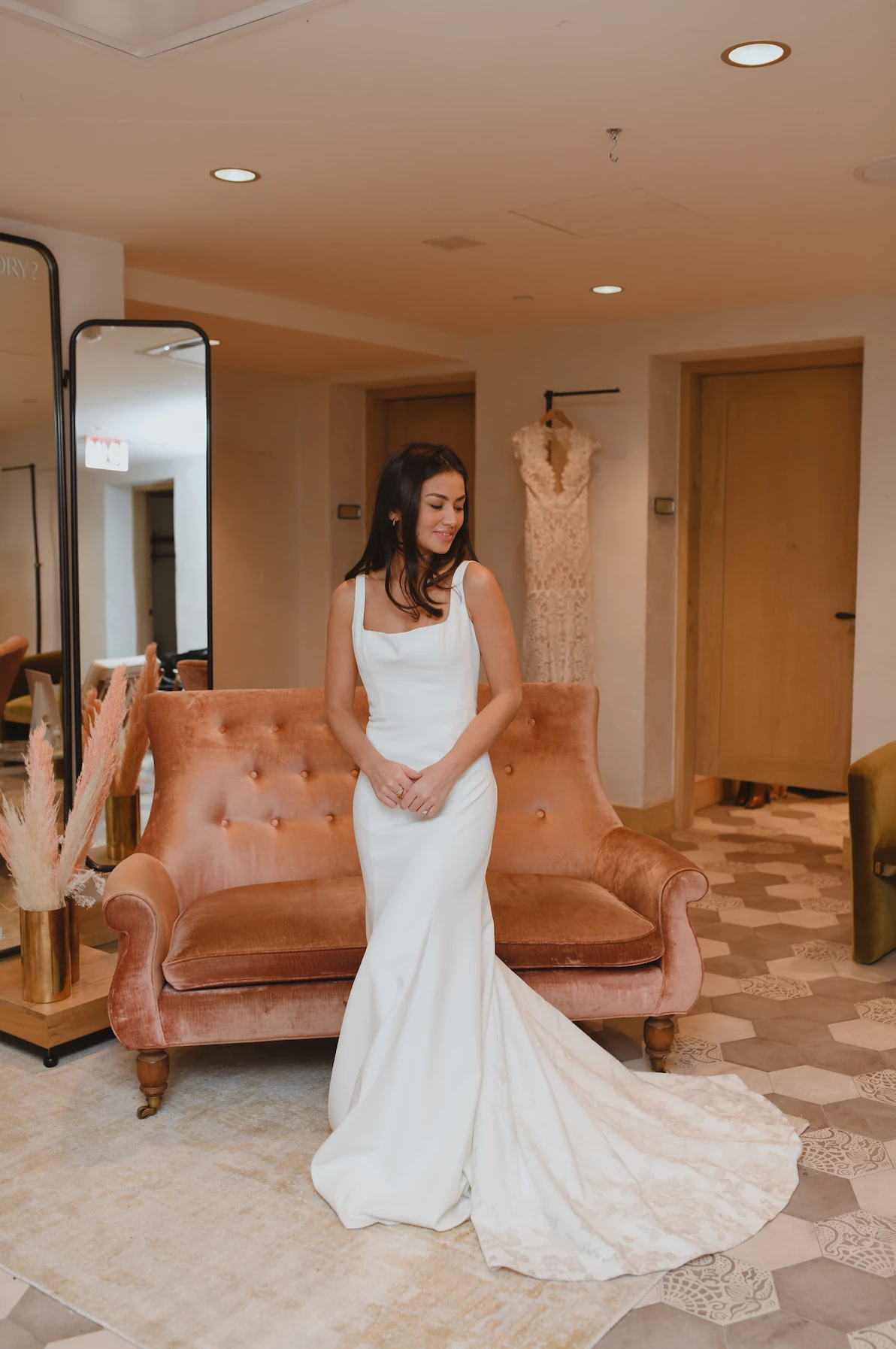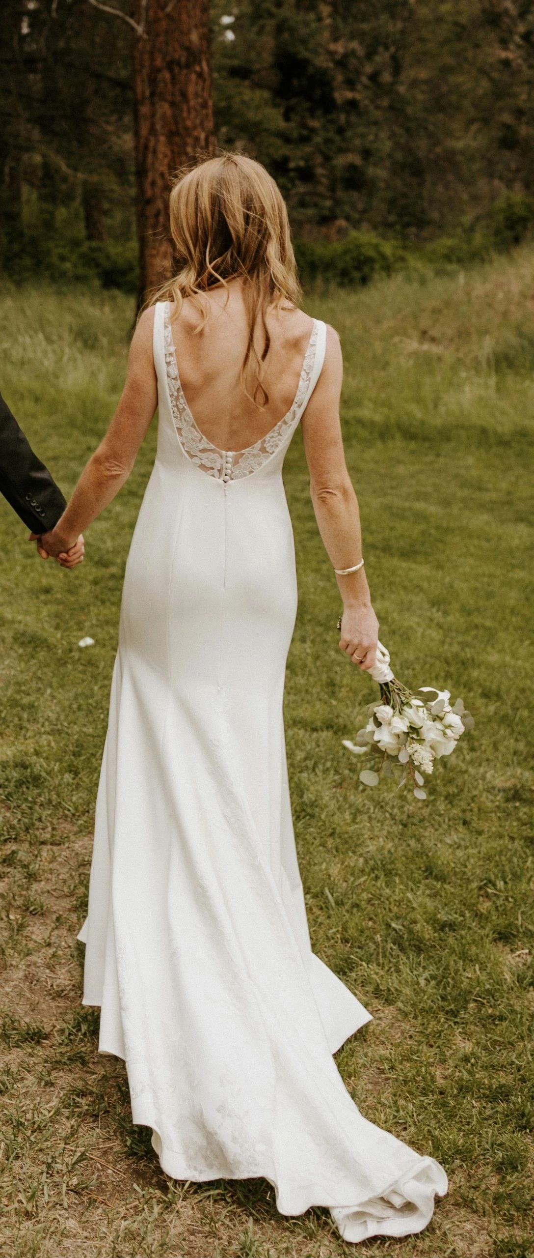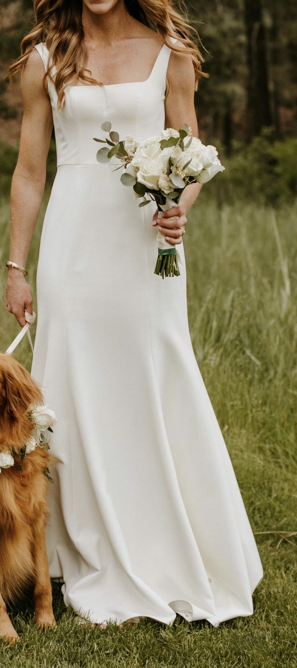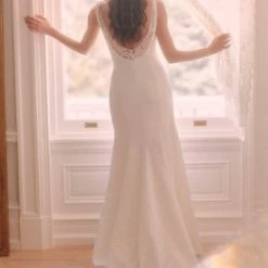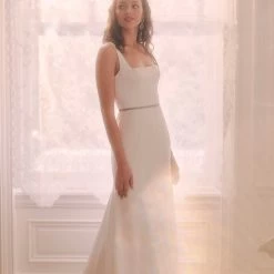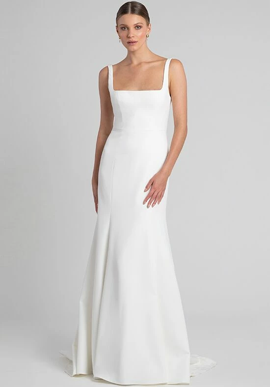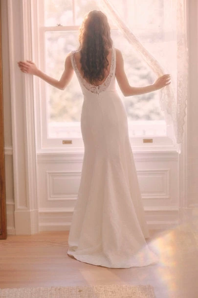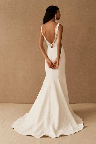 A chic square neckline lends a modern edge to this fitted crepe mermaid gown, while floral lace details add romantic softness to the plunging back and sweeping train. By Jenny Yoo.Â