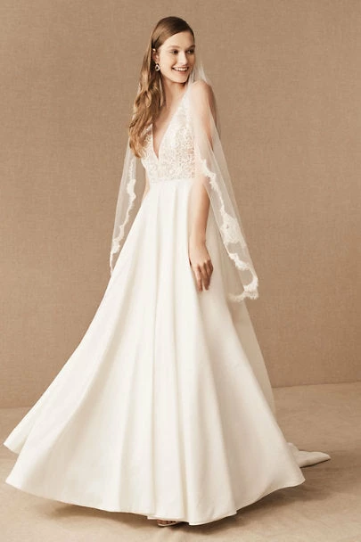 A corded lace bodice adds dimension to this classic ballgown silhouette with a sweeping taffeta skirt. Piping outlines the bodice for a modern take on lace, while sweet button details finish the open v-back. Best of all, it has pockets! By Jenny Yoo.