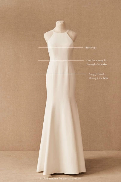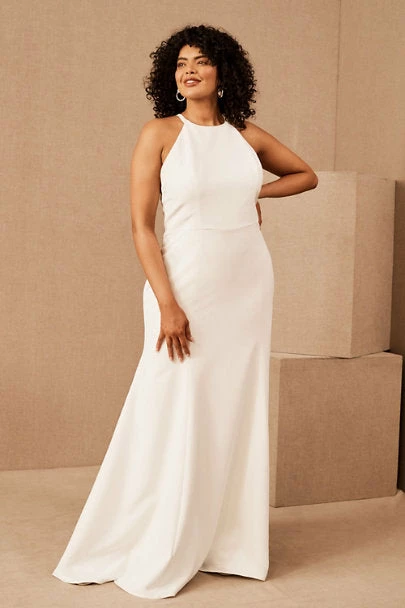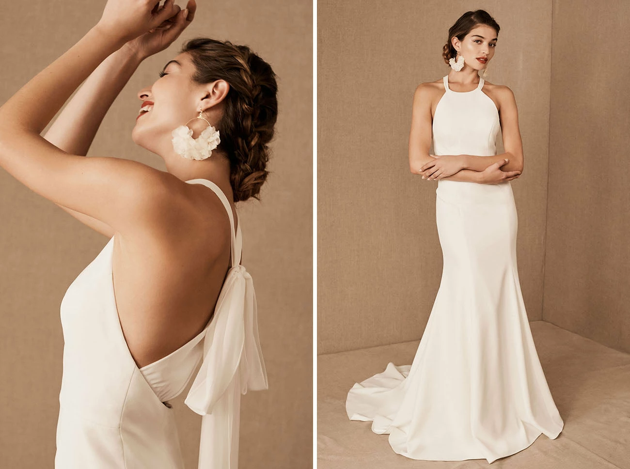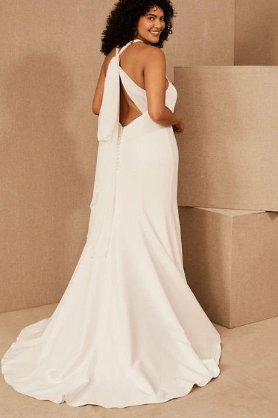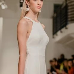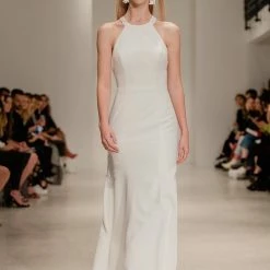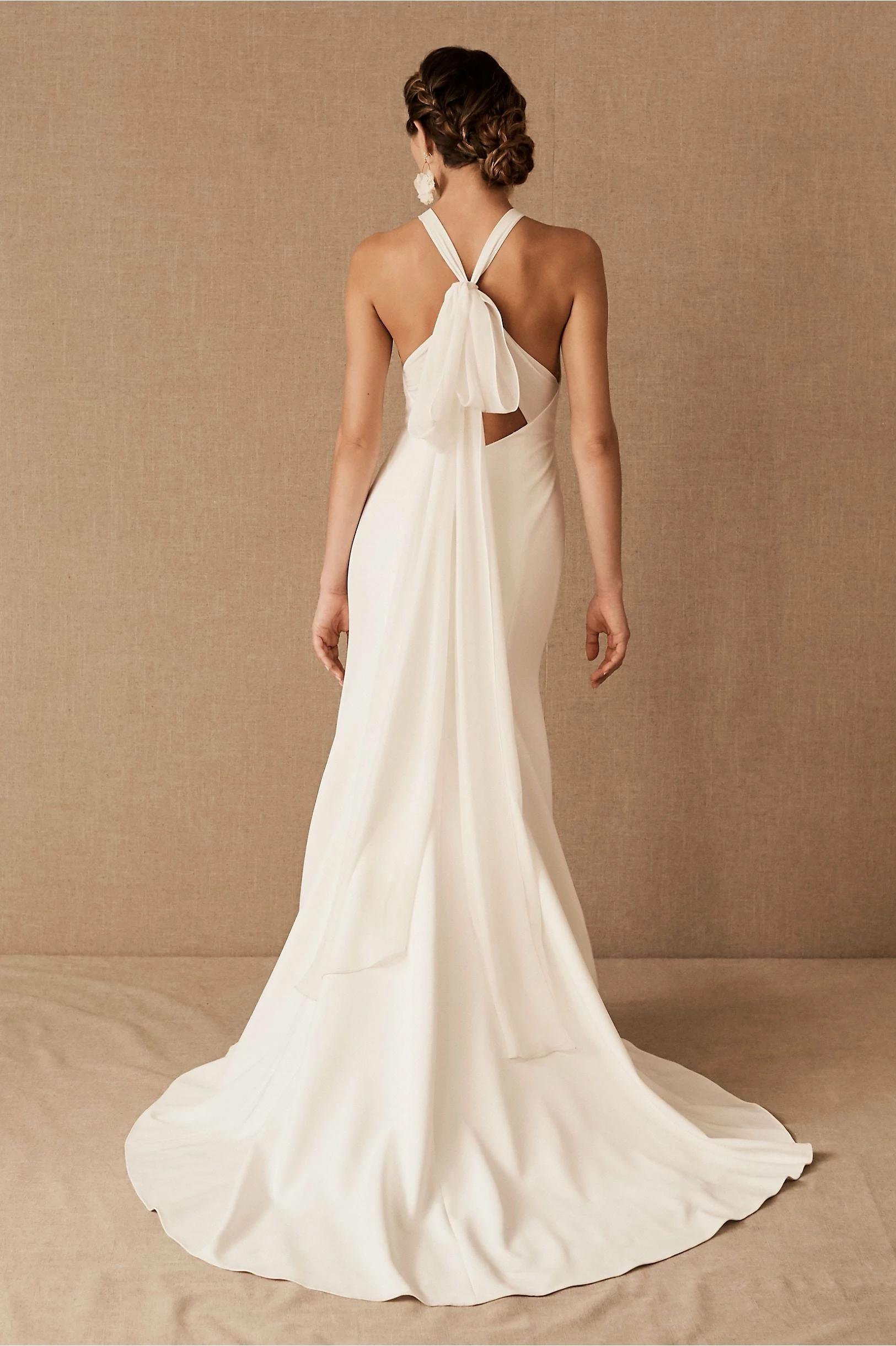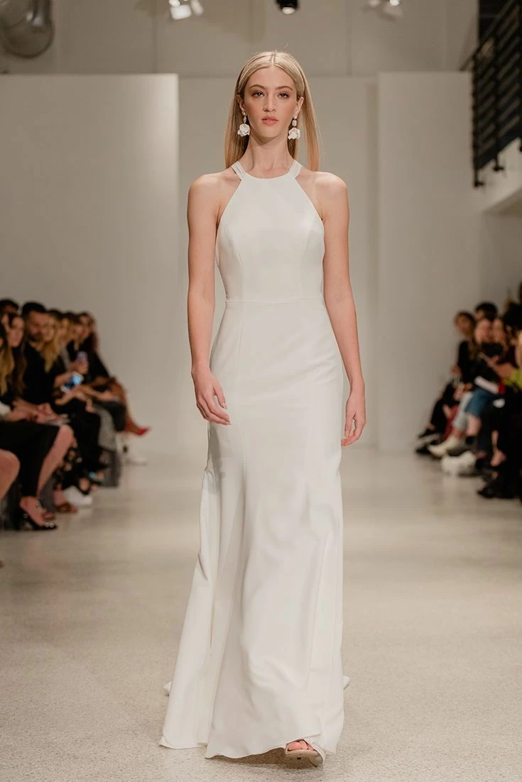 With a fitted silhouette and chic halter neckline, this sleek gown is tailored for the modern bride. At the back, a versatile bow can be tied multiple ways to create a look all your own. By Jenny Yoo.