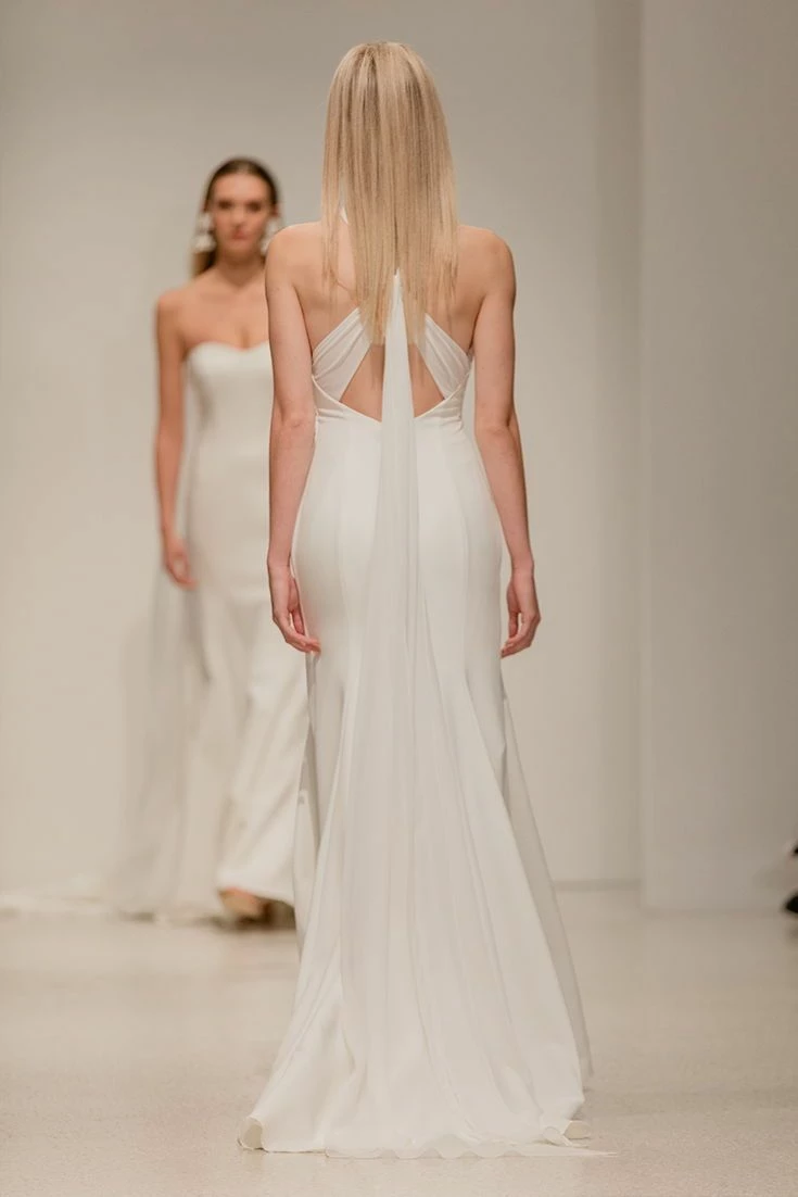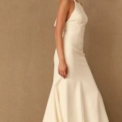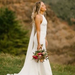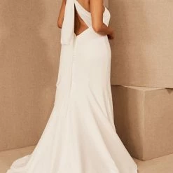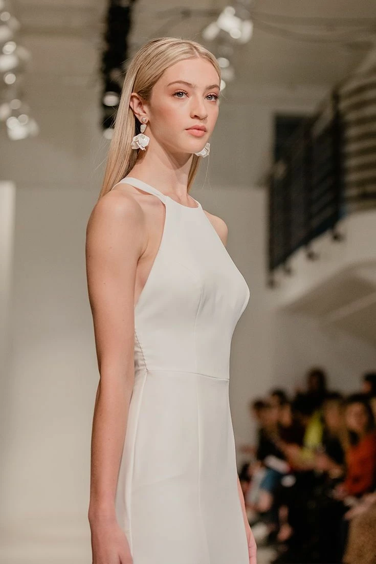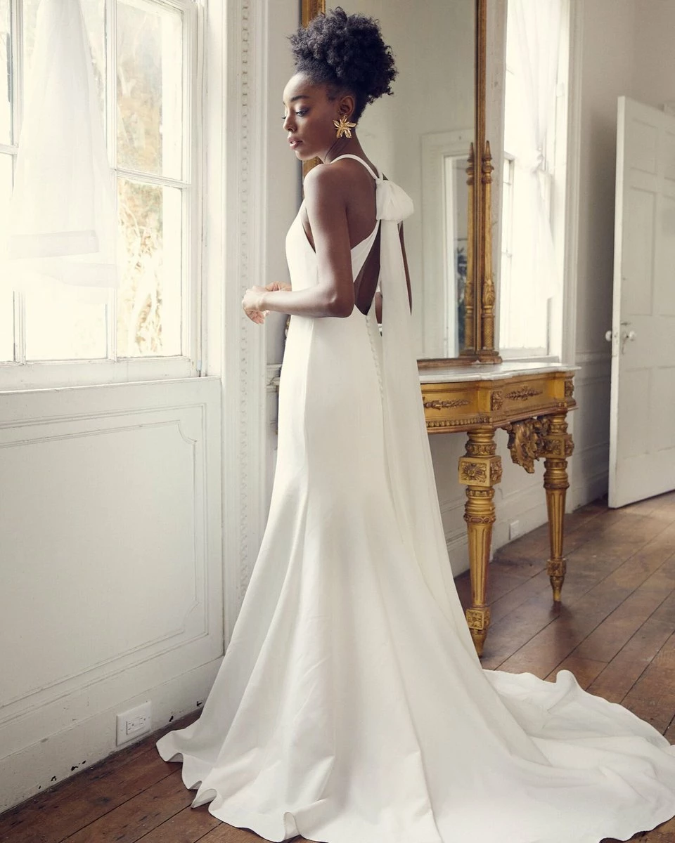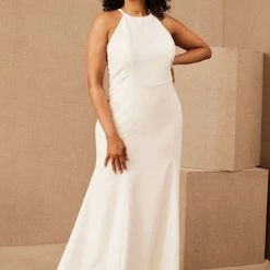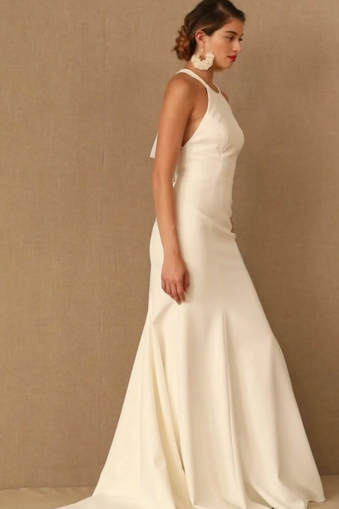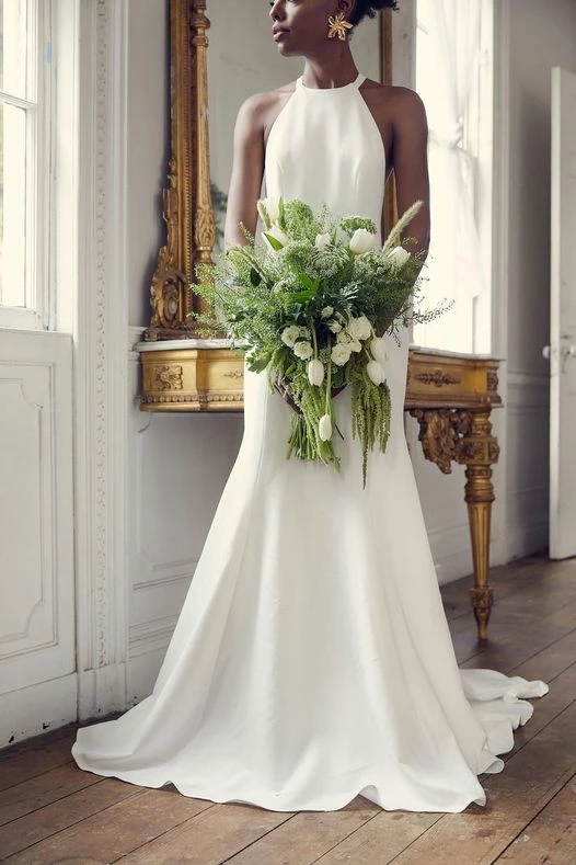 With a fitted silhouette and chic halter neckline, this sleek gown is tailored for the modern bride. At the back, a versatile bow can be tied multiple ways to create a look all your own. By Jenny Yoo.