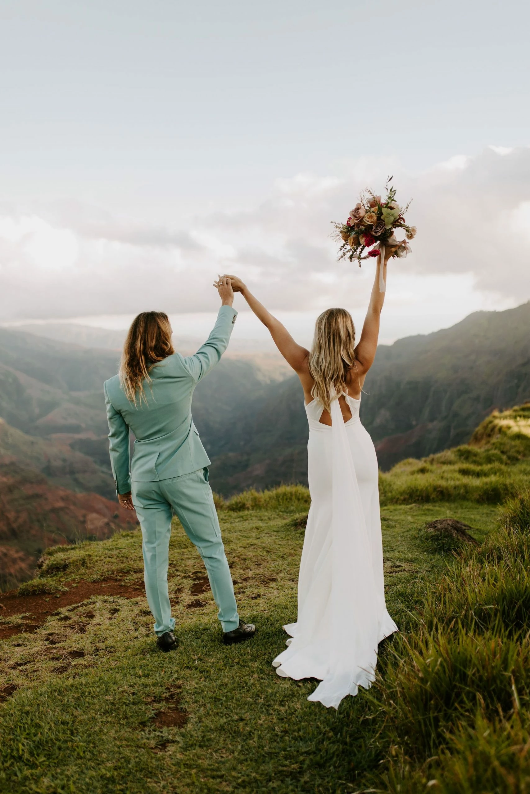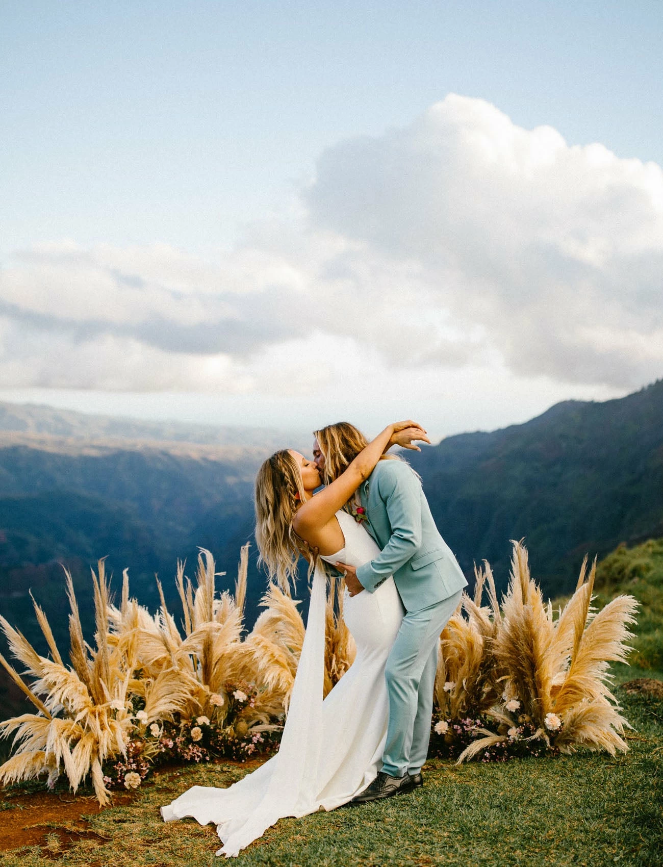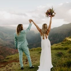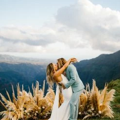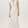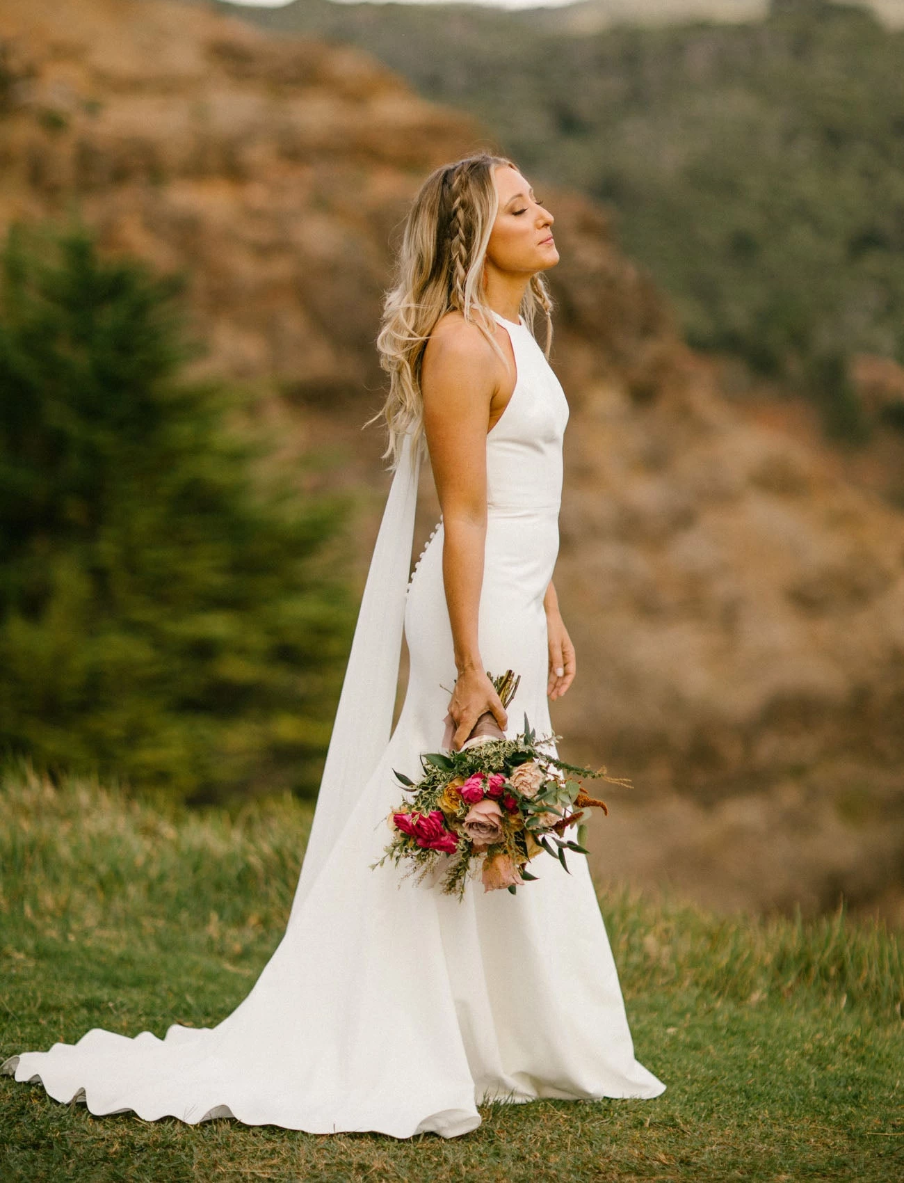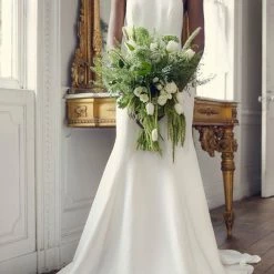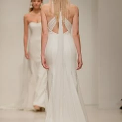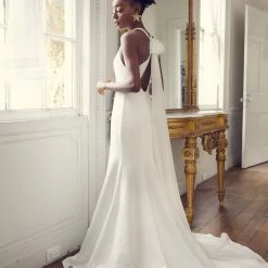 With a fitted silhouette and chic halter neckline, this sleek gown is tailored for the modern bride. At the back, a versatile bow can be tied multiple ways to create a look all your own. By Jenny Yoo.