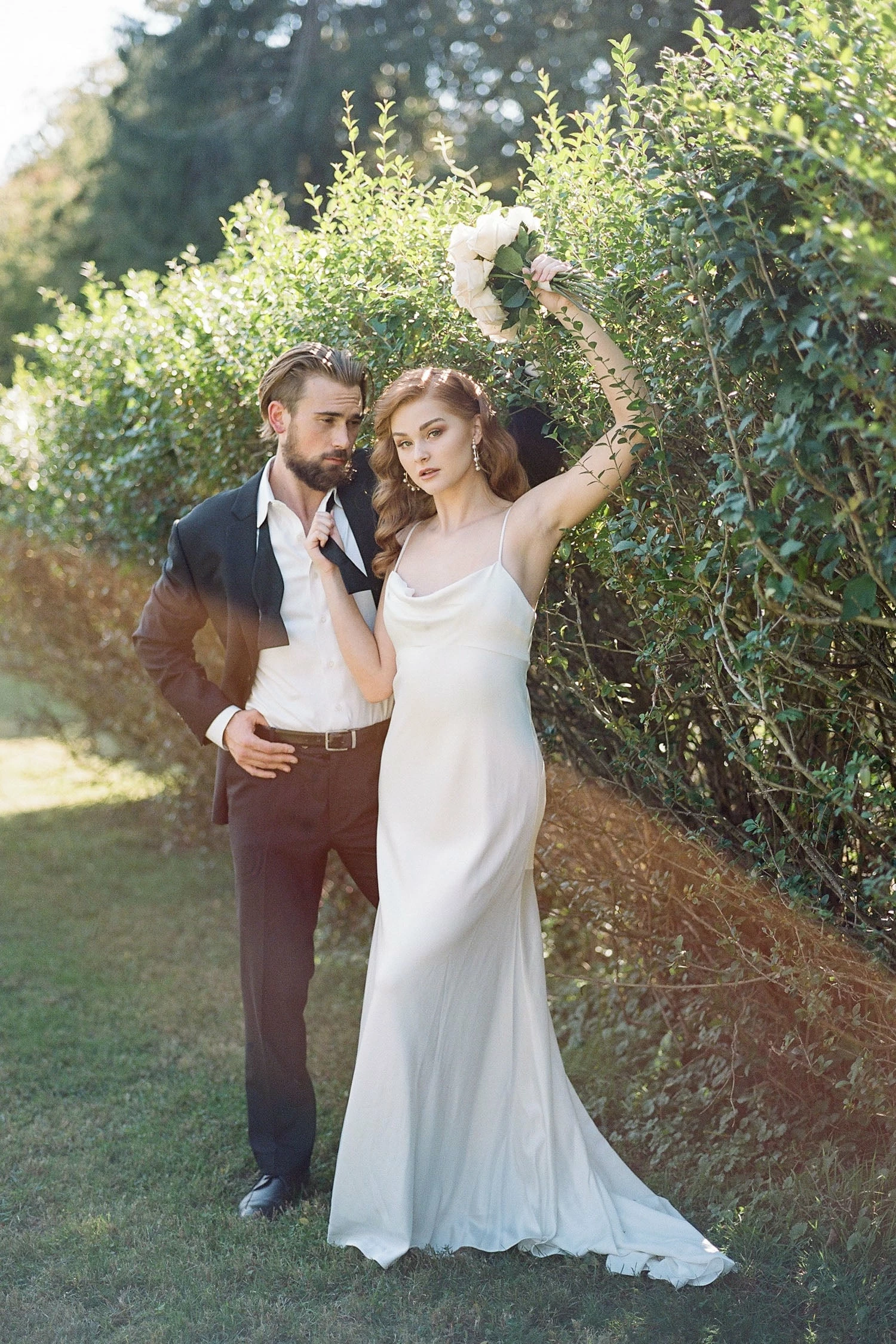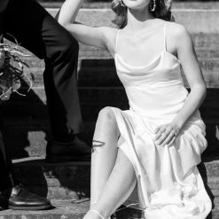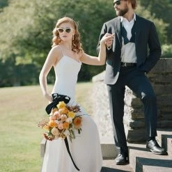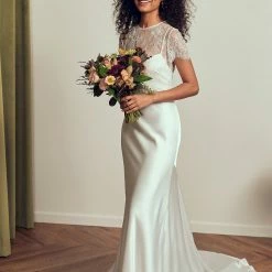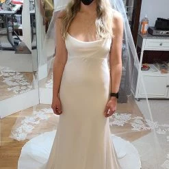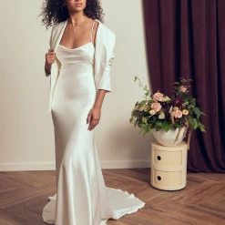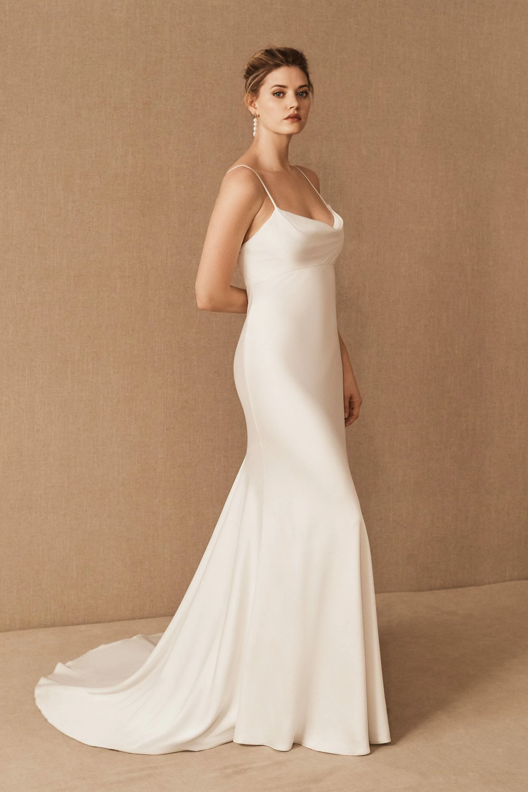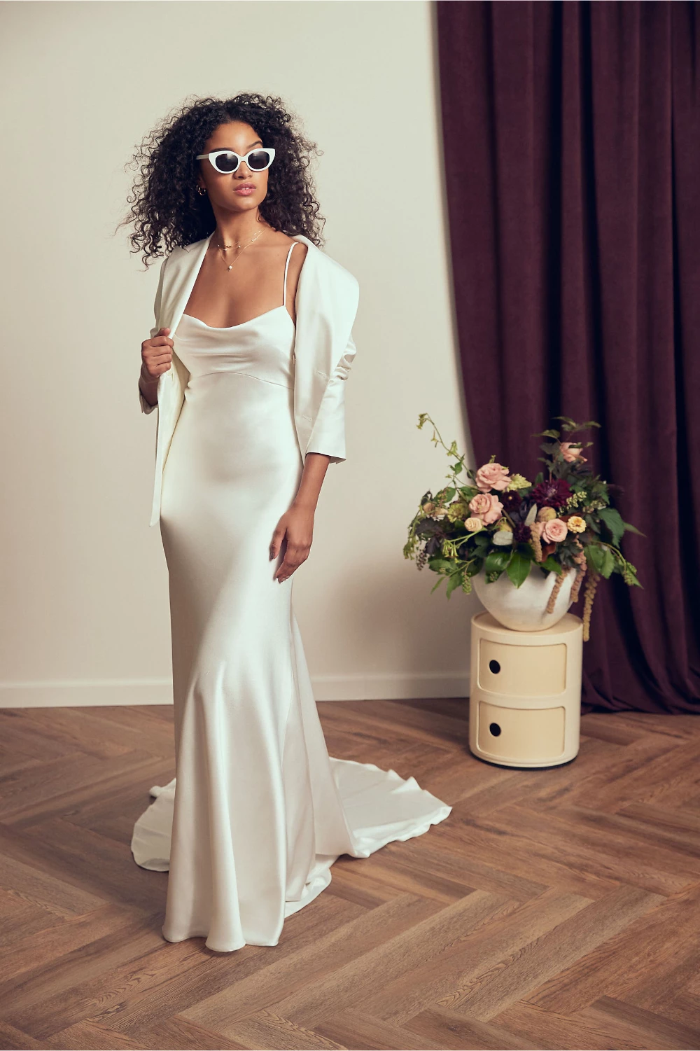 This minimalist satin slip gown is designed for modern brides. Thoughtful details include a soft cowl neckline, empire bust seam, bias-cut skirt, and a back flounce seam that cascades into a flowing train. By Jenny Yoo.