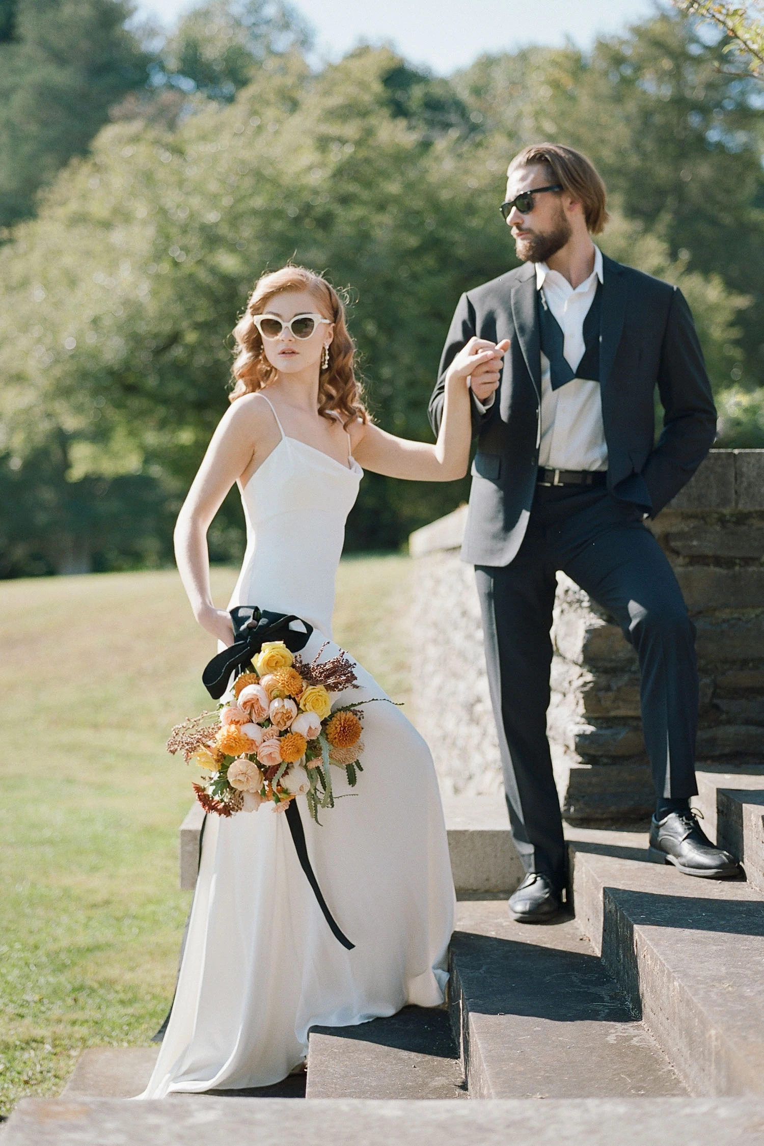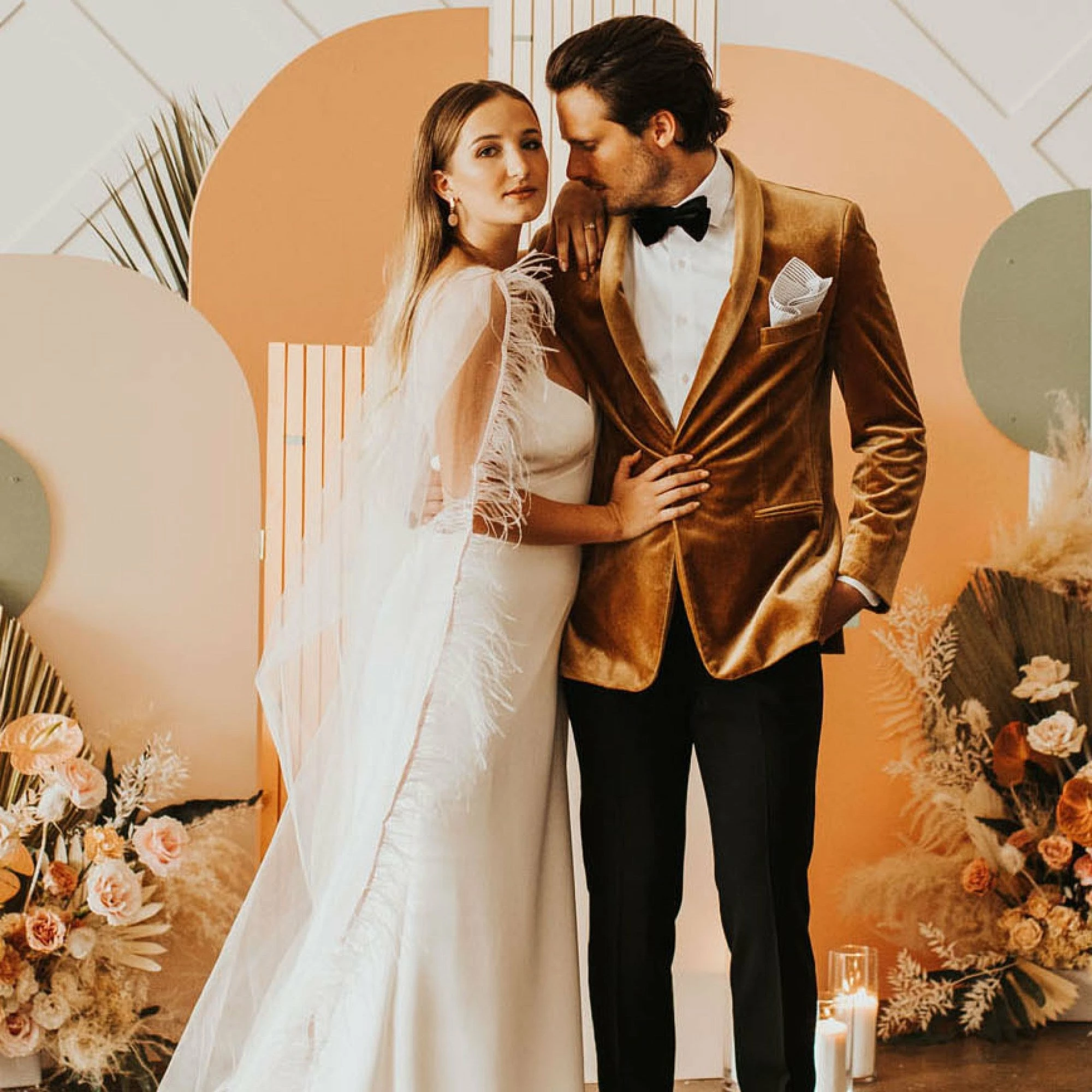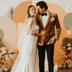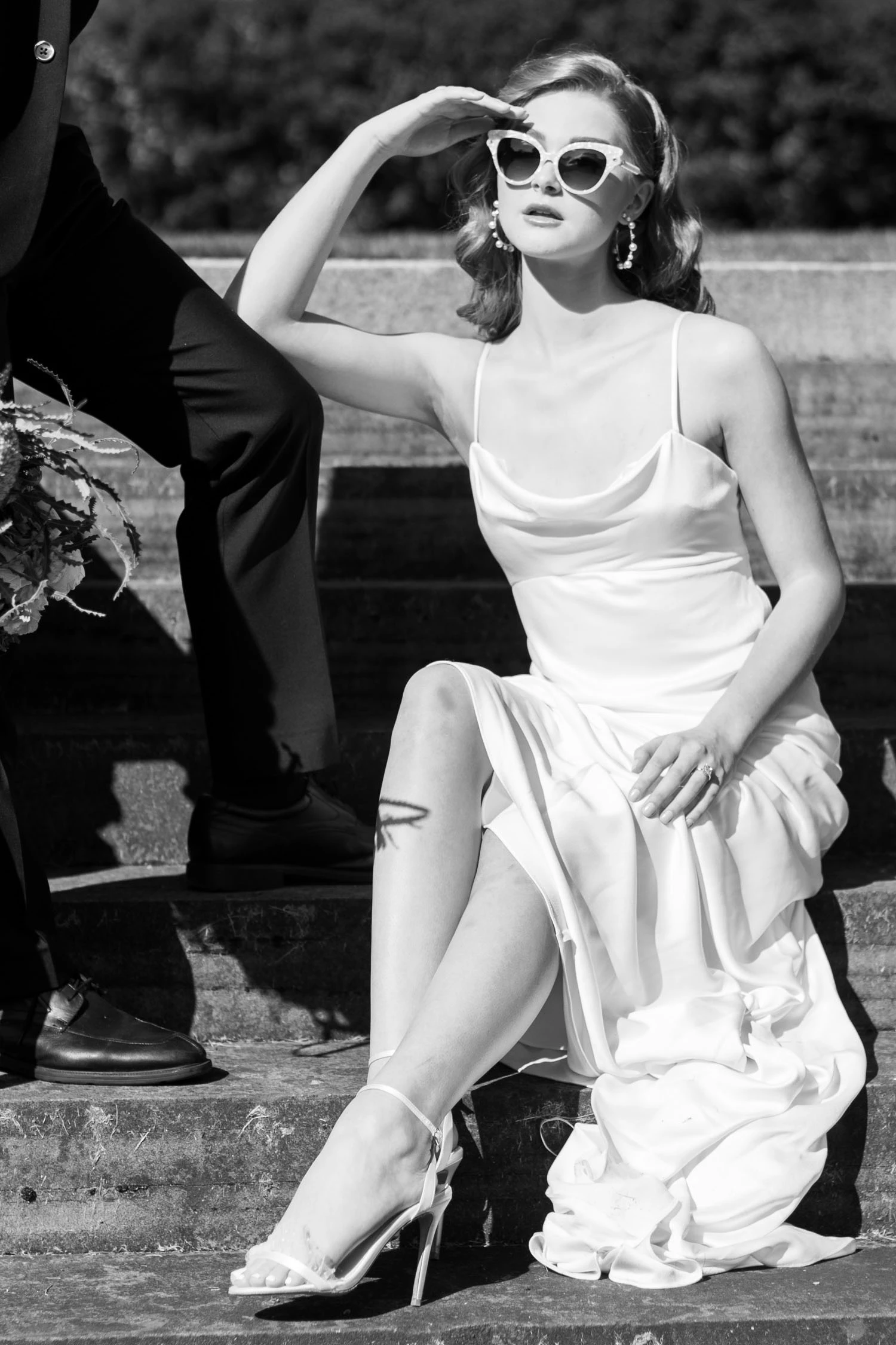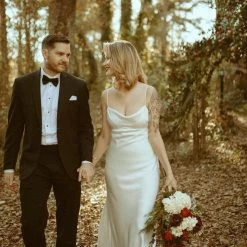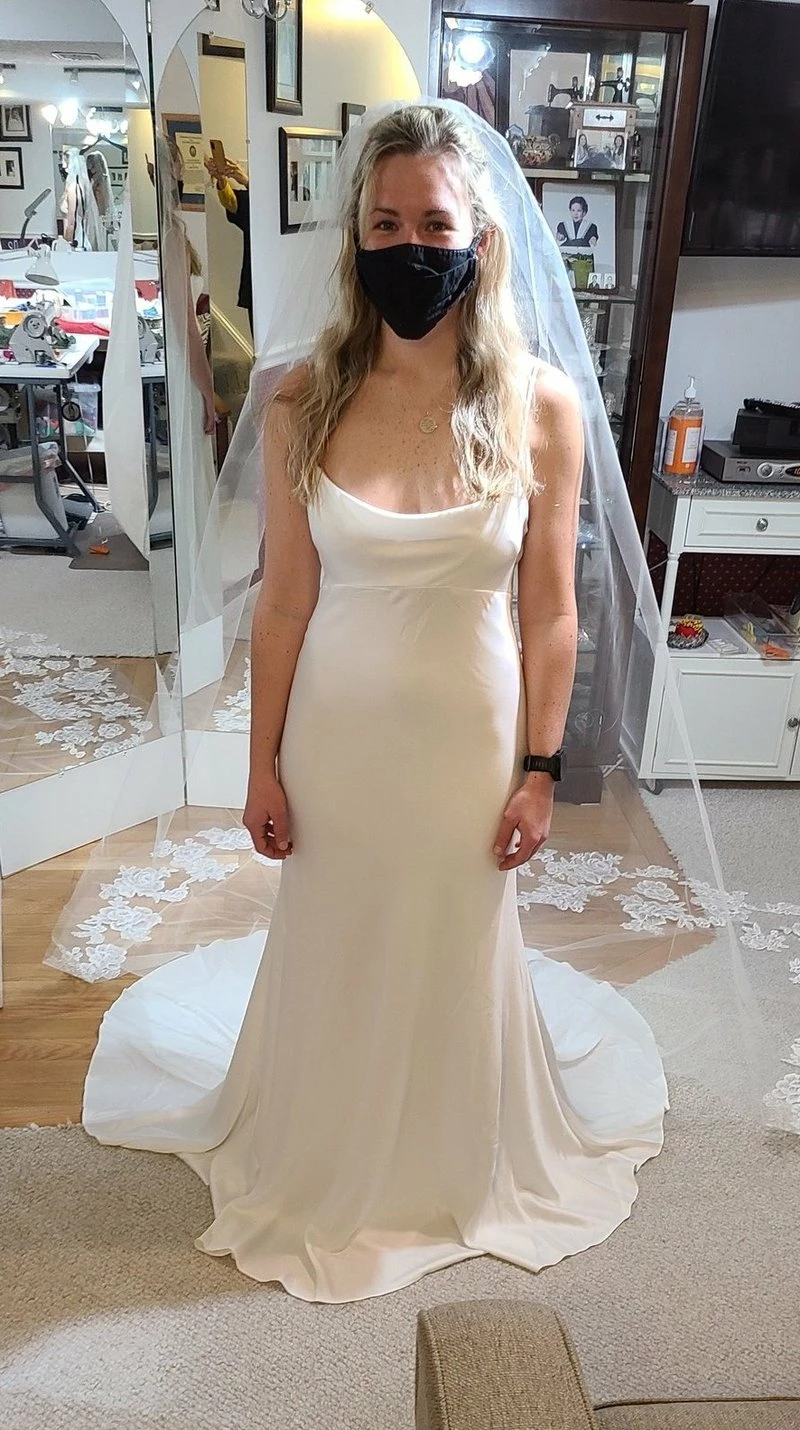 This minimalist satin slip gown is designed for modern brides. Thoughtful details include a soft cowl neckline, empire bust seam, bias-cut skirt, and a back flounce seam that cascades into a flowing train. By Jenny Yoo.