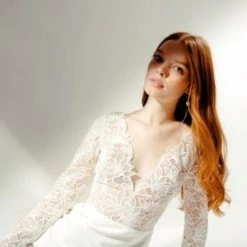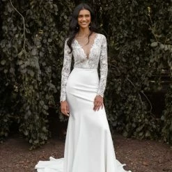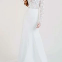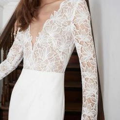 Get lost in the lace of this decadent long sleeve gown while her supple Matte Crepe skirt seals the deal. This elegantly fitted gown features an intricate lace bodice with a plunging neckline and long, sheer sleeves. A tailored crepe skirt lends a modern edge, while scalloped lace trim and a button back provide charming detail. By Jenny Yoo.