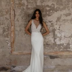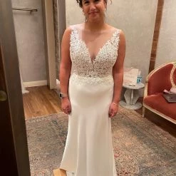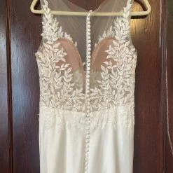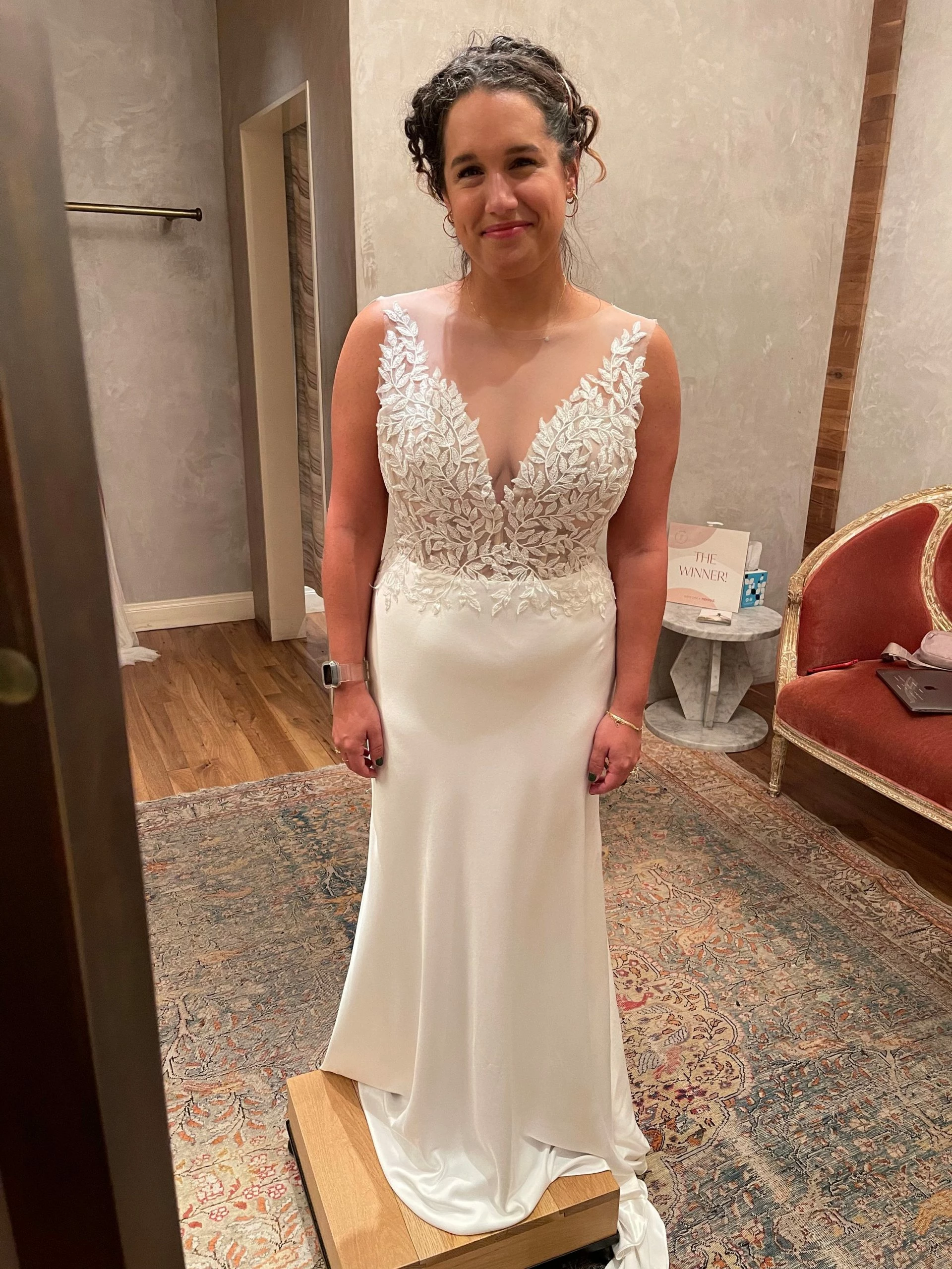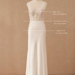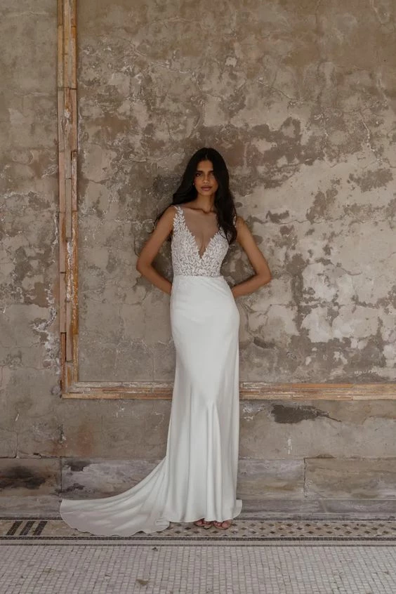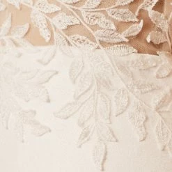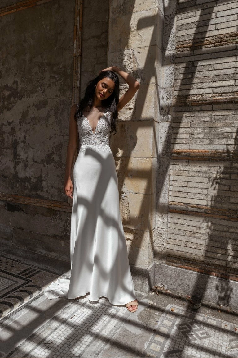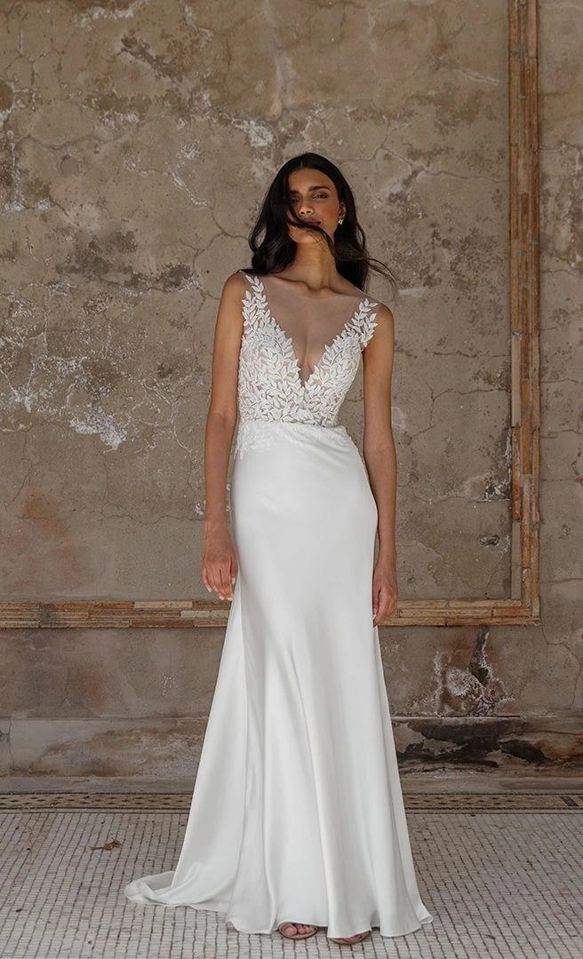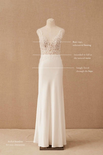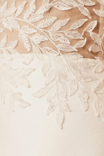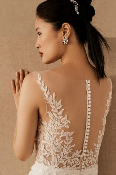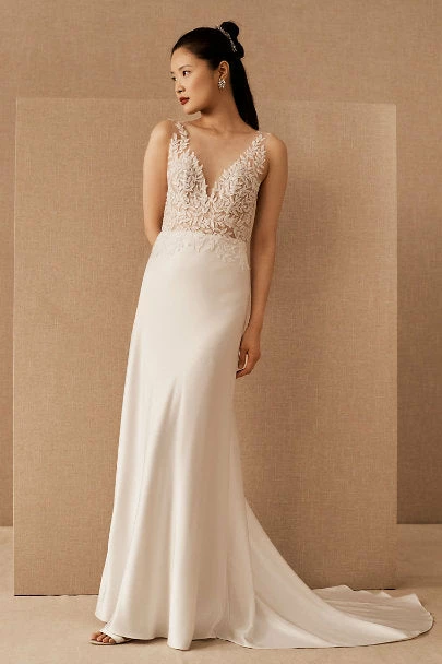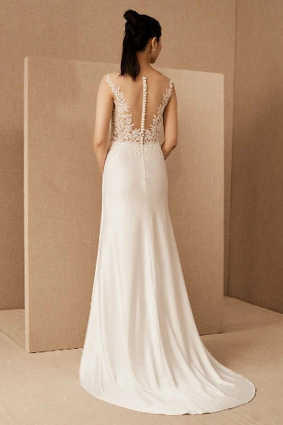 This sophisticated gown features an illusion bodice, accented by botanical appliques and a sheer button back. The bias-cut satin skirt with a chapel-length train makes a sleek finishing touch. By Jenny Yoo.