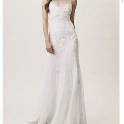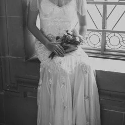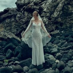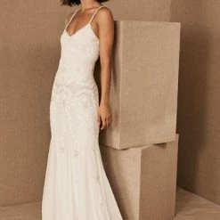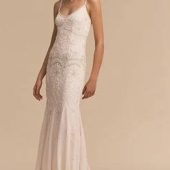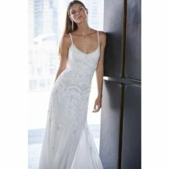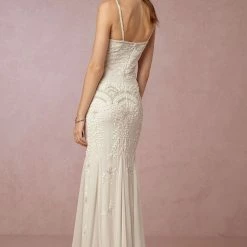 Intricate, deco-inspired beading brings the 1920s to life in this gown. Artfully placed tulle panels that sway with every step add dimension and glamour.