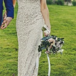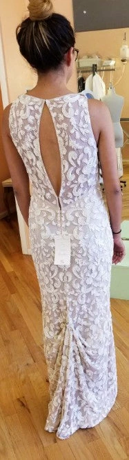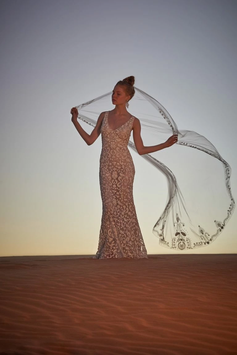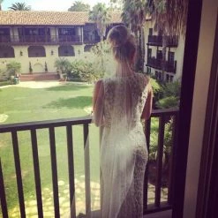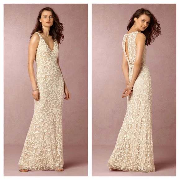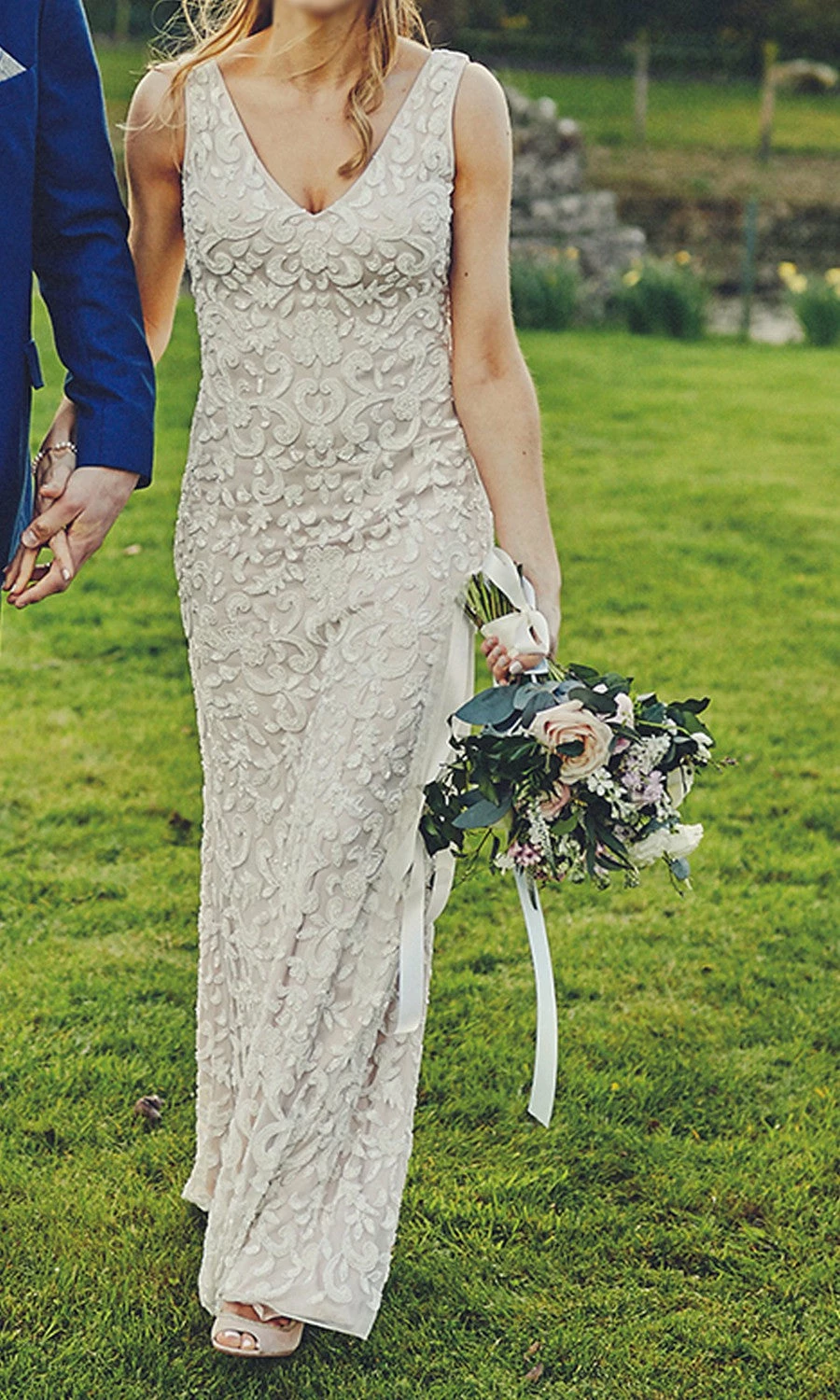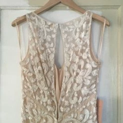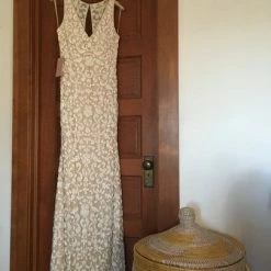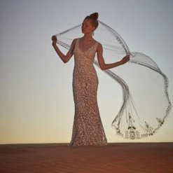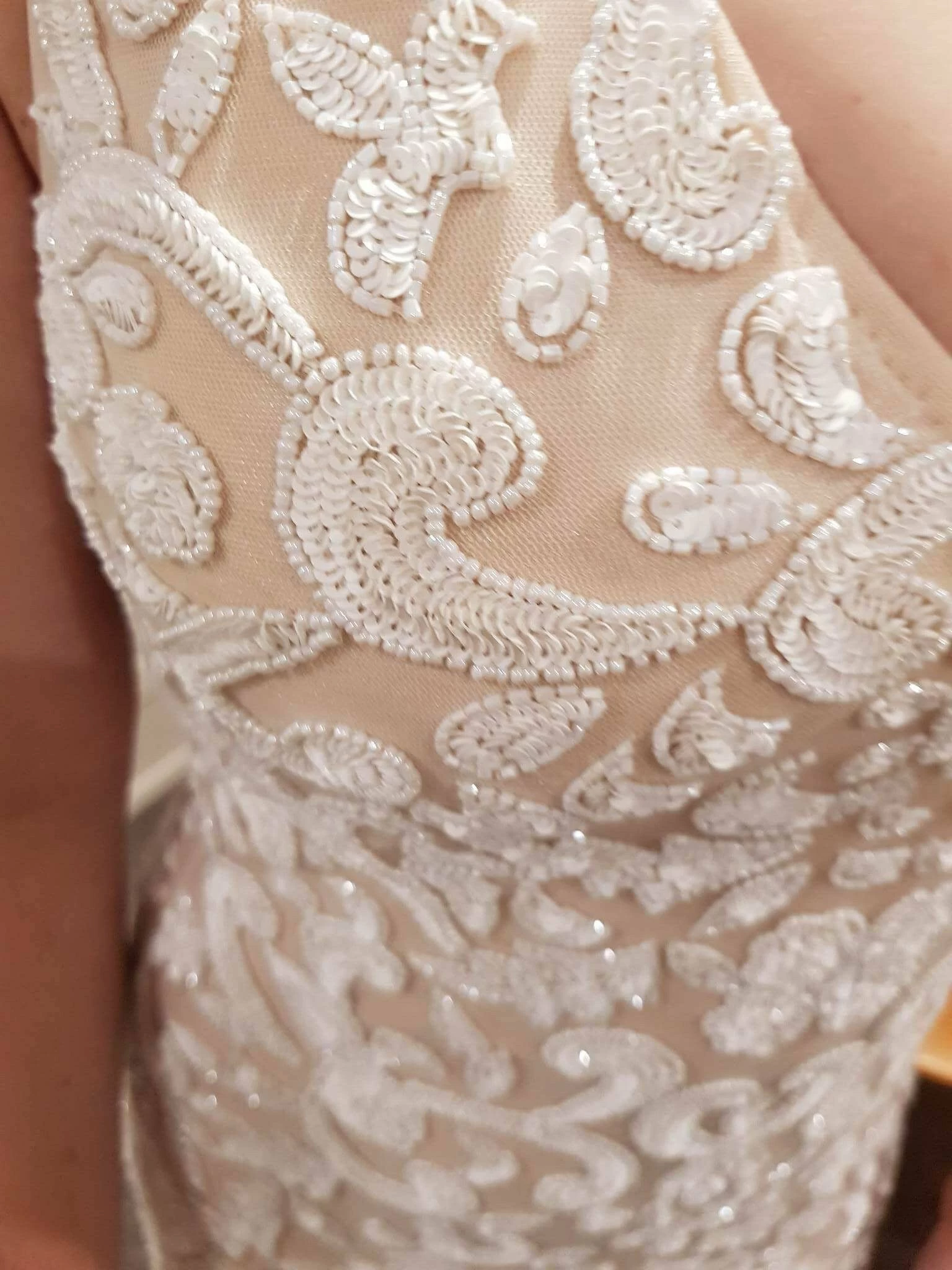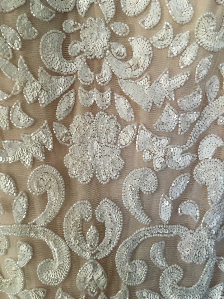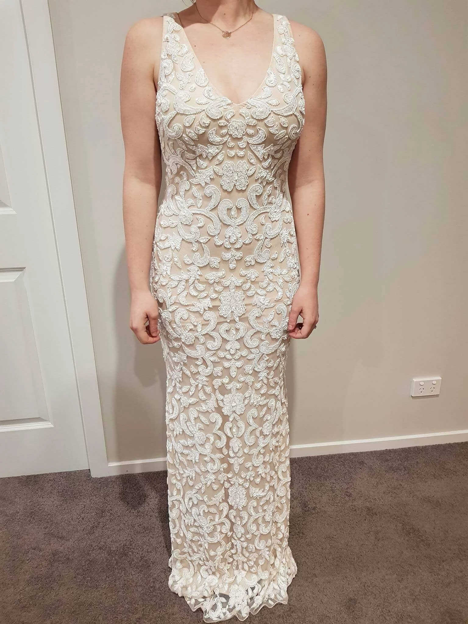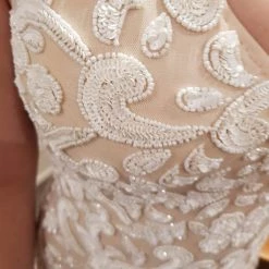 Hand-beaded and complete with a low-v back, this stunning gown is the epitome of both craftsmanship and luxury.