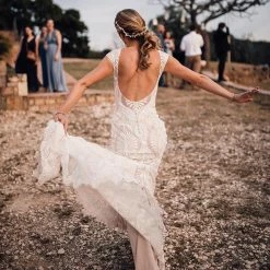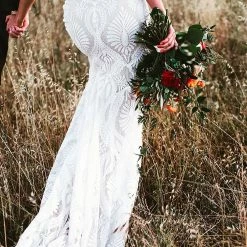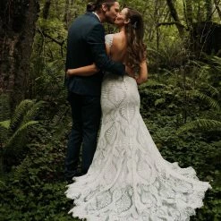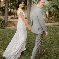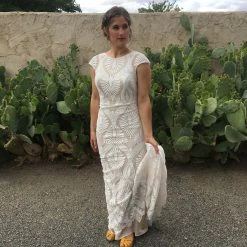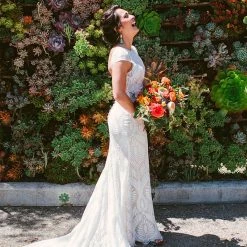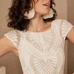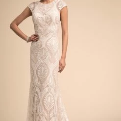 Eye-catching graphic lace lends a modern edge to a traditional bridal look. Cap sleeves and an illusion neckline top off the column silhouette and sweeping train. Tailoring is simplified by a top applied hemline. By BHLDN.