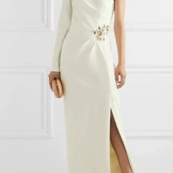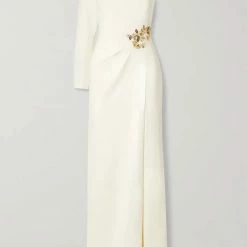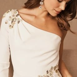 Sparkling embellishments at the shoulder and waist complete this regal gown with a sleek silhouette, one-shoulder neckline, and dramatic side slit. By Marchesa Notte.Â