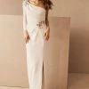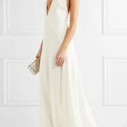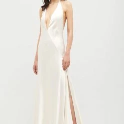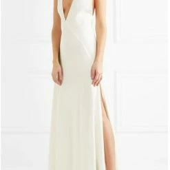 Made from luxurious silk crepe for a richly draped silhouette, this minimalist slip gown features a plunging neckline, strappy open back, and dramatic side slit for a modern look that’s unapologetically glam.
