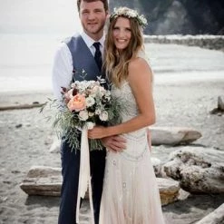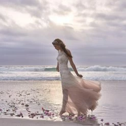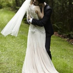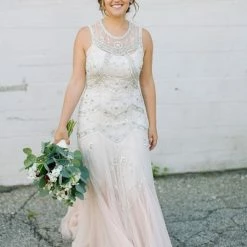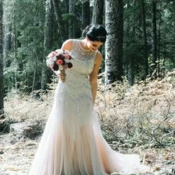US Size 2. Brand new, without tags. May have been tried on in store, but overall it is in like-new condition. Very minor loose threads. This dress is a favorite among brides and has been described as a “magical fairy tale dress”. See pictures in listing of brides rocking this beautiful gown!Â