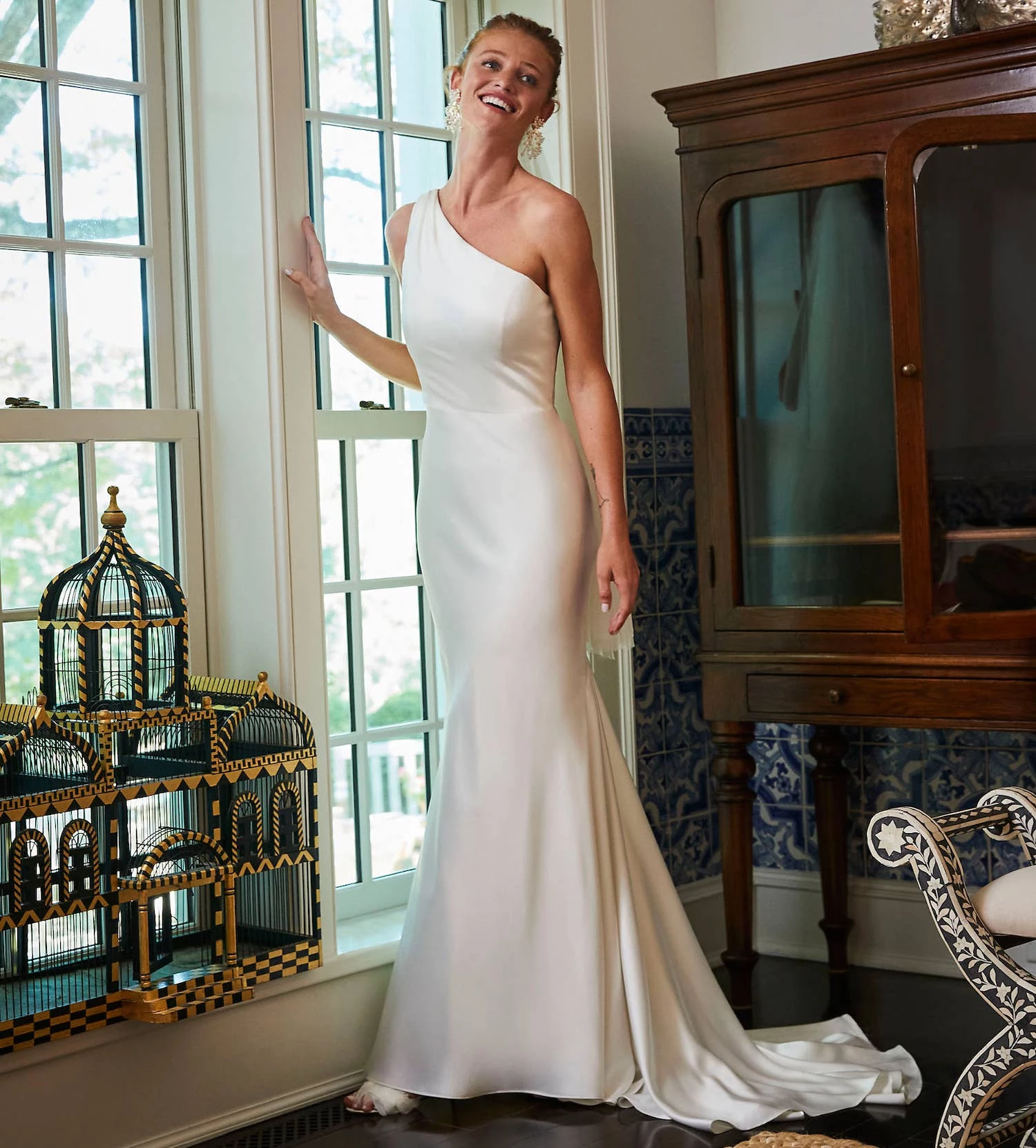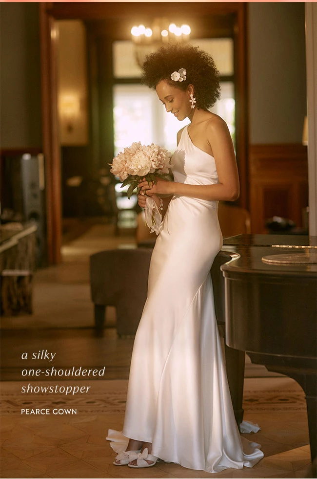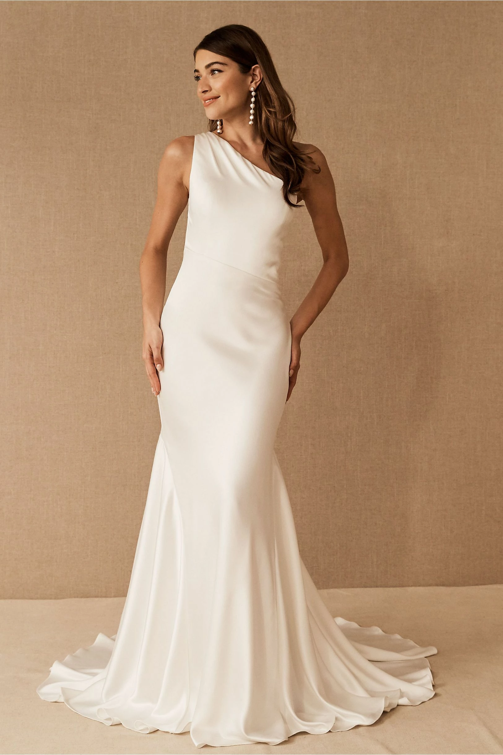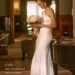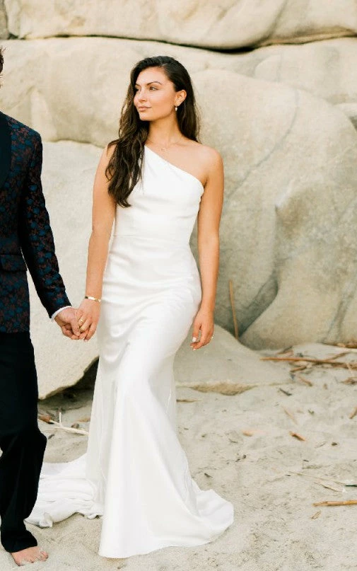 Sleek and silky, this elegantly minimalist gown features a flowing silhouette and modern one-shoulder neckline for the perfect balance of dynamic movement and timeless glamour. By Nouvelle Amsale.