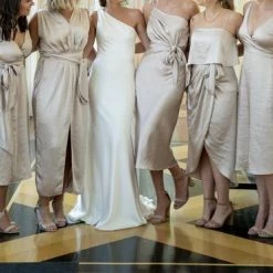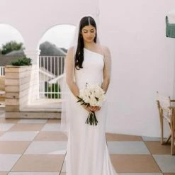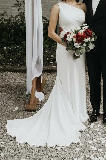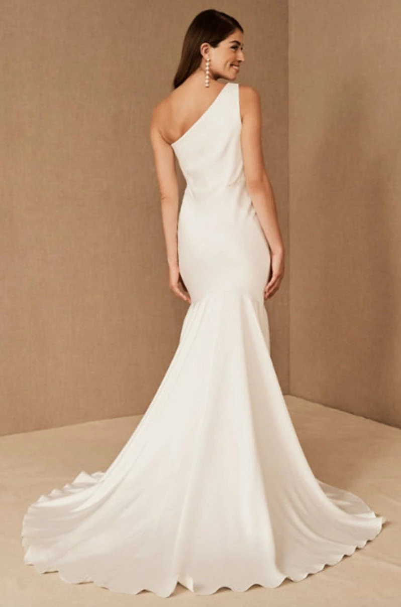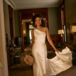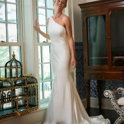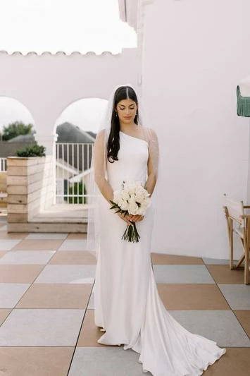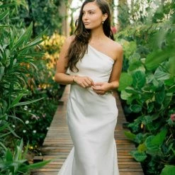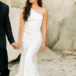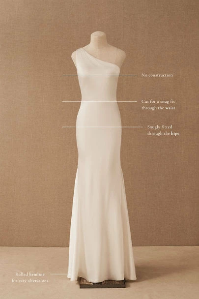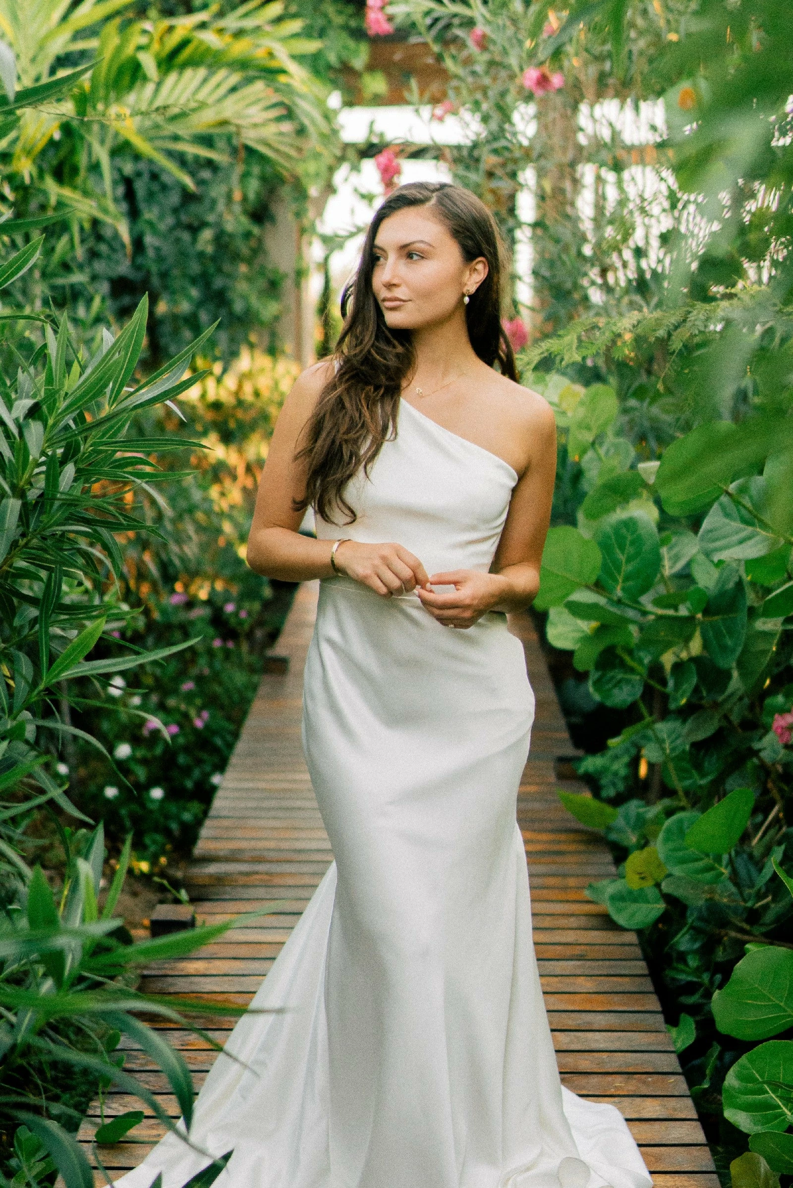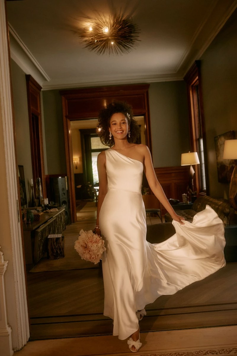 Sleek and silky, this elegantly minimalist gown features a flowing silhouette and modern one-shoulder neckline for the perfect balance of dynamic movement and timeless glamour. By Nouvelle Amsale.