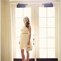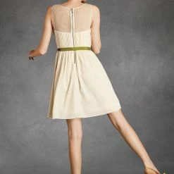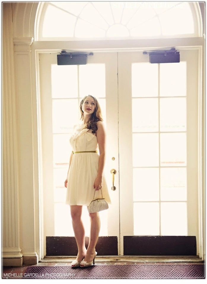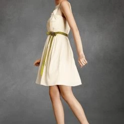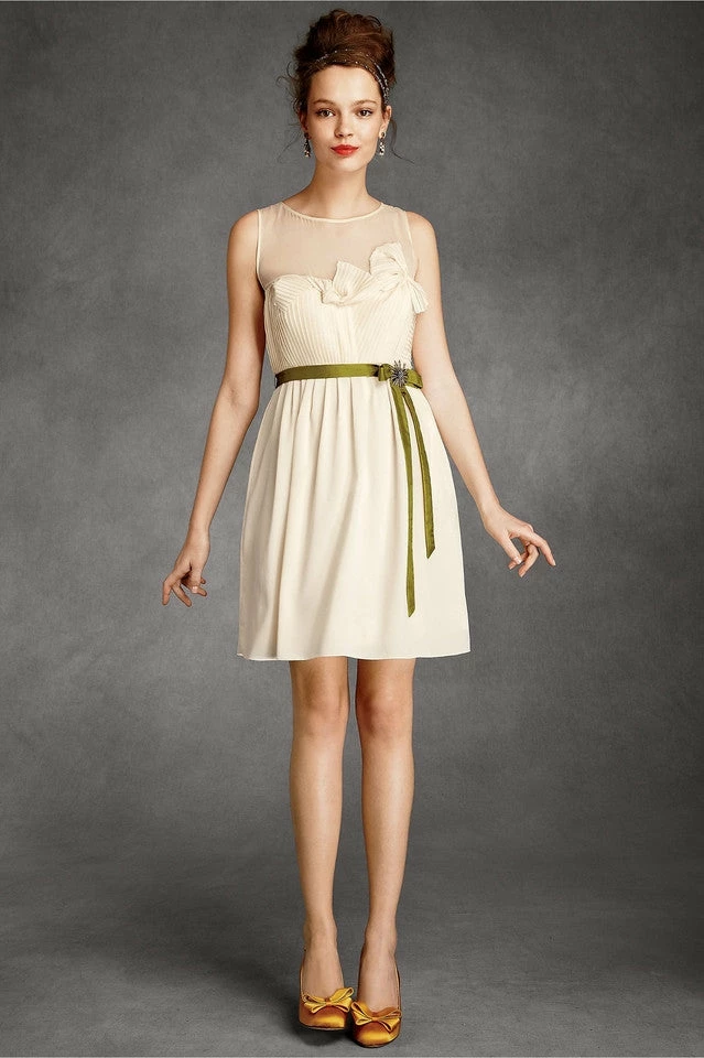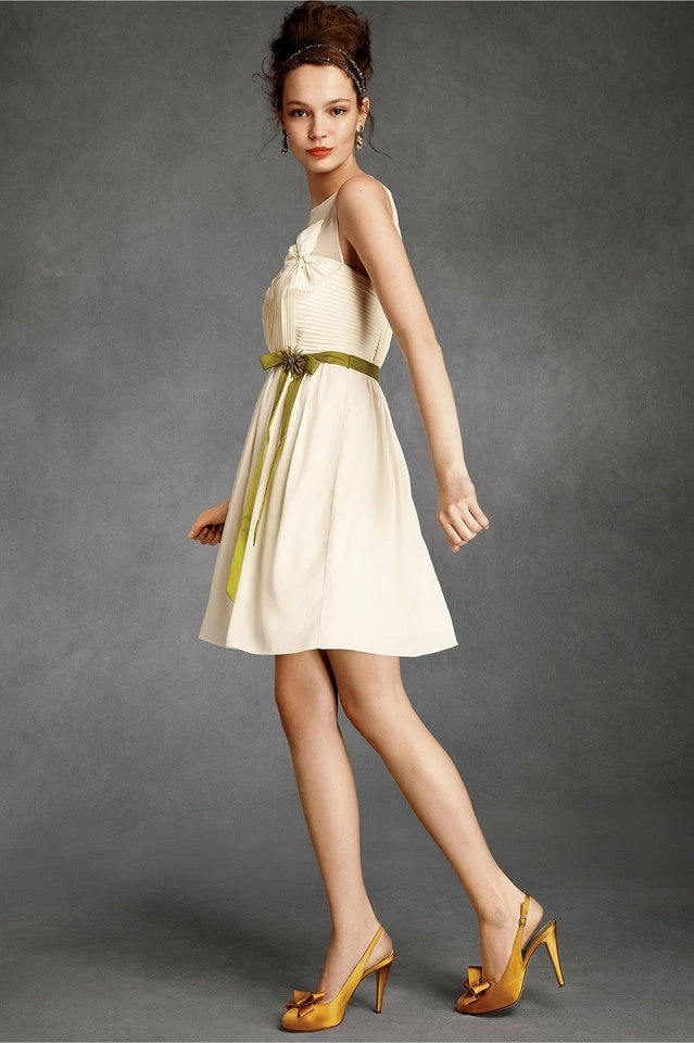 The removable sash offers a pretty pop of color above the not-quite-knee-grazing skirt.