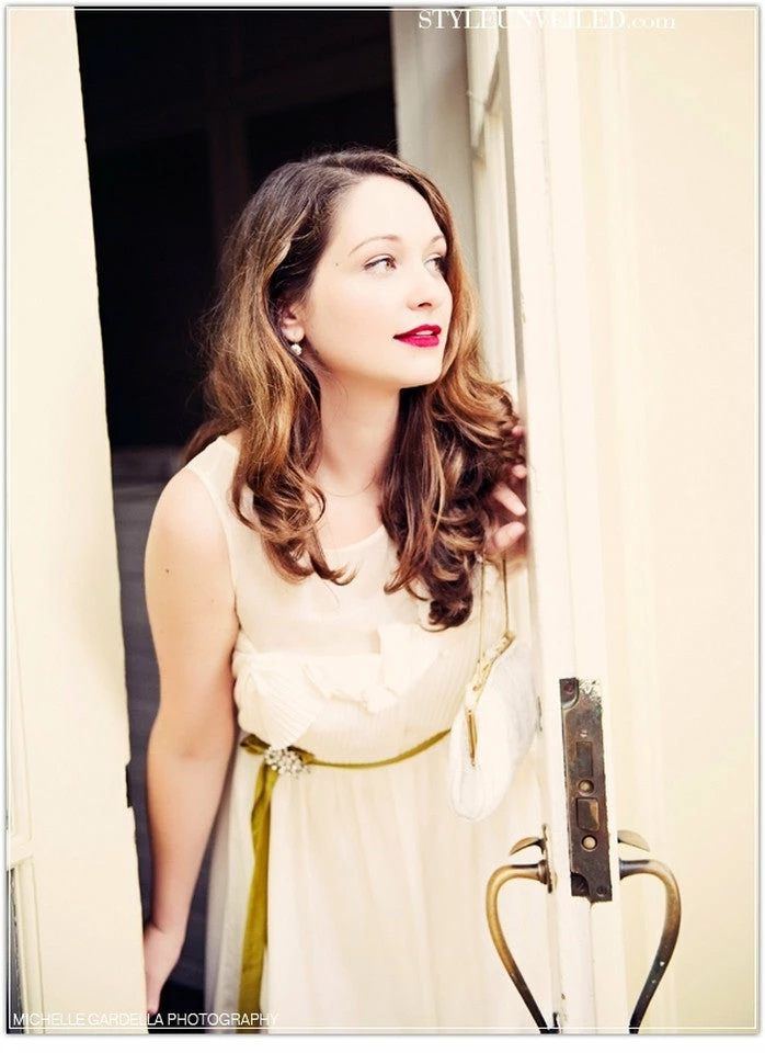 For rehearsal dinners, cutting the cake or for the big ‘do itself, we present creamy crepe tucked and folded into dimensional detailing below a chiffon neckline.