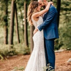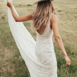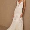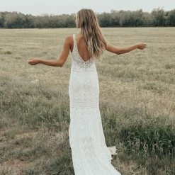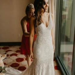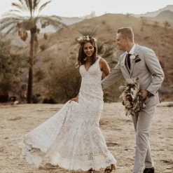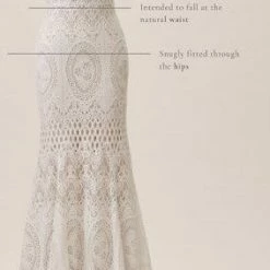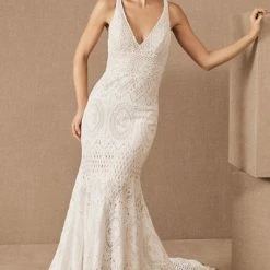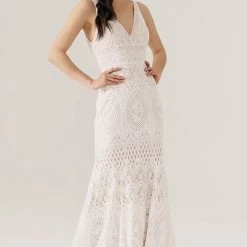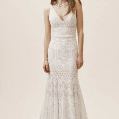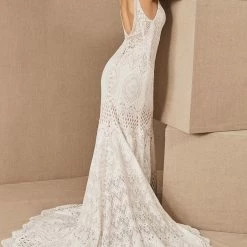 With a plunge neckline and body-hugging silhouette, this sultry gown is finished with a long row of covered buttons and a sweeping train. A stretch lining and bold medallion lace placed just-so make it endlessly flattering.Â