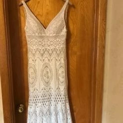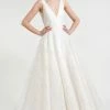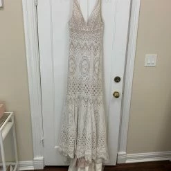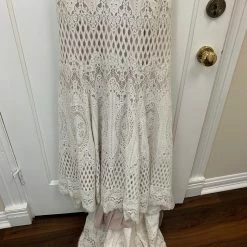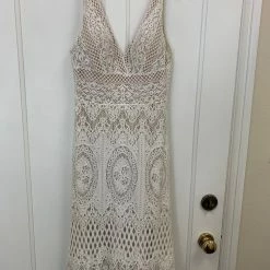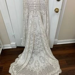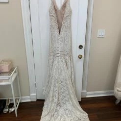 Size 14. Sample gown that has been tried on in store. Missing four buttons from the top. The dress has buttons all the way down the back, so you can use some of the lower ones to replace the missing ones. A few of the button loops in the back are stretched a bit. This is an easy fix for any seamstress (or can be left as is). Minor dust along the hemline. Retail price: $1,200!