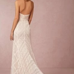 With a plunge neckline and body-hugging silhouette, this sultry gown is finished with a long row of covered buttons and a sweeping train. A stretch lining and bold medallion lace placed just-so make it endlessly flattering.Â