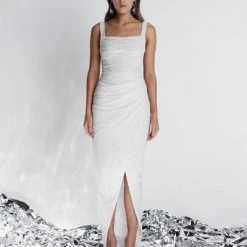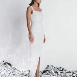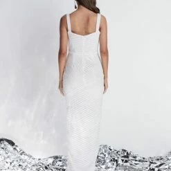 This Rachel Gilbert Pippin beaded gown features sequin detailing with an asymmetric open front hemline and a sleeveless silhouette. Hand embellished gown with wrap cross-over skirt.