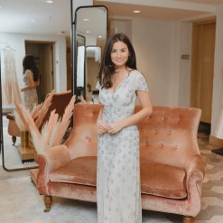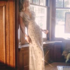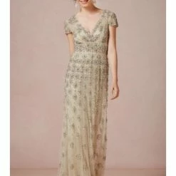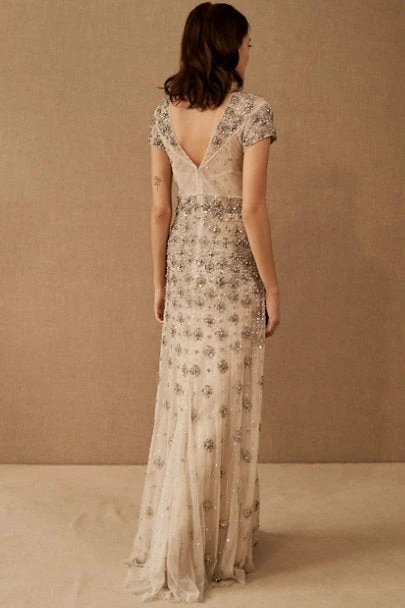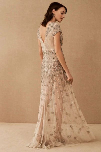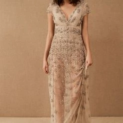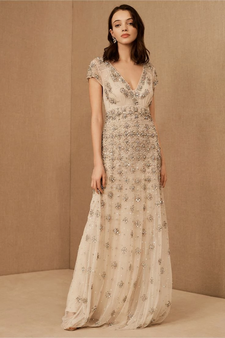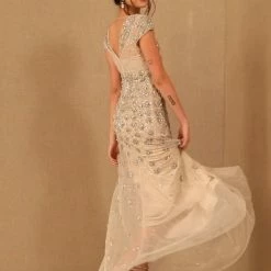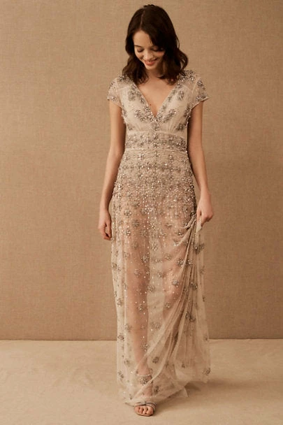 Dazzling beadwork covers this cap sleeve gown for a breathtakingly glamorous look with a touch of vintage appeal. Wear with the silk lining for timeless style, or pair the sheer outer layer with a bodysuit for a daring ensemble. By Ranna Gill.