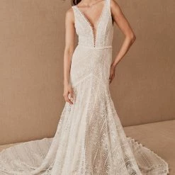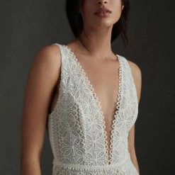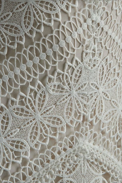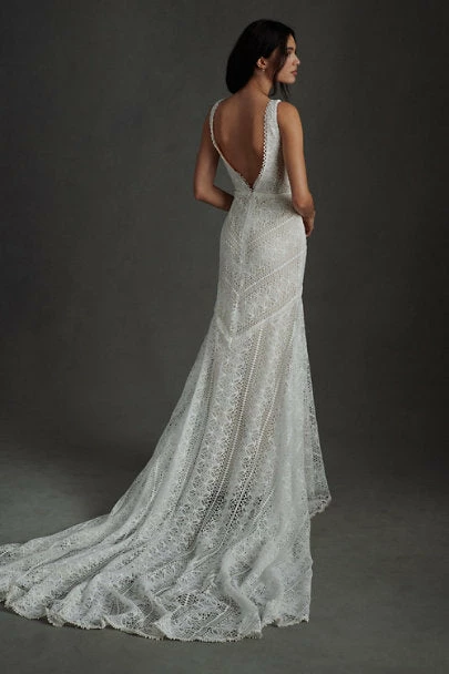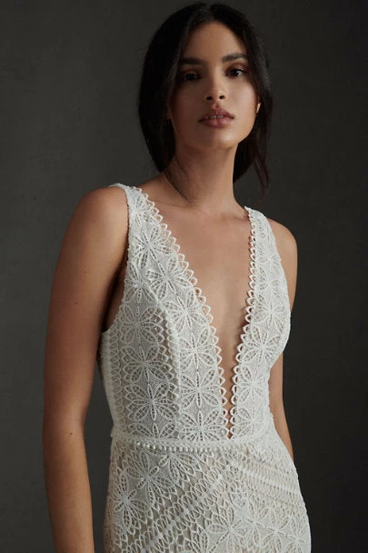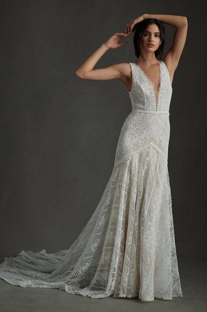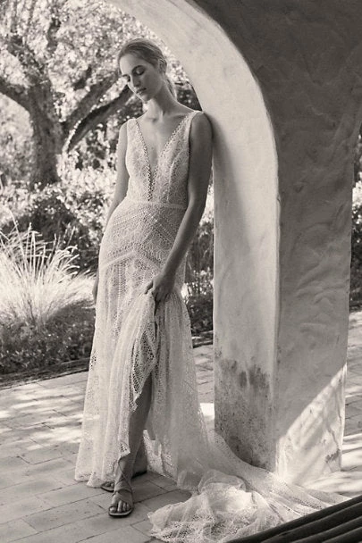Awaken your inner bohemian bride in this knitted crochet silhouette, complete with a plunging illusion neckline and a daring open back. A sweeping train evokes an ethereal-yet-dramatic appeal, adding romance at every turn. By BHLDN.