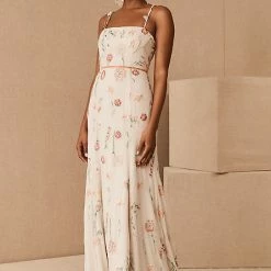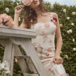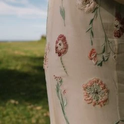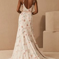 A bohemian beauty, this gown’s simply fitted silhouette lets its vibrant details shine. Colorful floral embroidery uses a variety of threadwork techniques to create depth and texture, accented by delicate beading. Whimsical embroidered straps and a slim velvet ribbon belt complete the look.