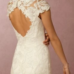 This stretch lace gown, with bold back keyhole and sweeping train, puts drama at the forefront without losing a drop of romance.
