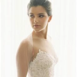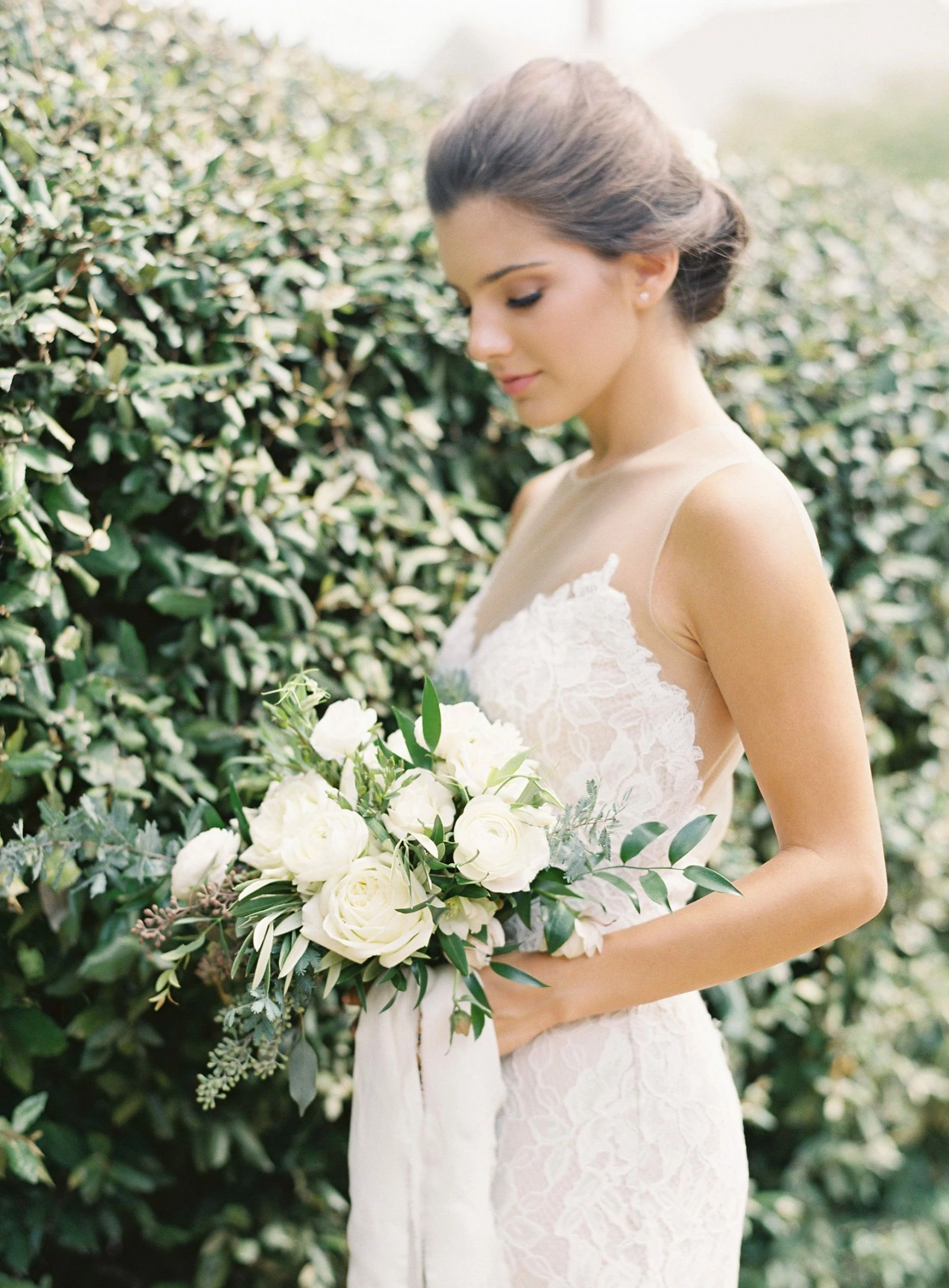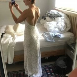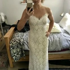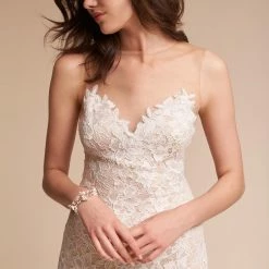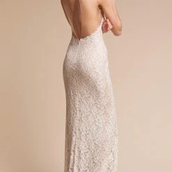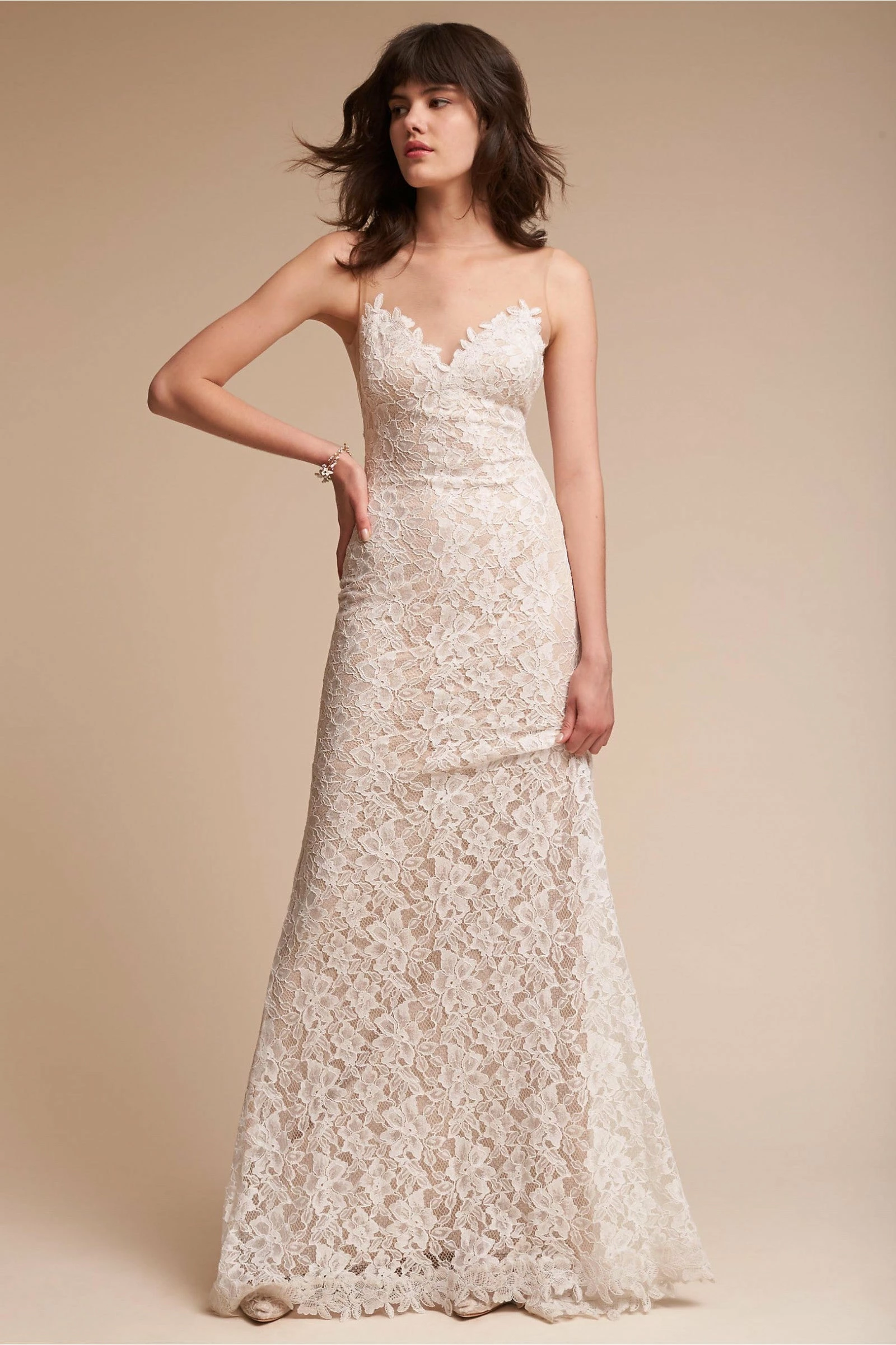 This understated column gown is fashioned entirely from intricate floral lace. An illusion bodice and plunging back (which features a sheer keyhole detail) brings a modern edge while a slight train finishes the look.