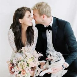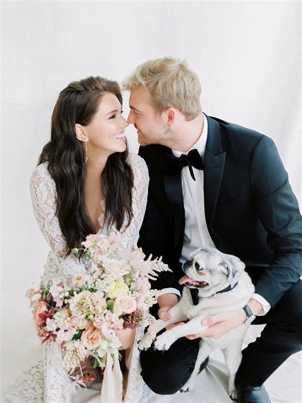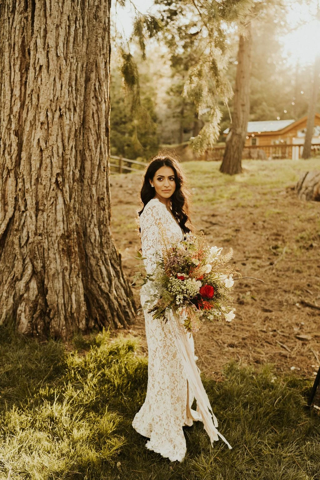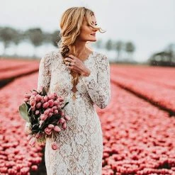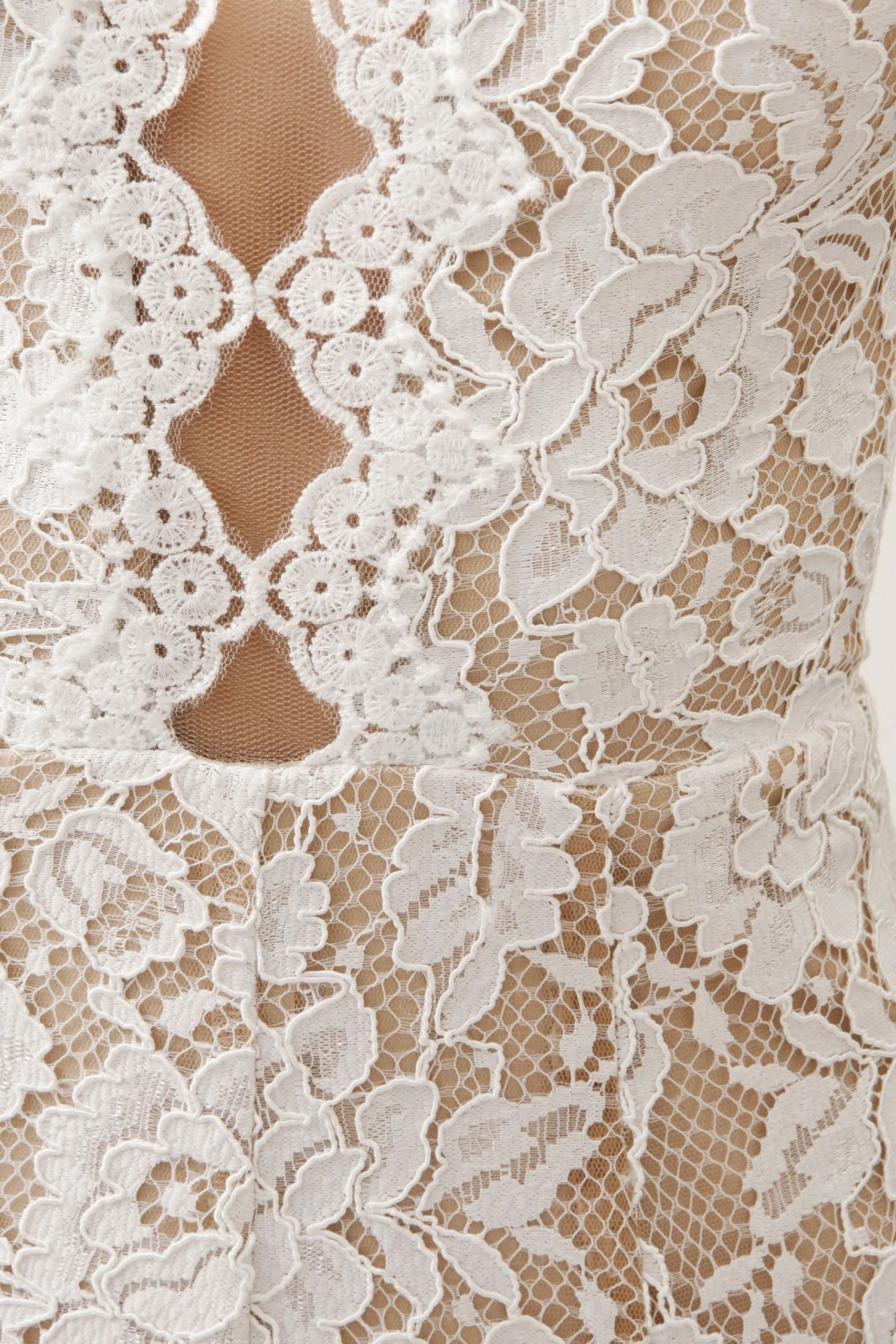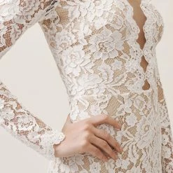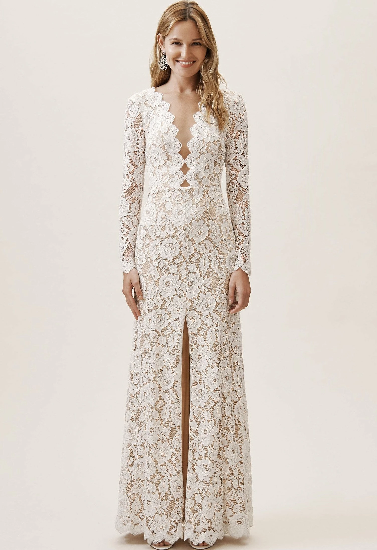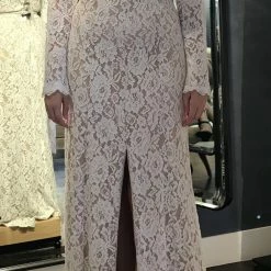 This bohemian gown is made from allover lace with ample stretch, balancing ease of wear with beautifully romantic style. The plunging neckline is finished with an illusion tulle panel, while a center slit in the skirt makes it easy to dance all night. Tailoring is simplified by a top applied hemline.