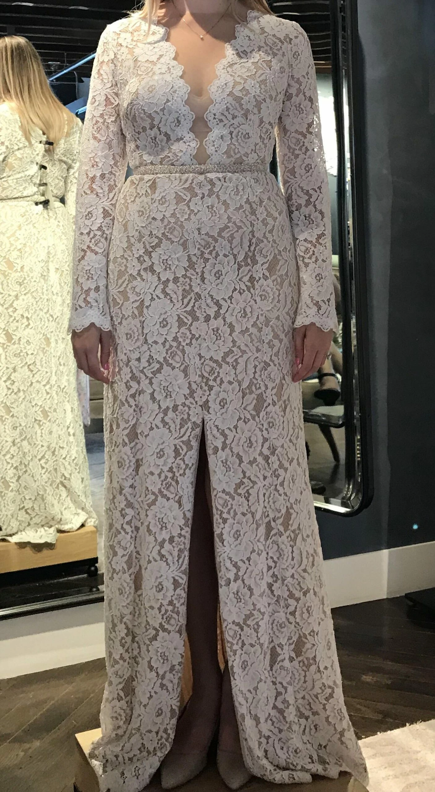 Size 4 and 14. Tried on in store, but never worn outside the salon and never altered. Minor dust along the hemline. Otherwise in very good condition. Retail price: $750.