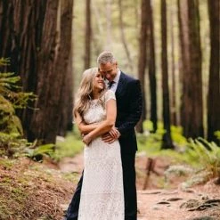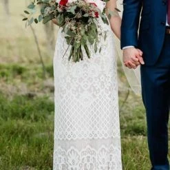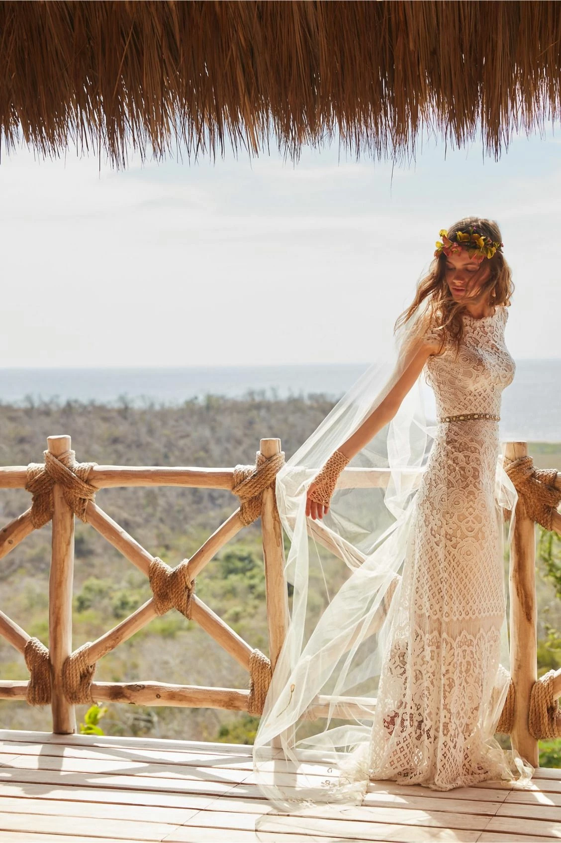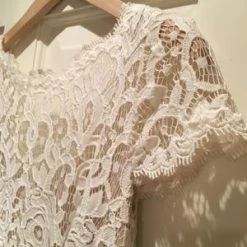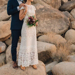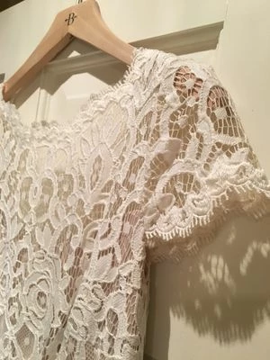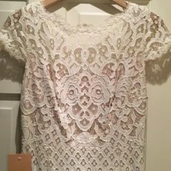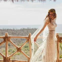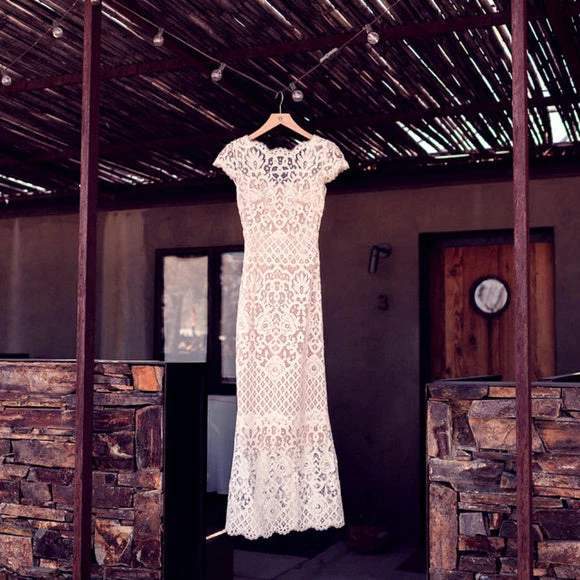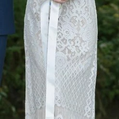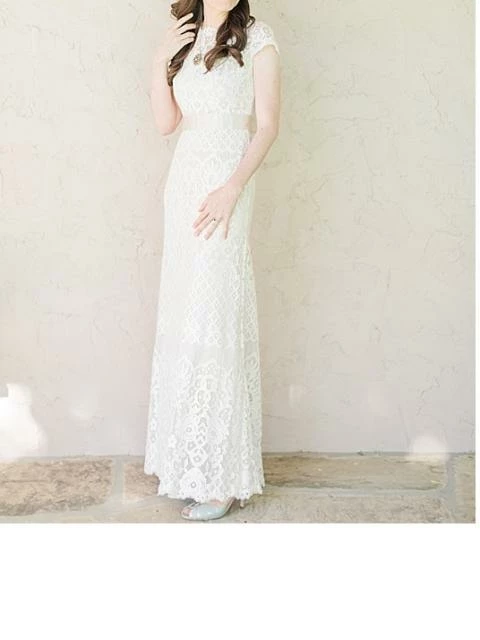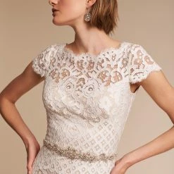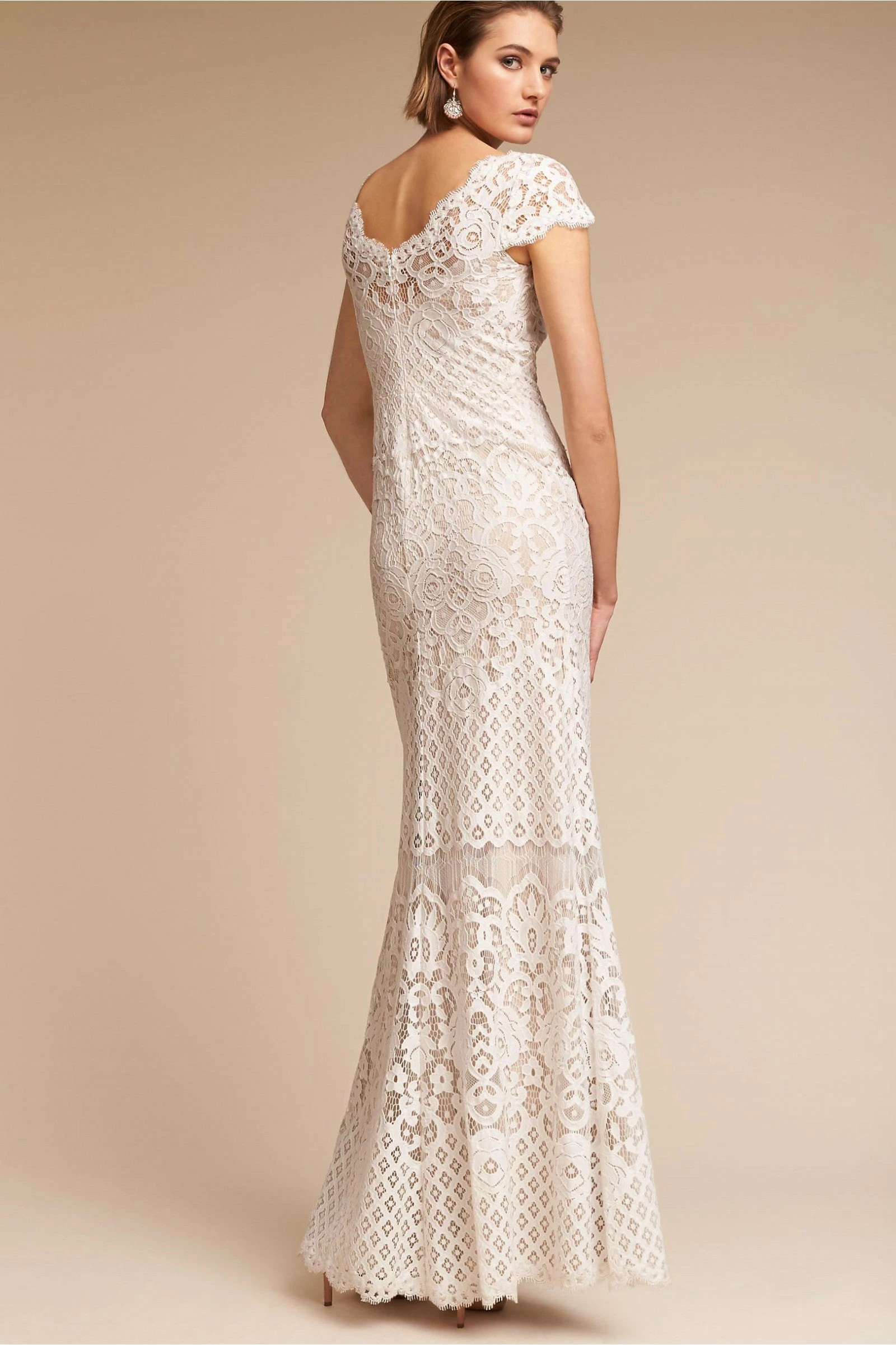 A beautiful example of drama and ease working hand in hand, this gown commands attention with bold, graphic lace and a fitted silhouette. Demure cap sleeves accent the high neckline and illusion detailing. By Tadashi Shoji.
