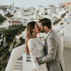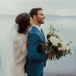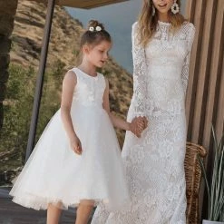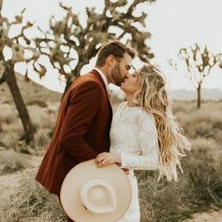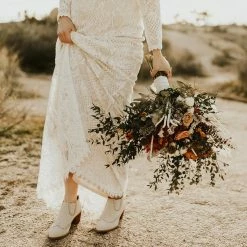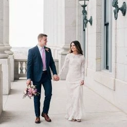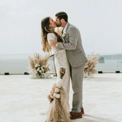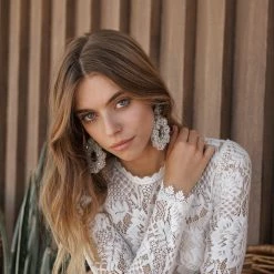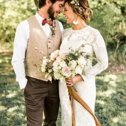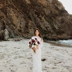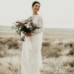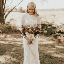 With a high-neckline and illusion detail down the long-sleeves, this lace column gown is a true showstopper. The Tenley Gown is adorned with all over graphic lace + paired with a romantic silhouette. This gown is a bohemian bride’s dream. By Tadashi Shoji.