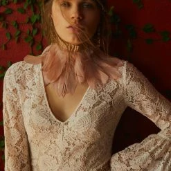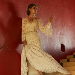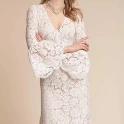 Theia Harbor is a chic lacy gown with a V neckline, column silhouette, and dramatic bell sleeves! This gown comes to us in great condition from a designer boutique. Constructed entirely of floral lace, this gown balances a deep v-neck with long bell sleeves and a floor-skimming train. The result: a romantic 70s vibe that feels perfect for right now. By Theia.