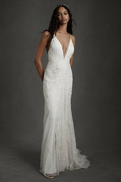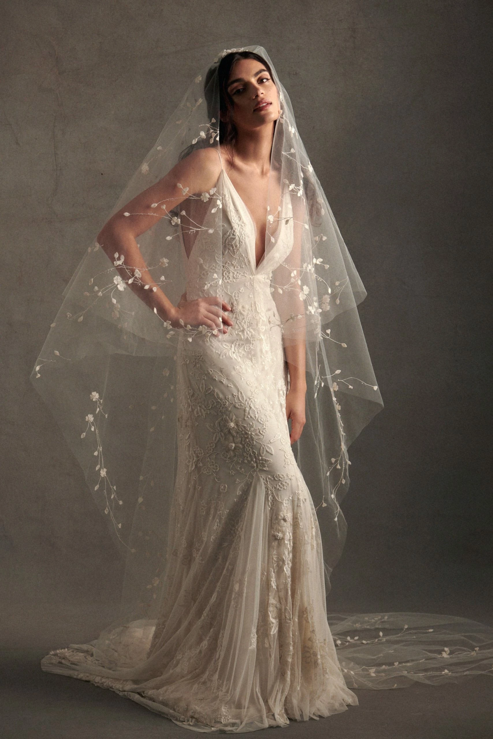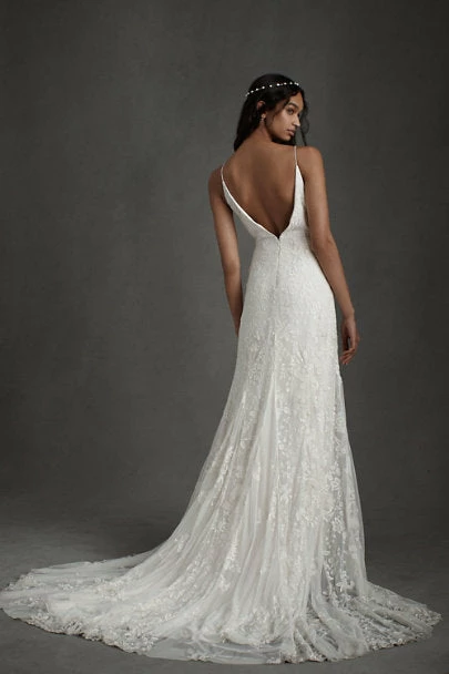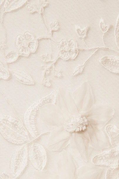 Dripping with floral embroidery and dimensional organza applique work, this tulle gown is endlessly romantic. A plunging neckline and low back lend the bodice its sultry silhouette, while a full train makes a dramatic finishing flourish. By BHLDN.