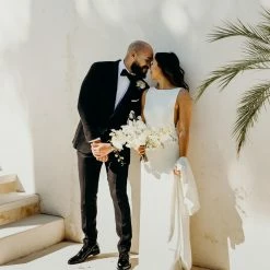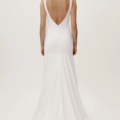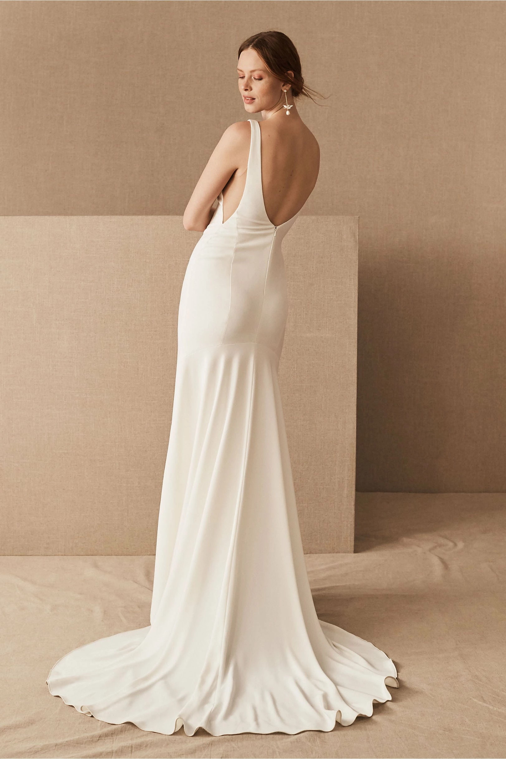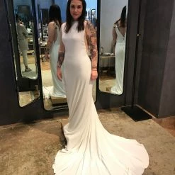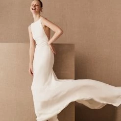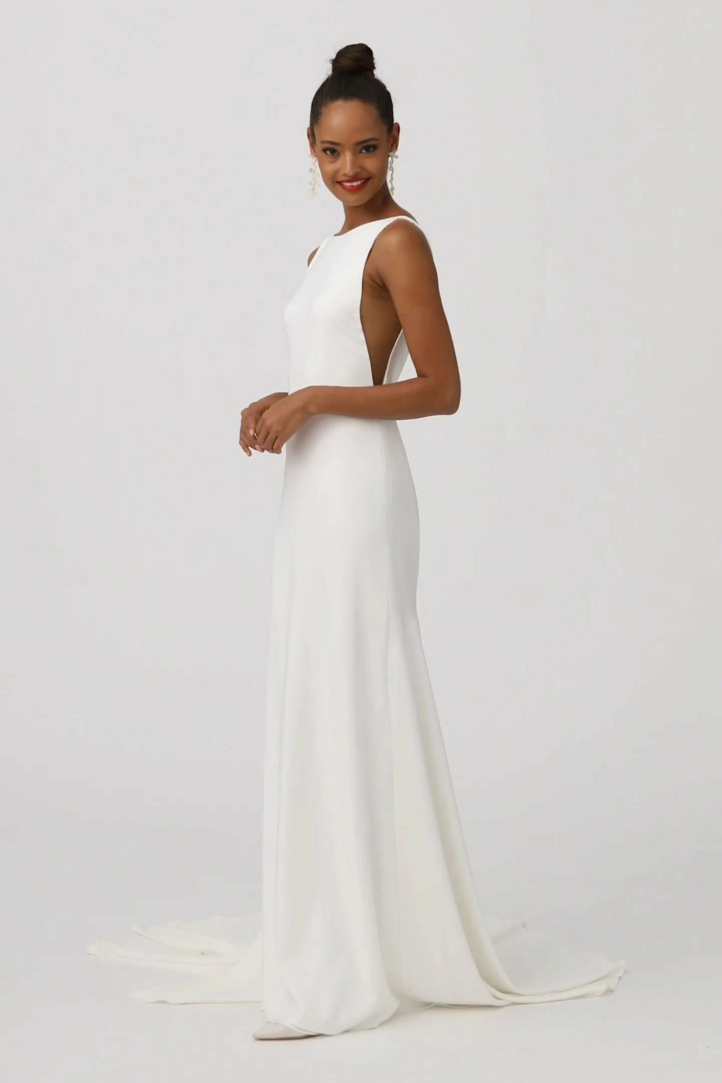 A plunging back and sheer mesh panels lend a sultry vibe to this sleek crepe sheath. With a high-neckline and a figure-flattering fit, it’s minimalism at its best. By Watters Bride.