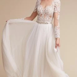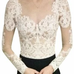 Artfully placed lace swirls create a head-turning silhouette in this stunning one-piece. Scalloped at the wrist, long illusion lace sleeves resemble dainty vines for an organic quality.Â