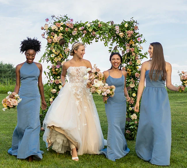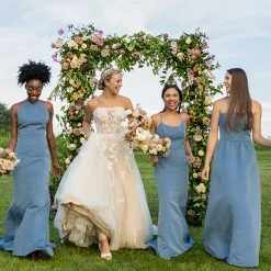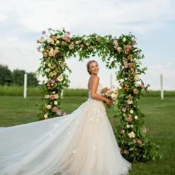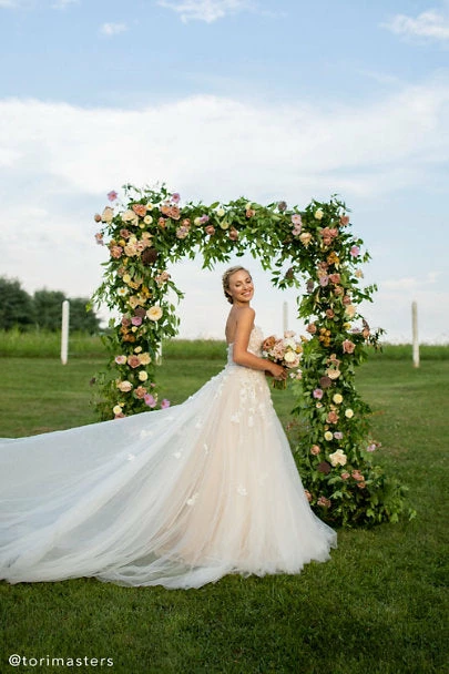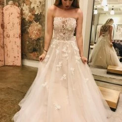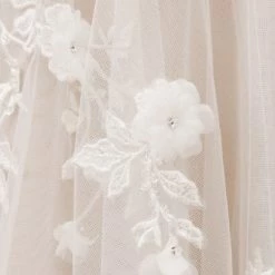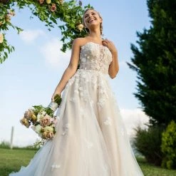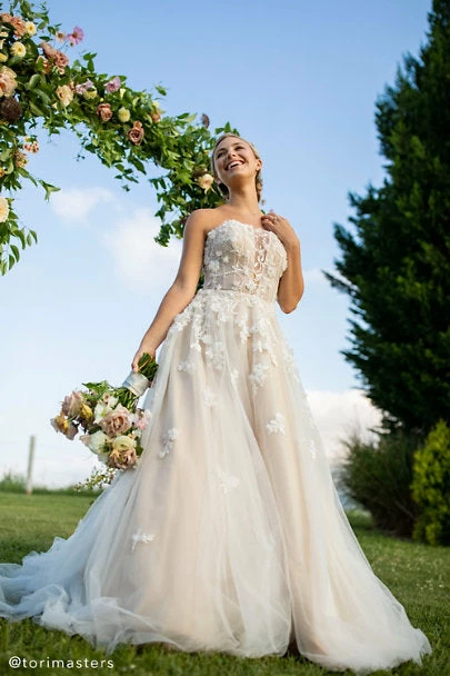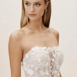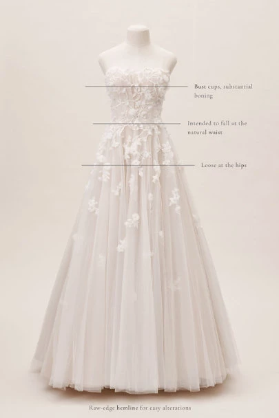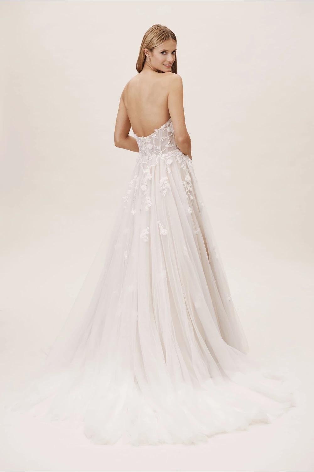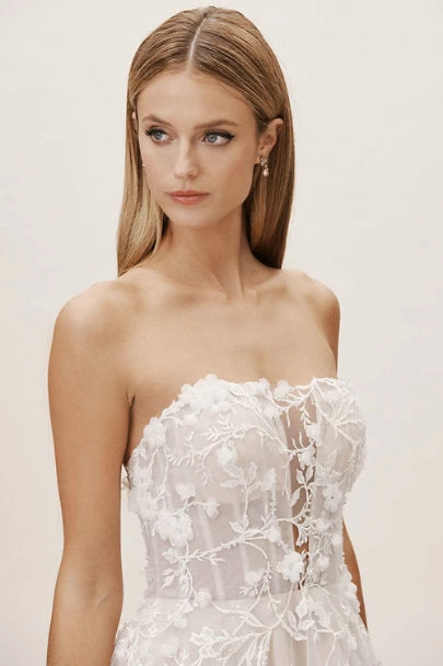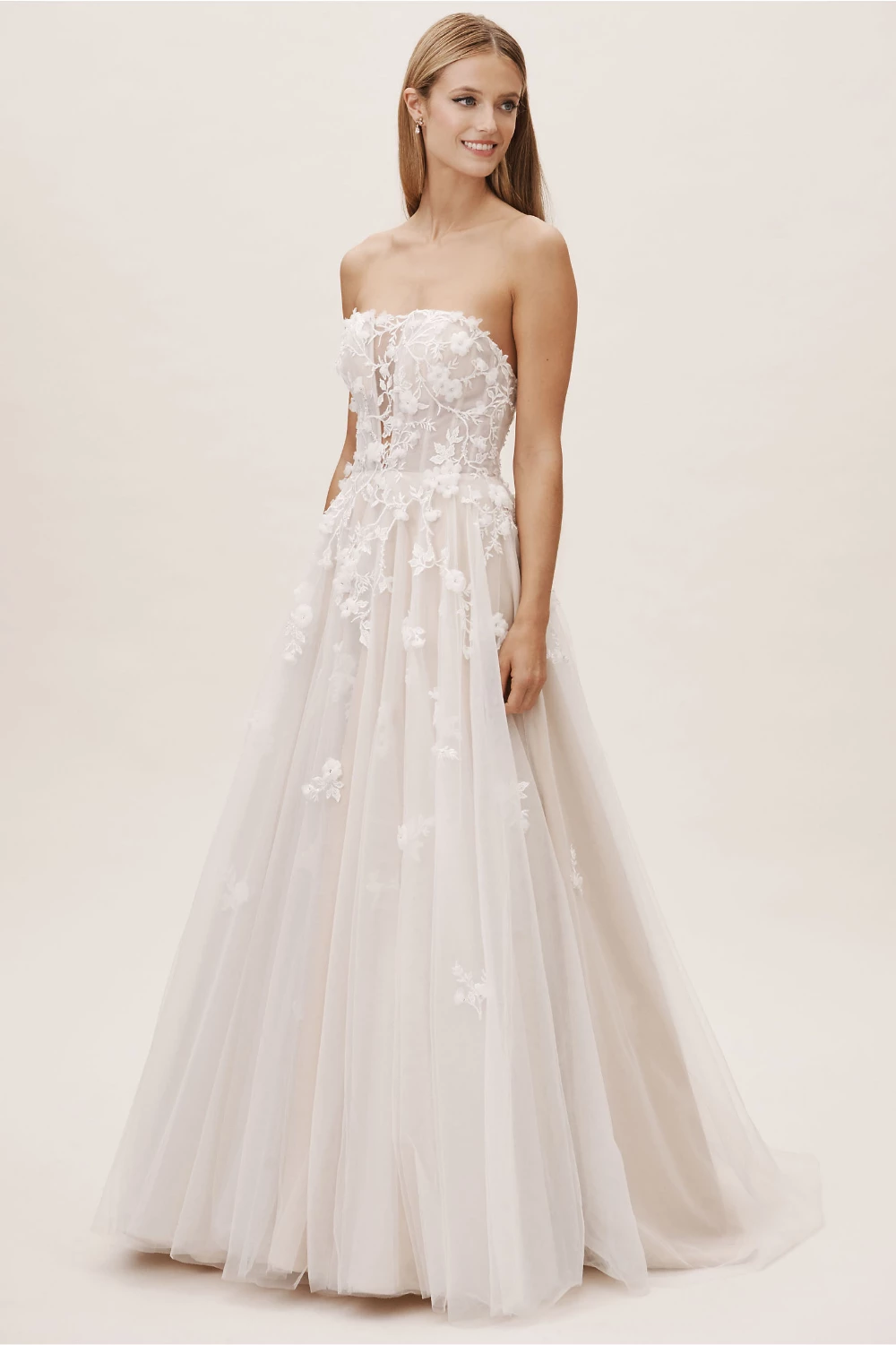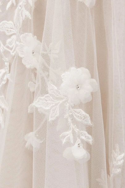 Richly layered embellishments bring showstopping detail to this strapless ballgown. Floral embroidery, accented by dimensional organza applique and intricate beading, cascades from the structured bodice across the ethereal tulle skirt. By Watters.