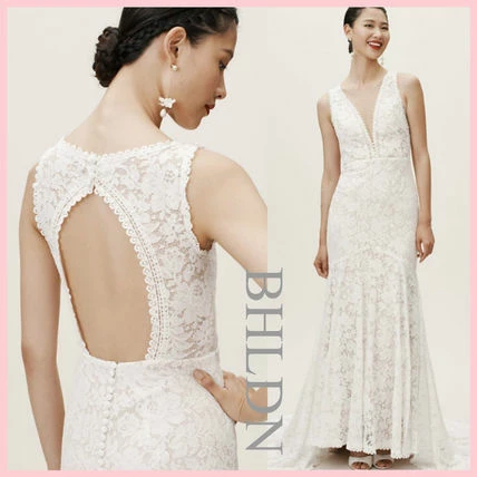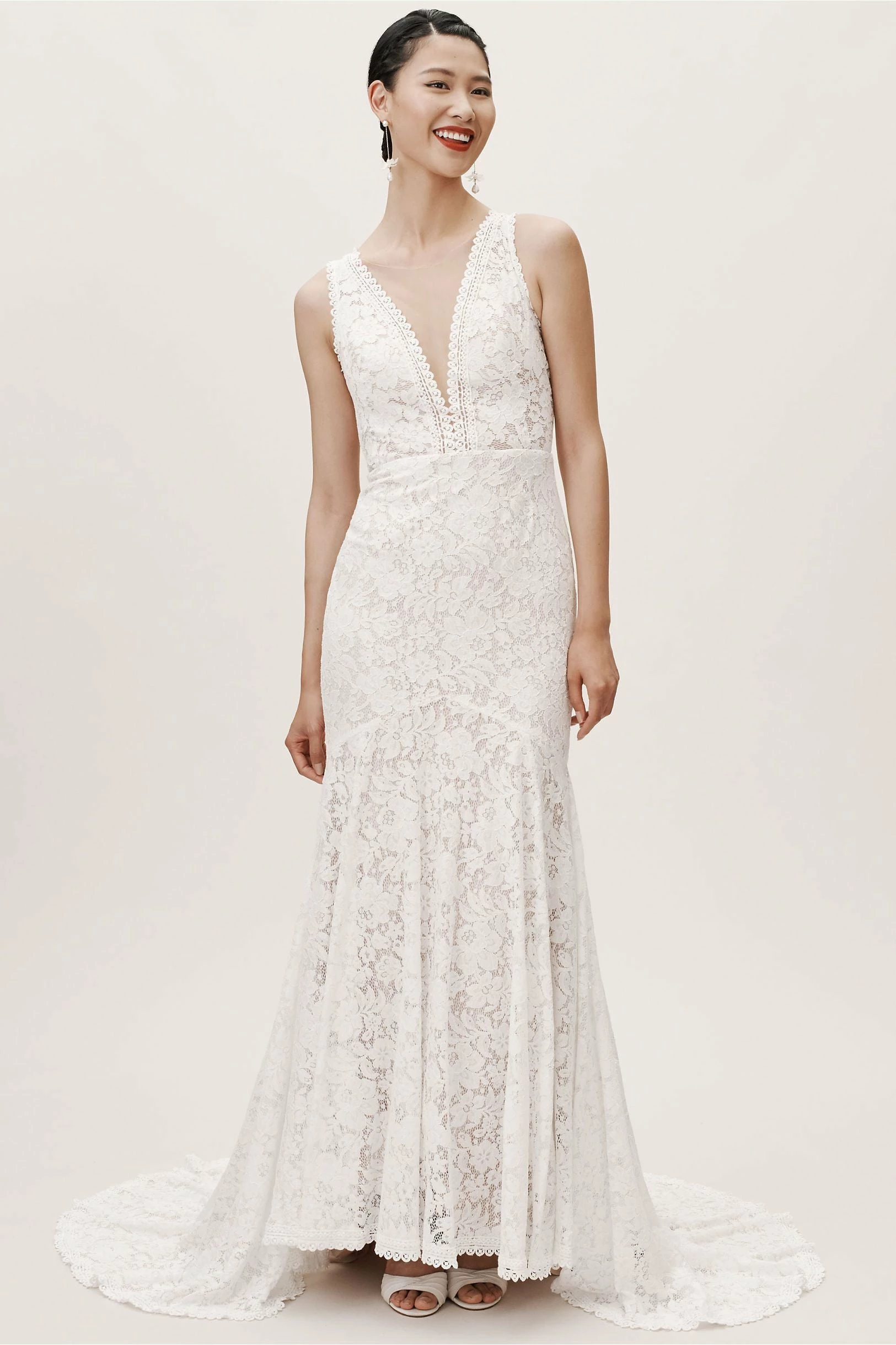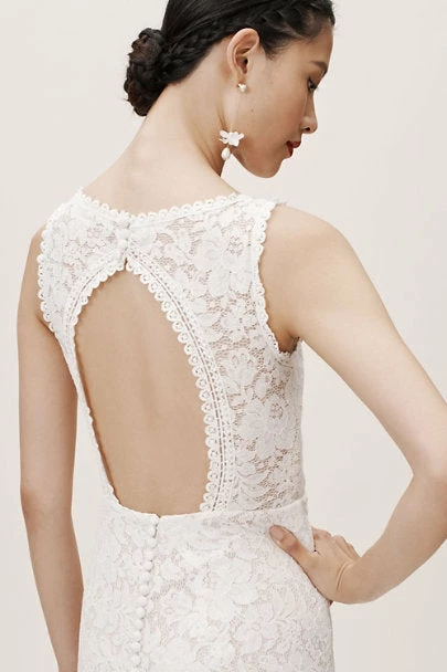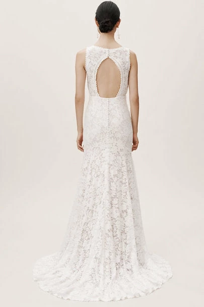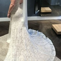 Impeccably fitted for a sultry silhouette, this allover lace gown features a plunging illusion neckline and an open back with button accents. Fitted through the hips, the skirt kicks out into a full train that makes a dramatic statement. By Whispers & Echoes. Â