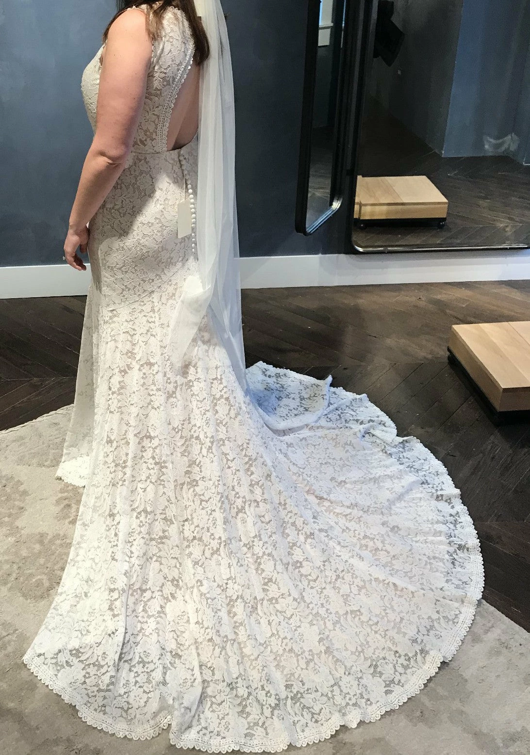 Brand new, without tags. Has been tried on in store, but never worn outside the salon. I have Sizes 4 and 14. Retail price: $1,295. Â