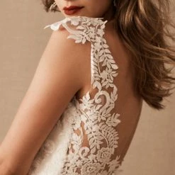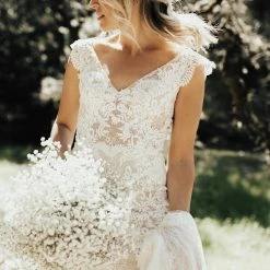 Soft lace is swathed in ivory floral embroidery, perfectly placed to highlight your best assets. The v-neckline and delicate flutter sleeves give way to a sexy open back, while a frothy train completes the look. By Whispers & Echoes.