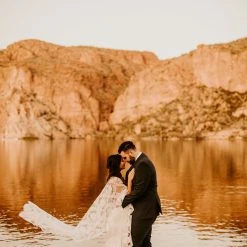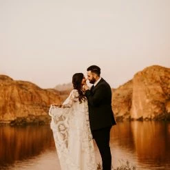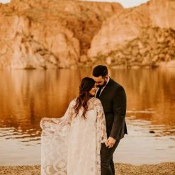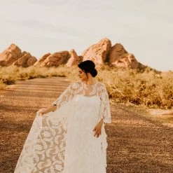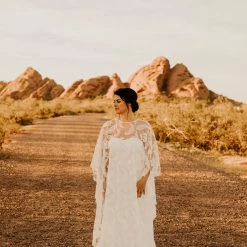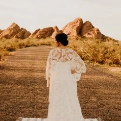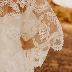 OMG this cape. You can pair it with almost anything to create a stunning new look. Wear it over a bright color to make it really pop, and take it off for a quick and easy outfit change before you hit the dance floor. This bohemian wedding cape boasts botanical embroidery and with scalloped edges. This unique bridal cape drapes beautifully down the front and back for an elevated boho addition to any wedding gown.