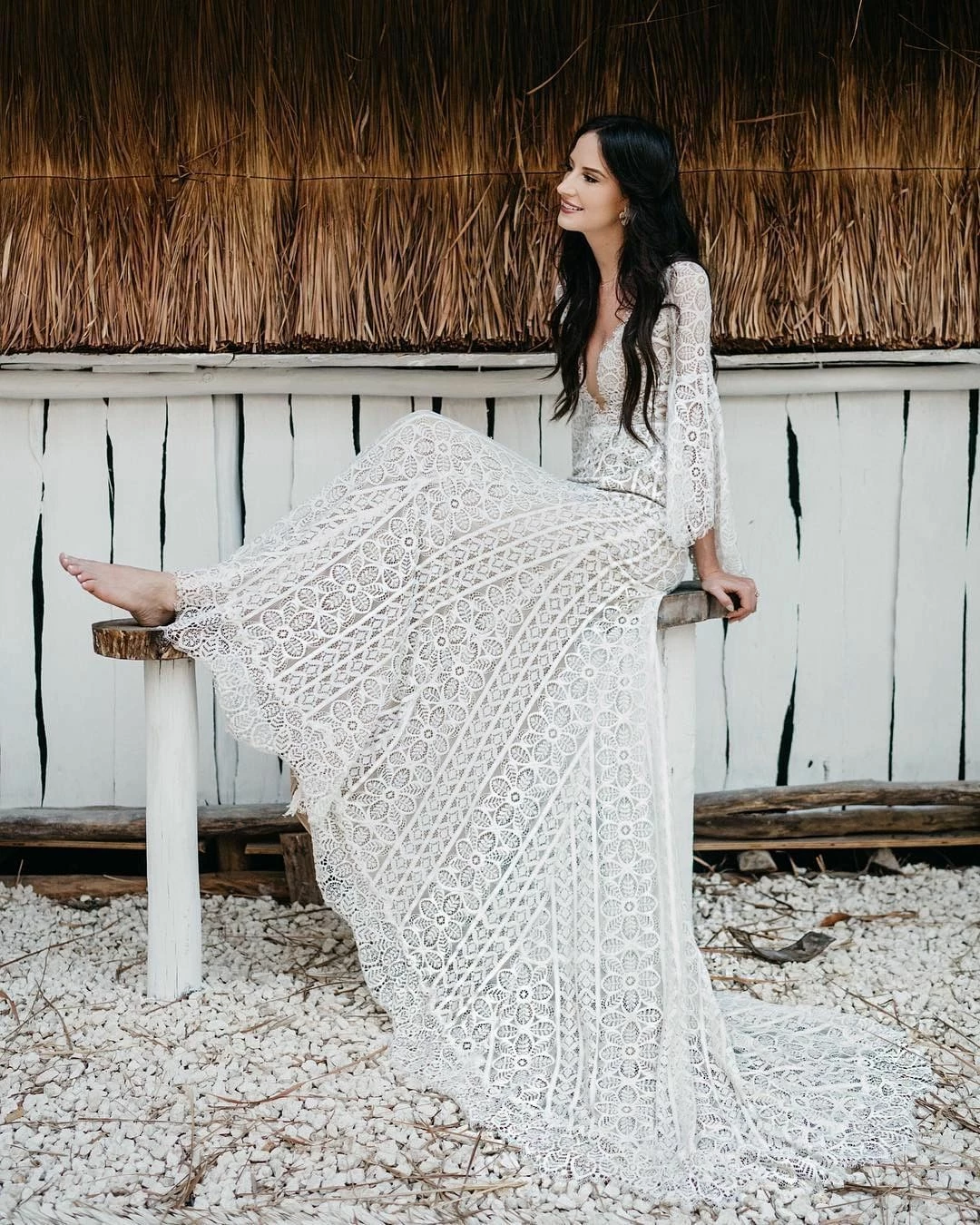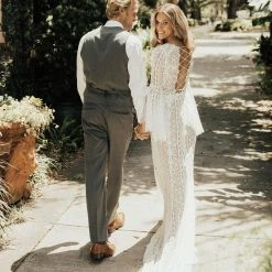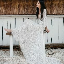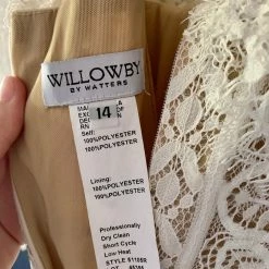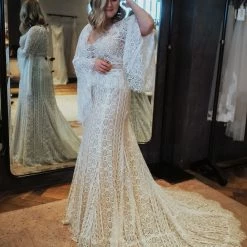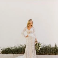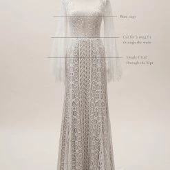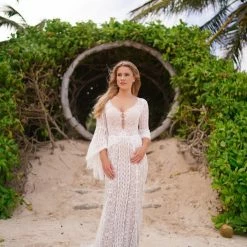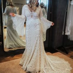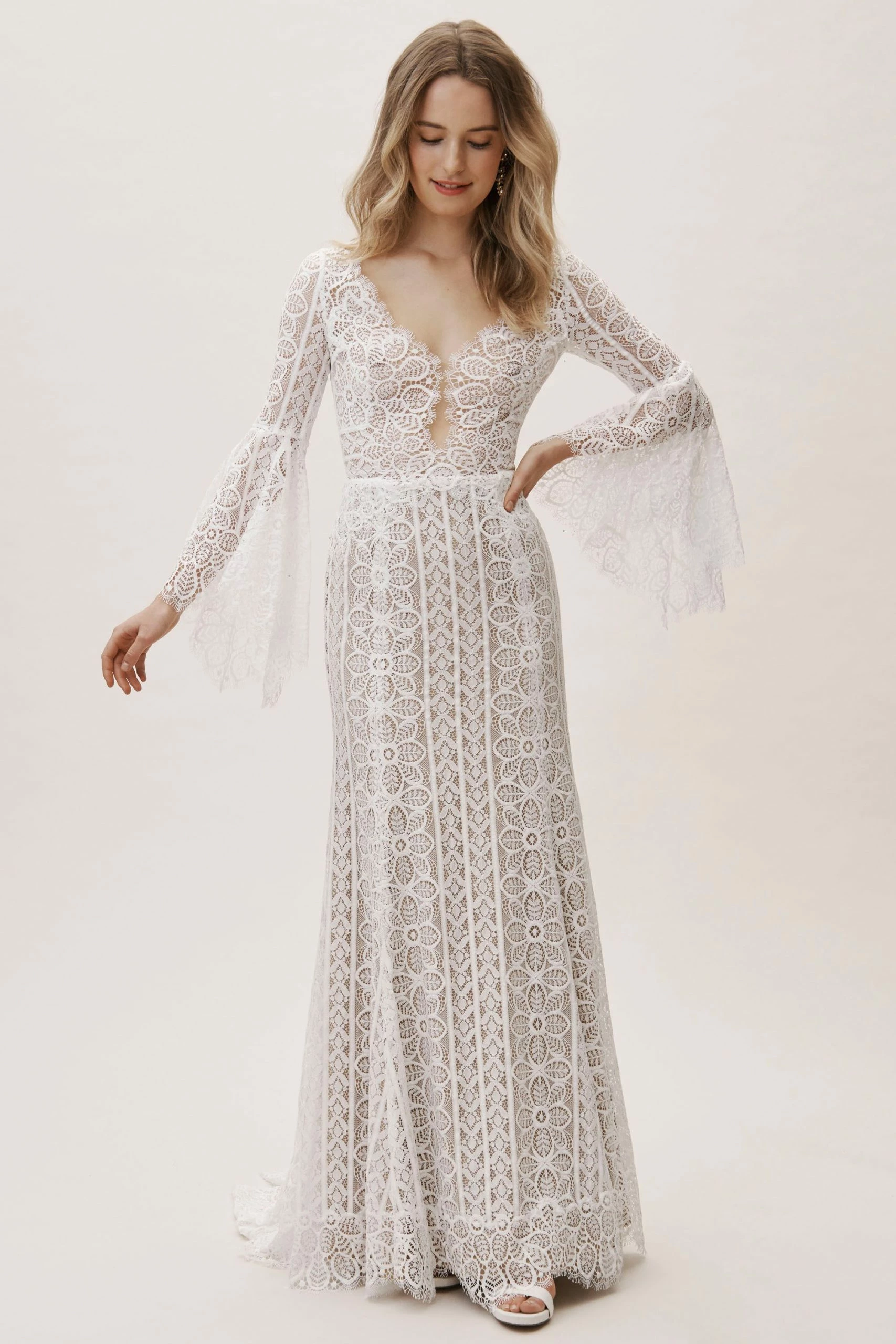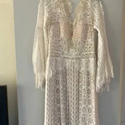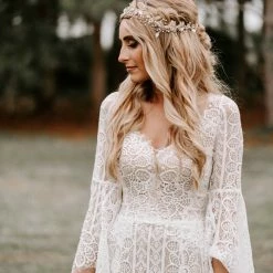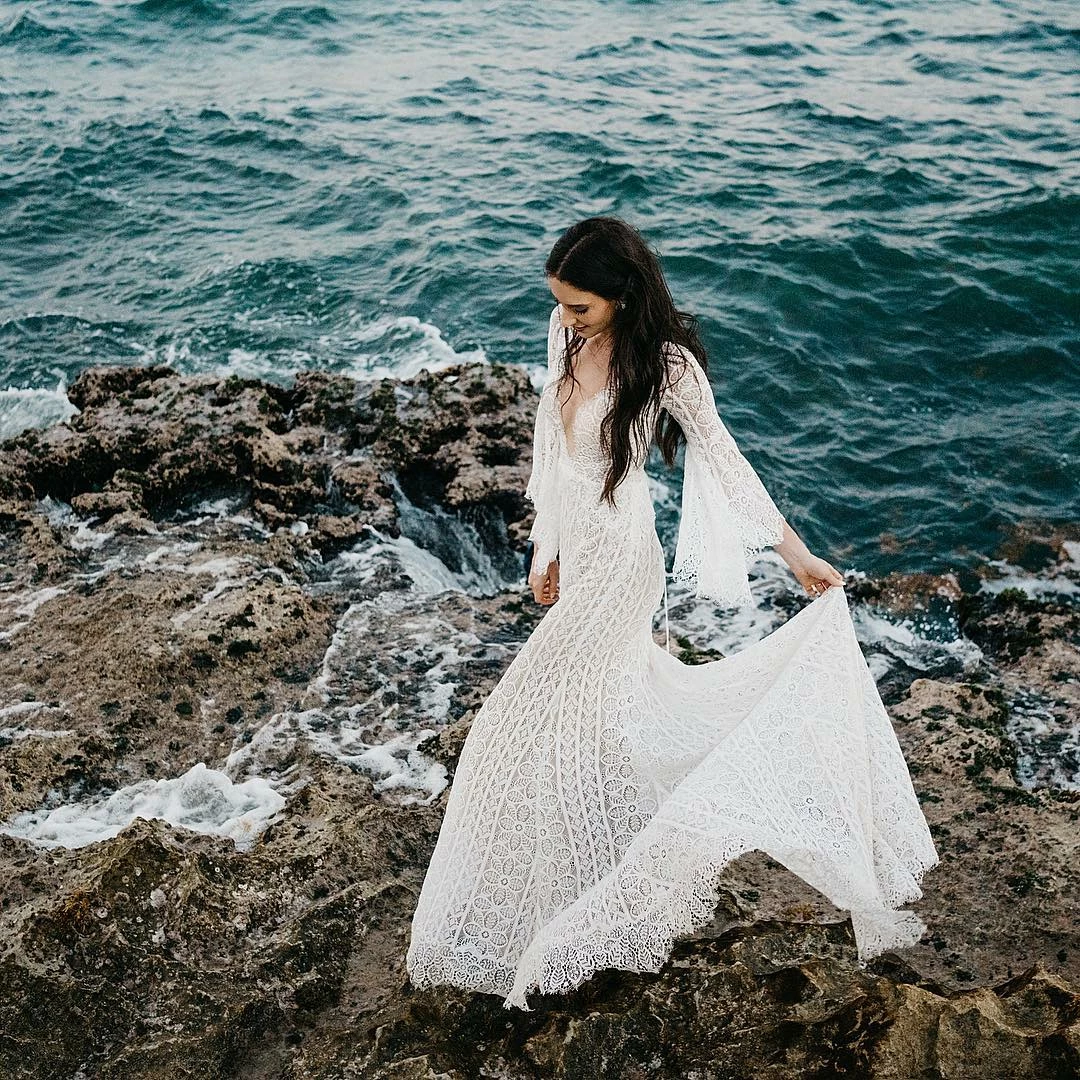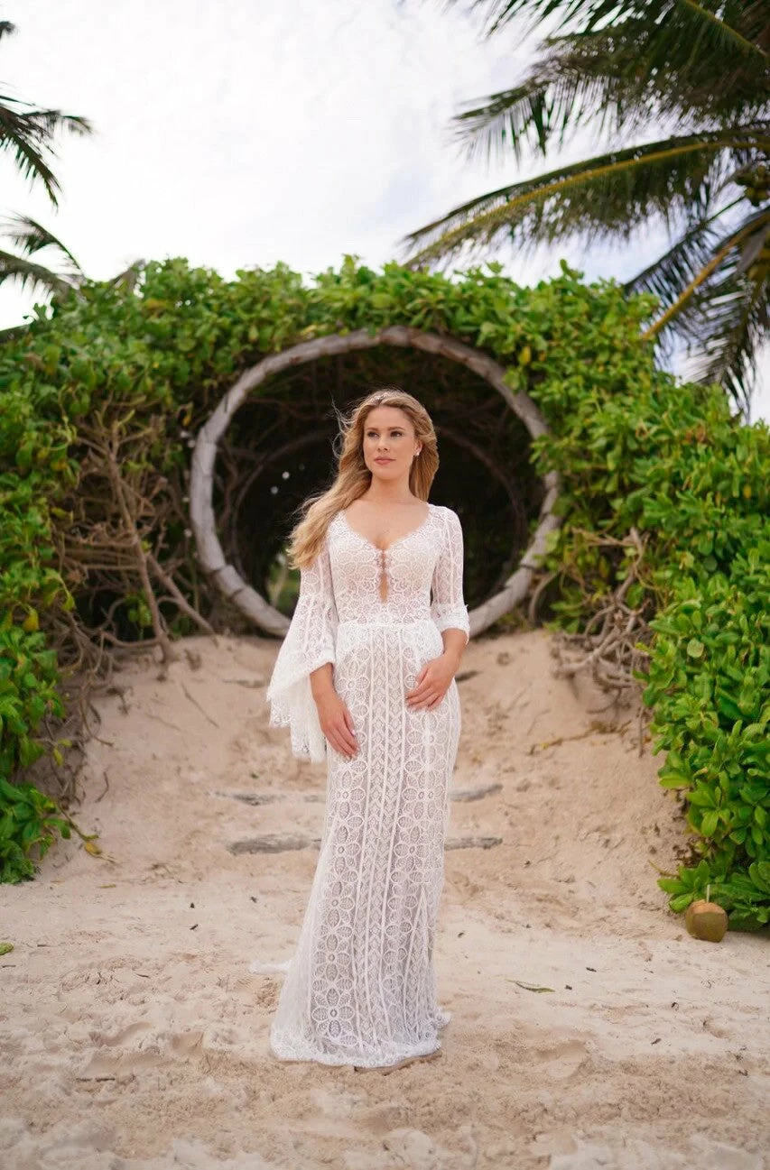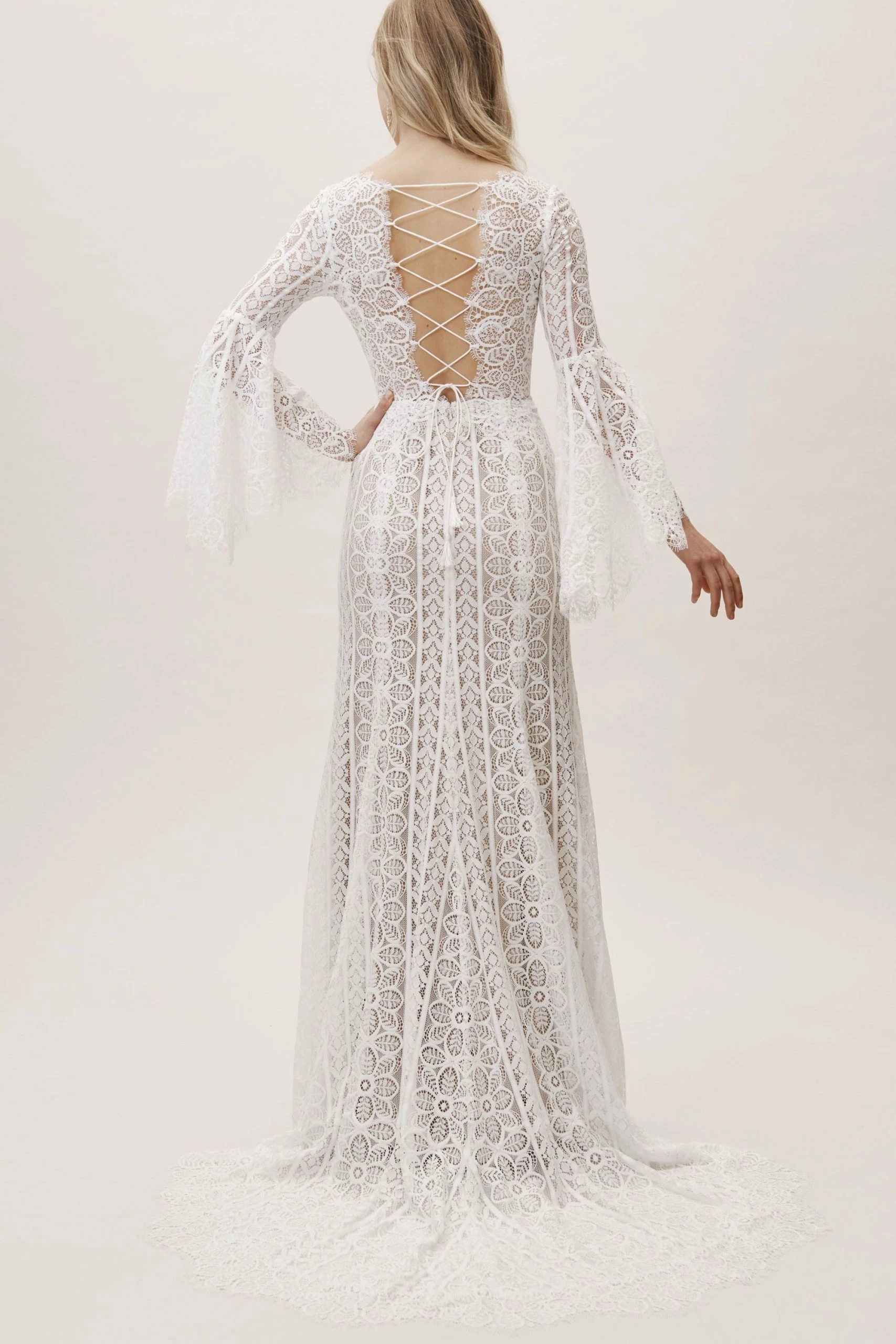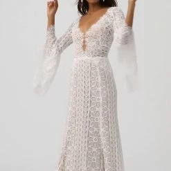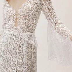 This bohemian beauty is made from dreamy allover lace with stunning accents that include a plunging neckline, romantic bell sleeves, and lace-up detail at the back. By Willowby by Watters. Â