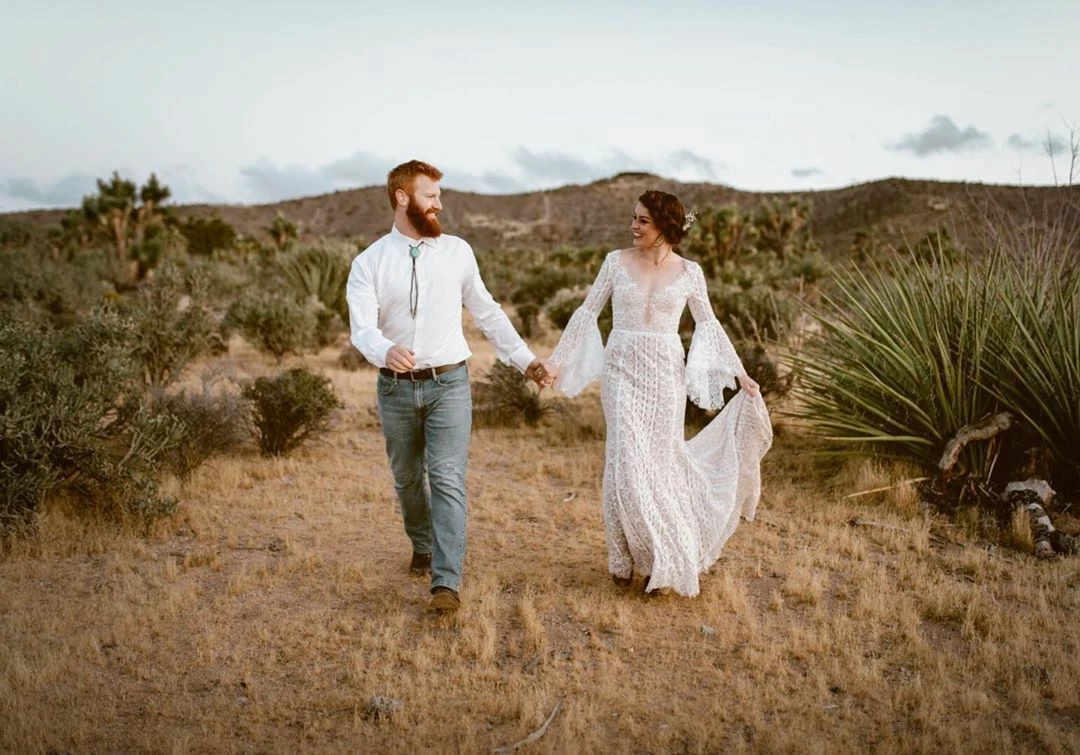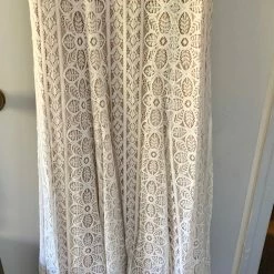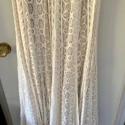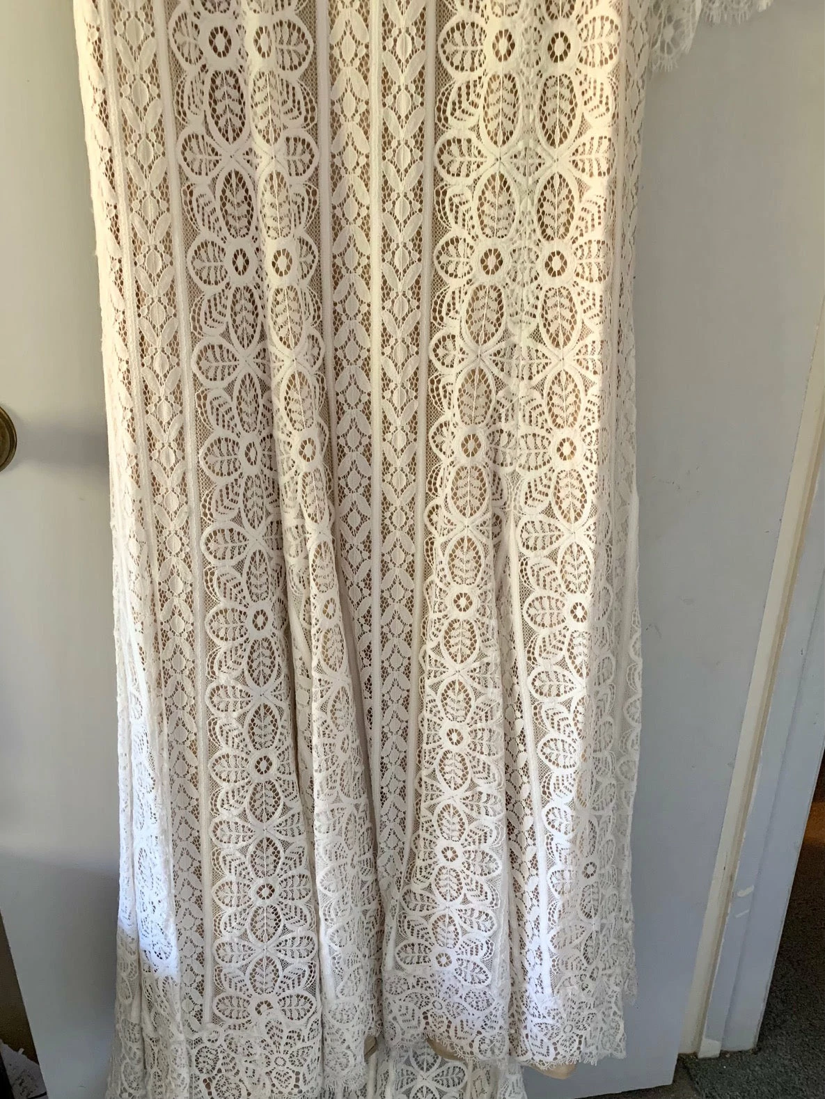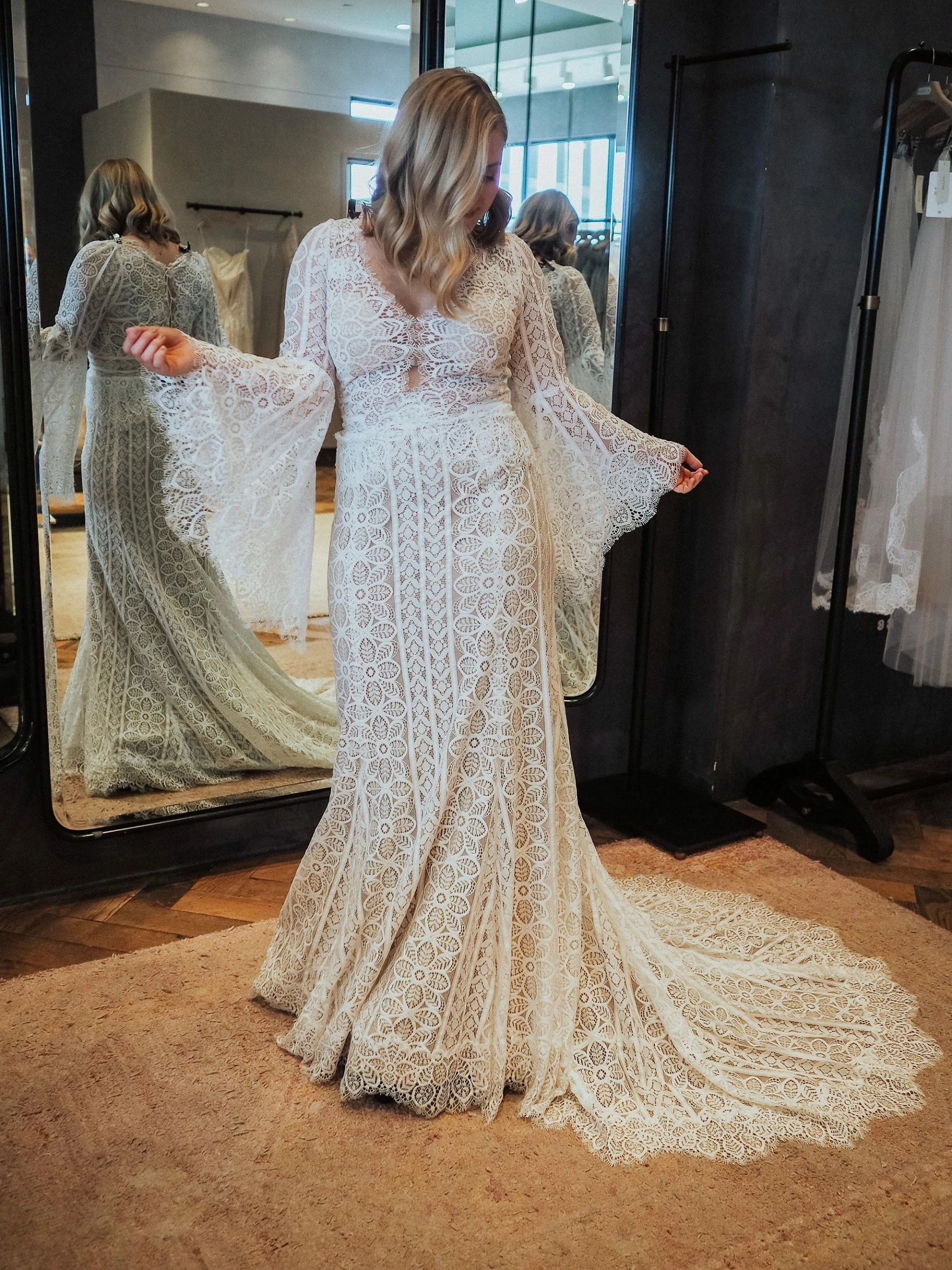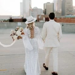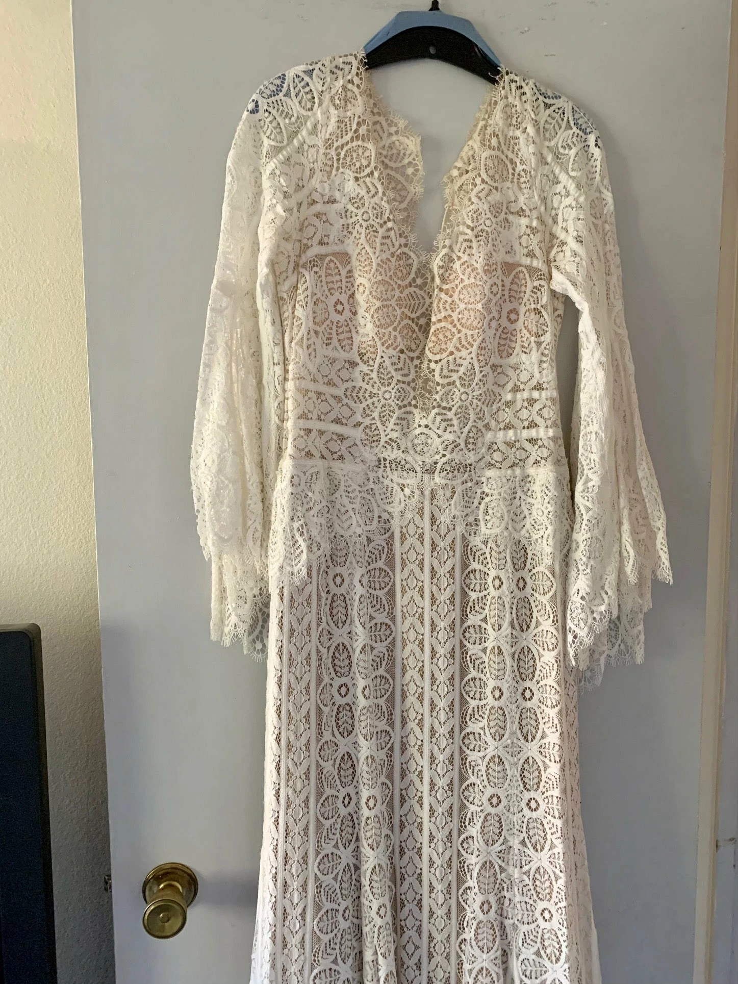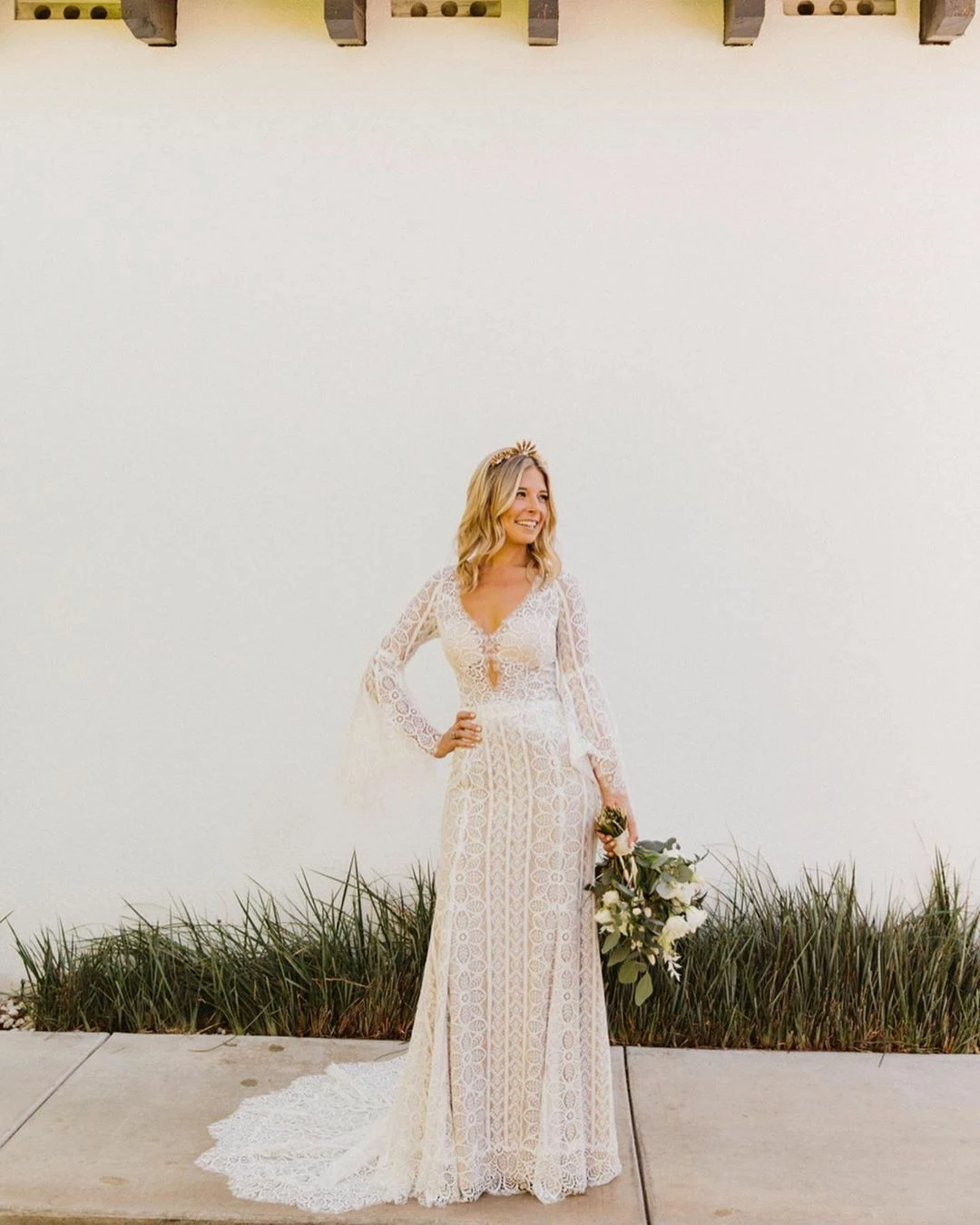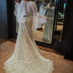 This bohemian beauty is made from dreamy allover lace with stunning accents that include a plunging neckline, romantic bell sleeves, and lace-up detail at the back. By Willowby by Watters. Â