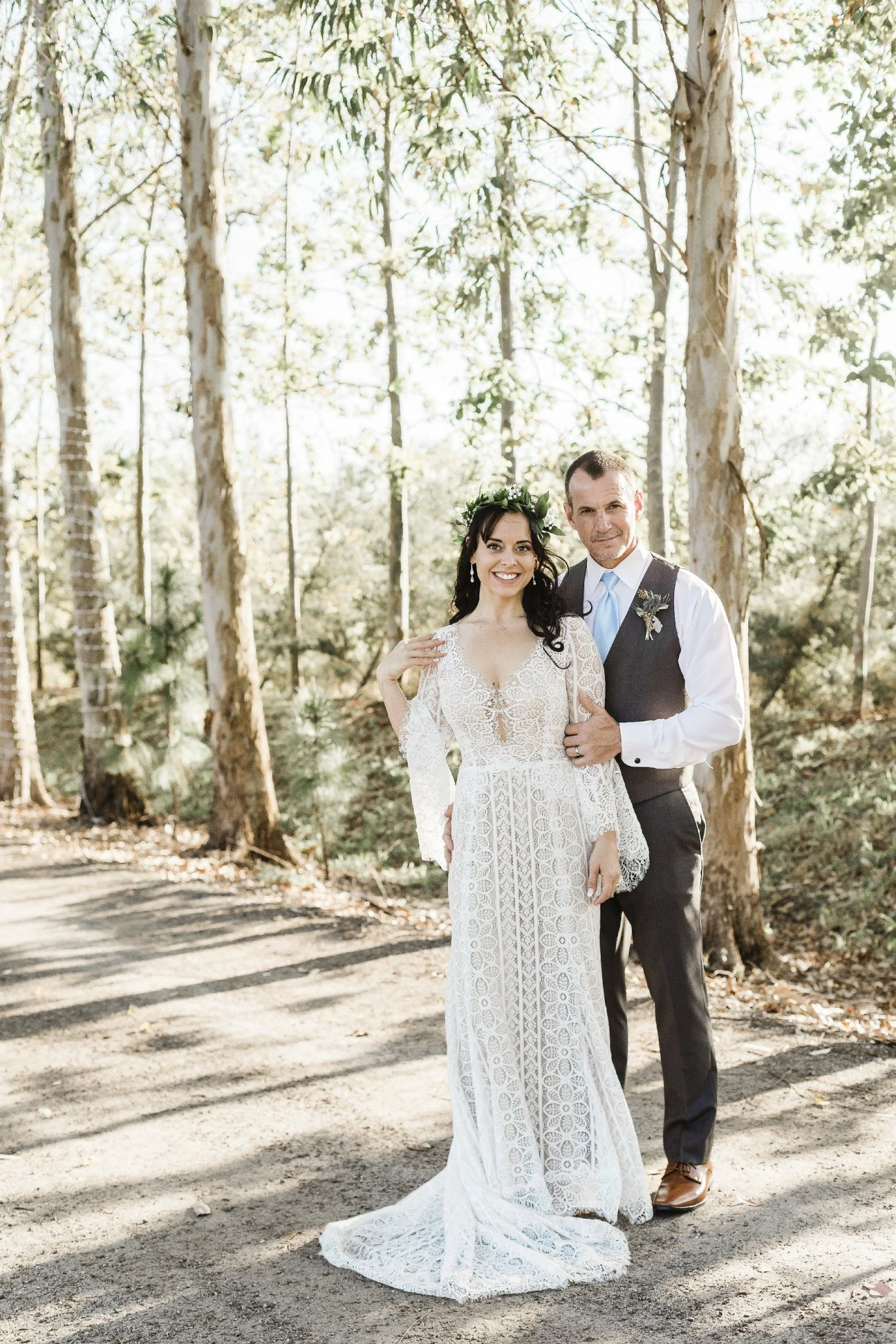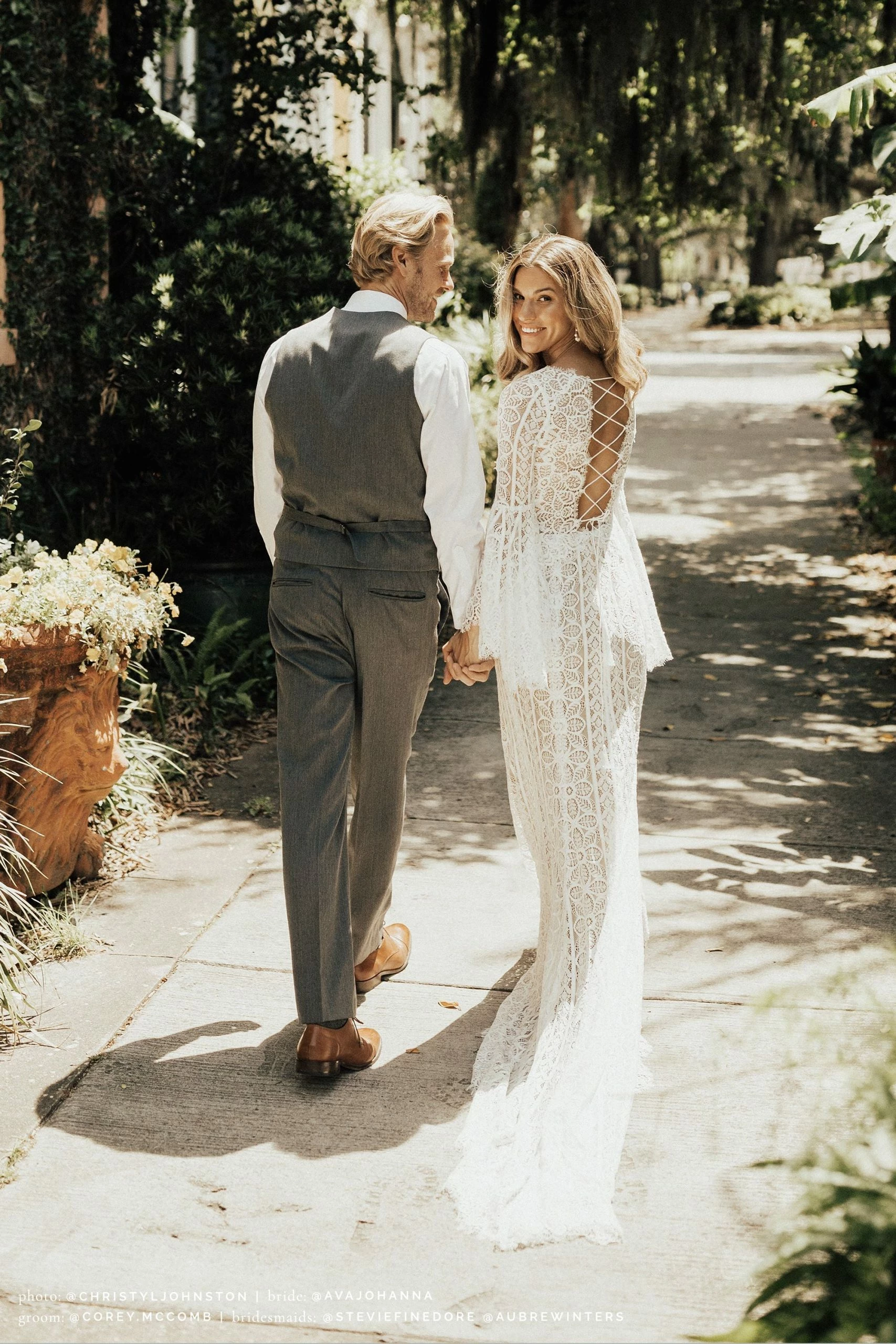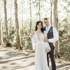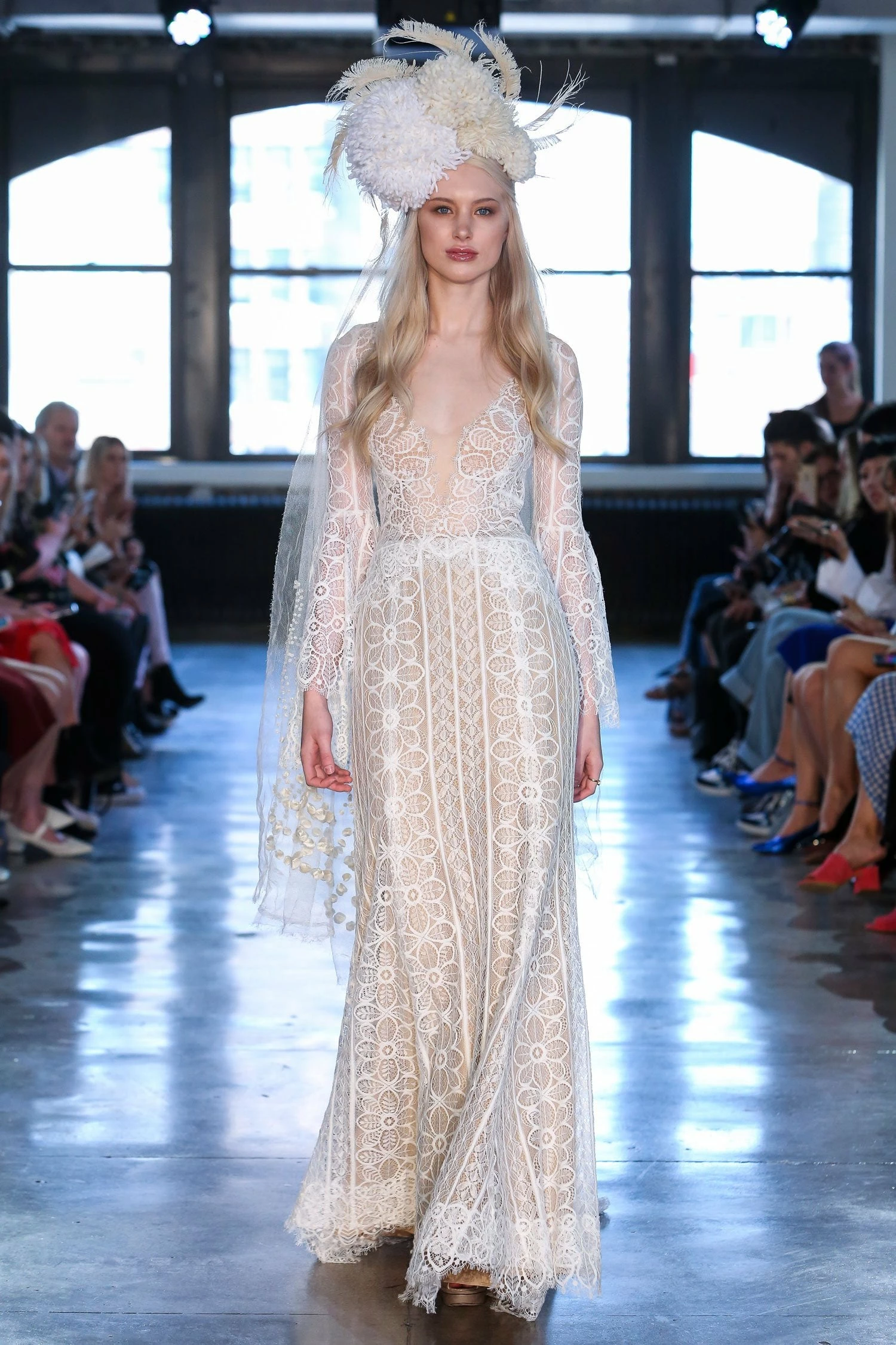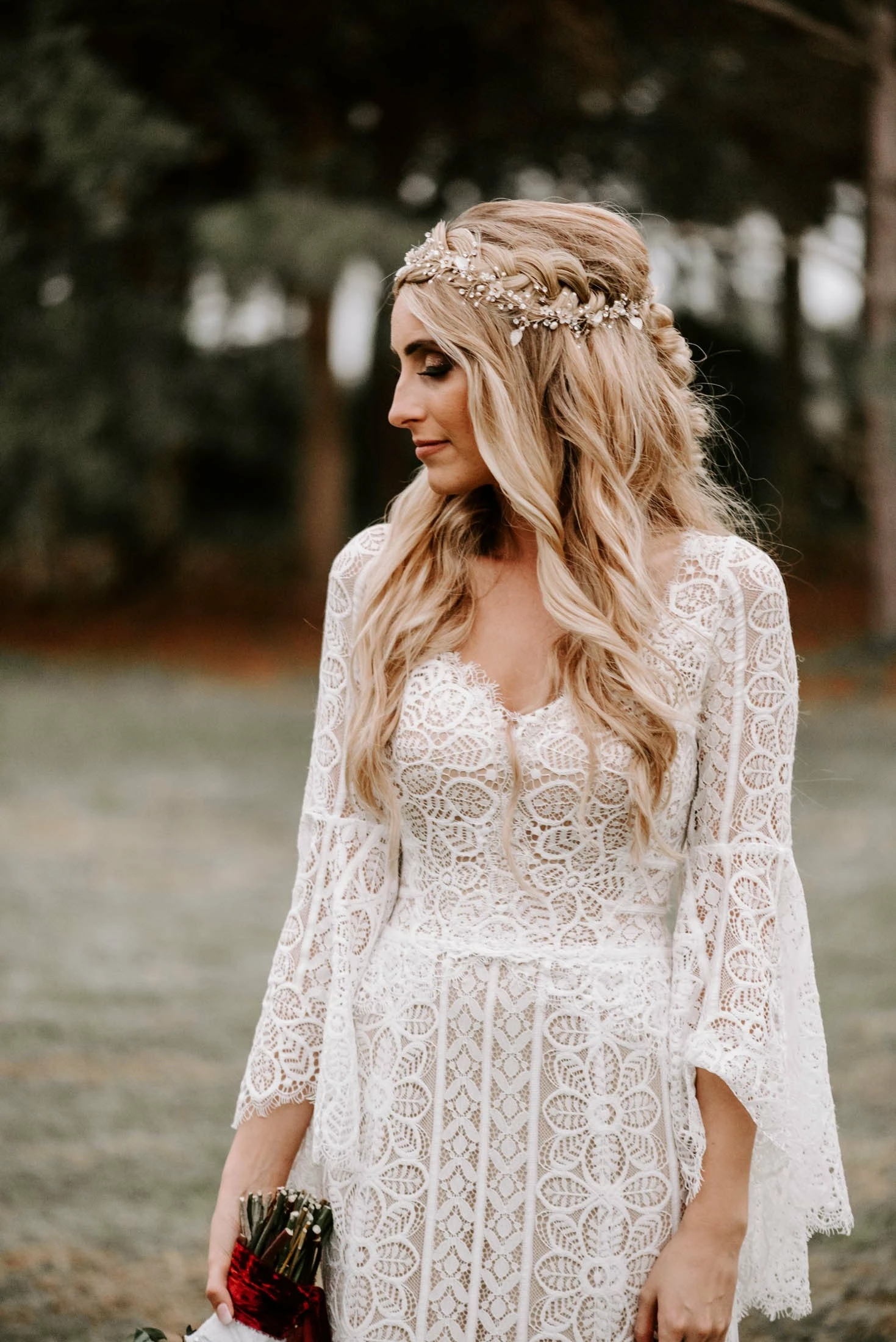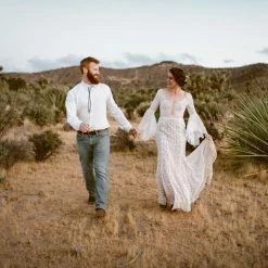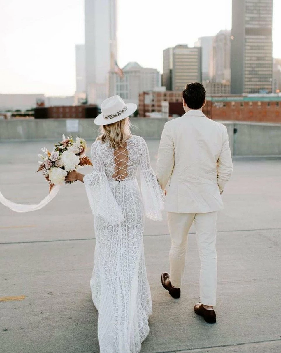 This bohemian beauty is made from dreamy allover lace with stunning accents that include a plunging neckline, romantic bell sleeves, and lace-up detail at the back. By Willowby by Watters. Â