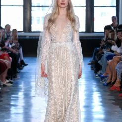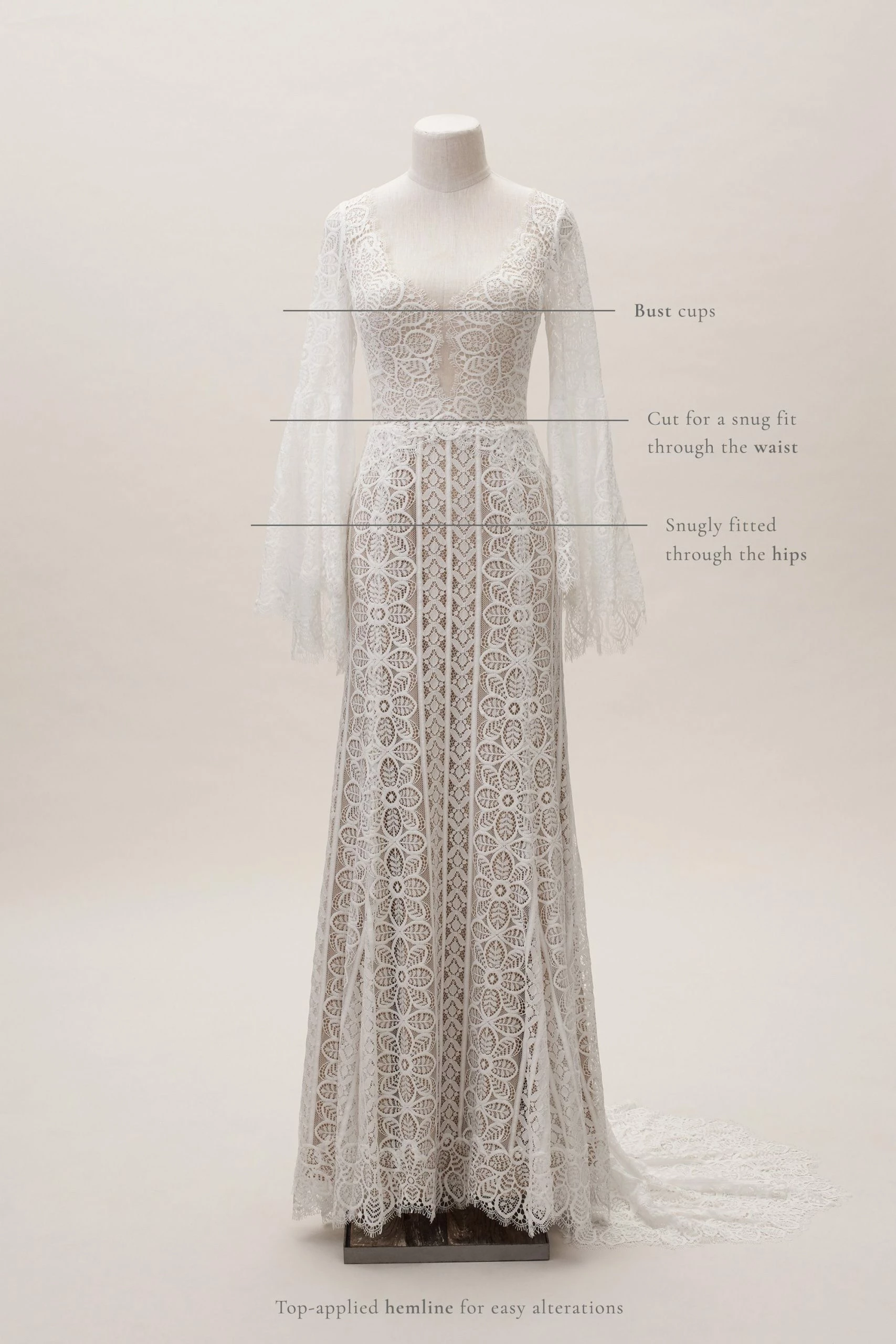 Sheer lace in vertical stripes elegantly elongates your figure on this dress with more than a nod to paintings of the romantic era. Slender lacing down the back and swingy bell sleeves make this gown a dreamy addition to your big day.