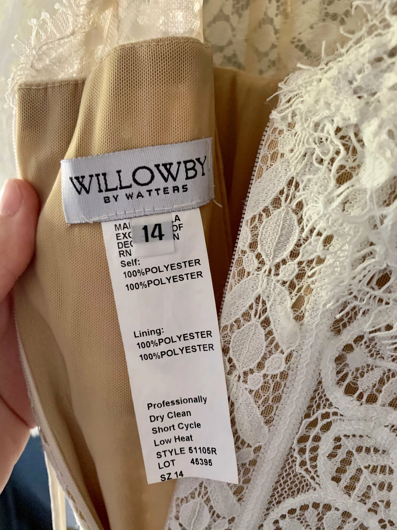 - Back zip, tie back closure
