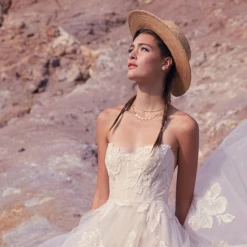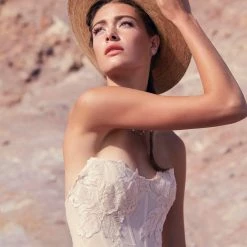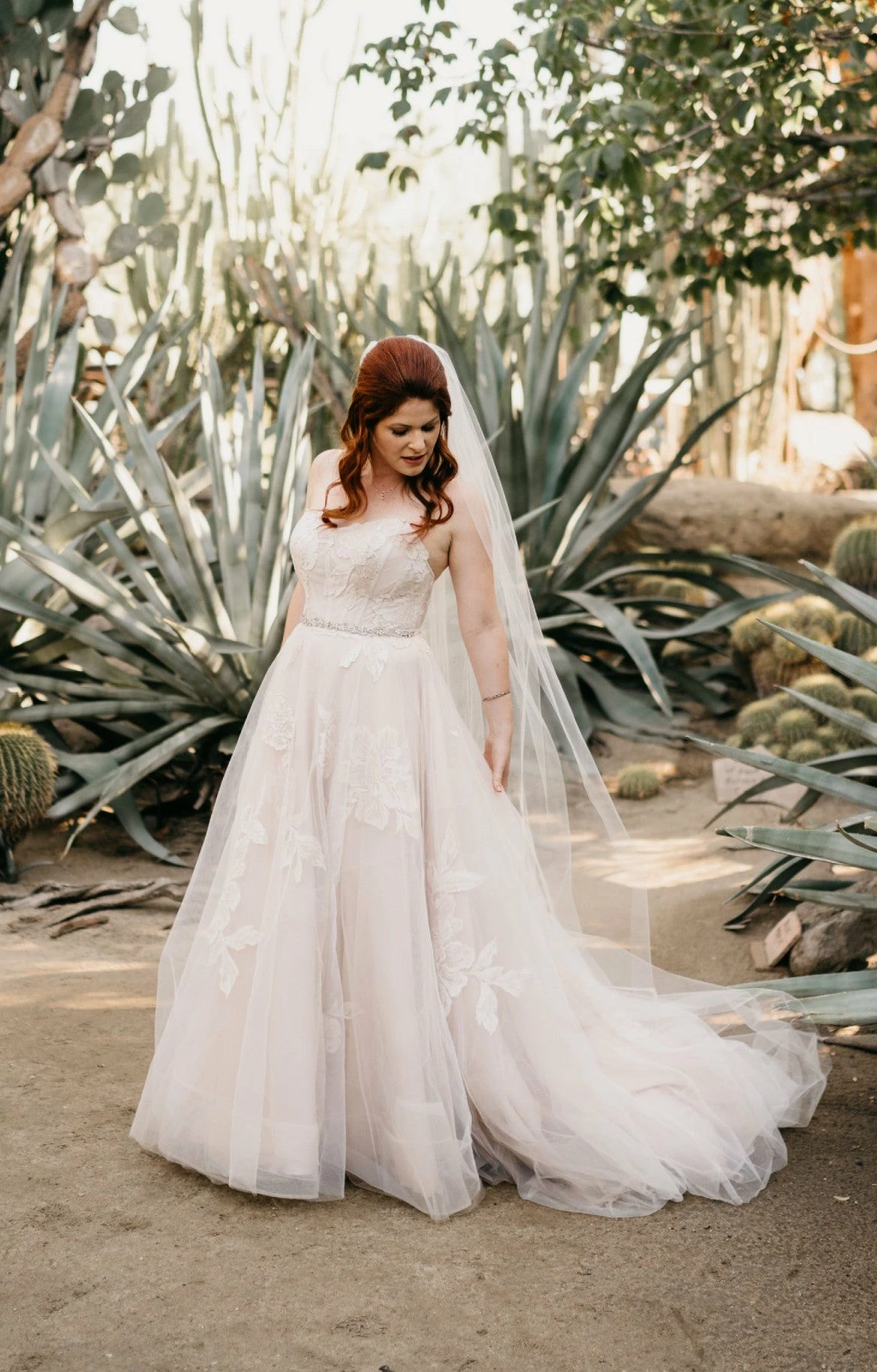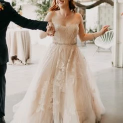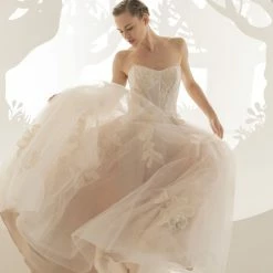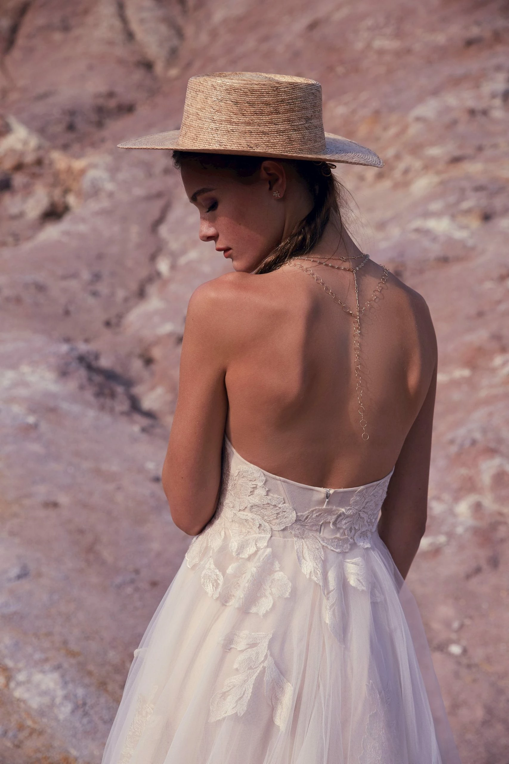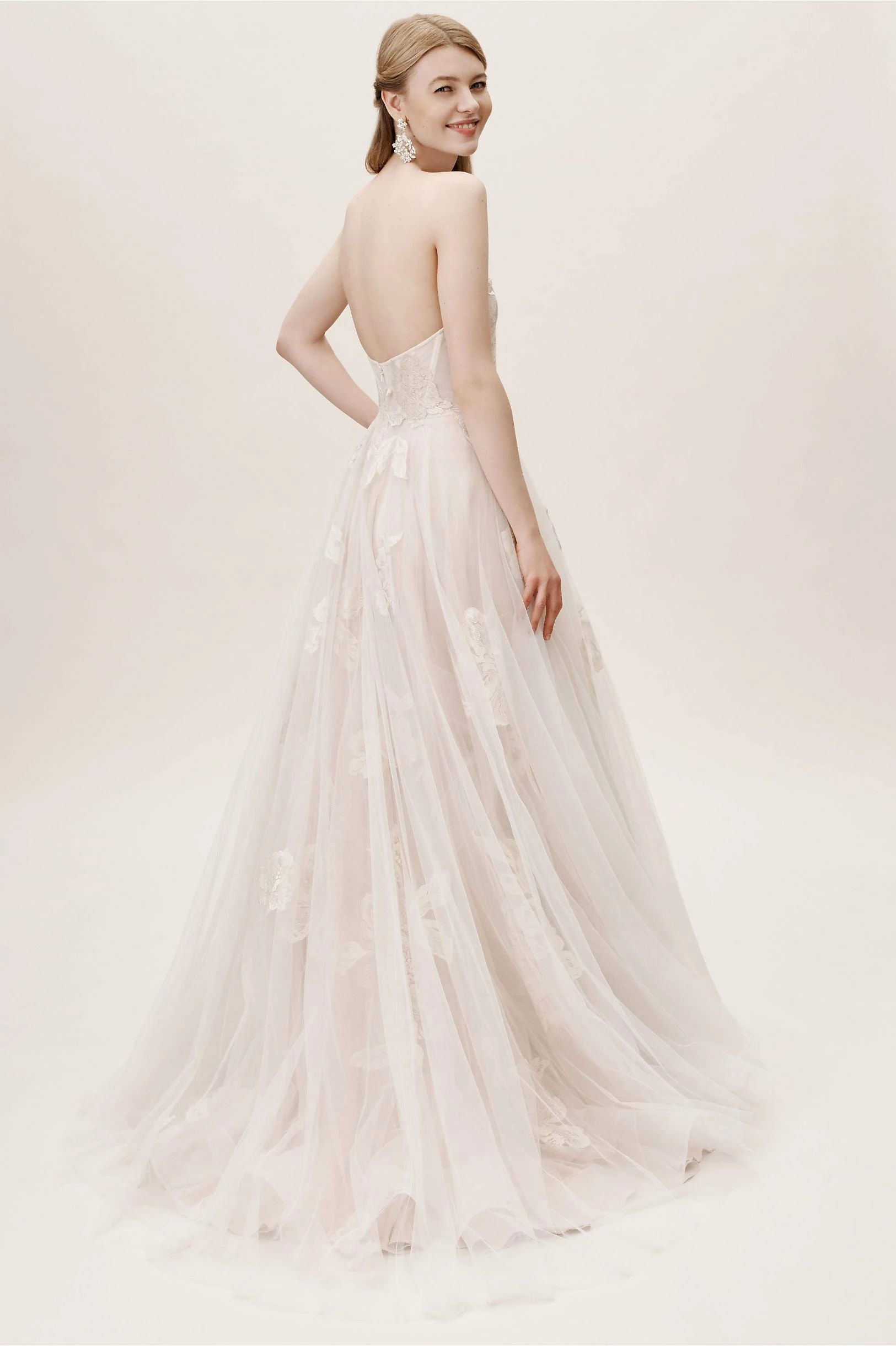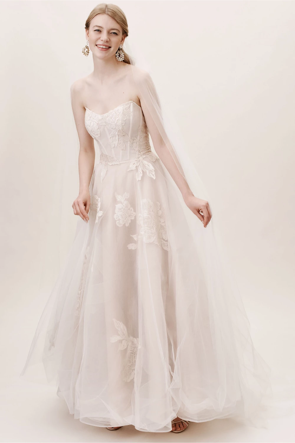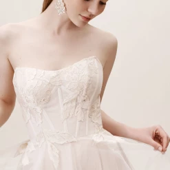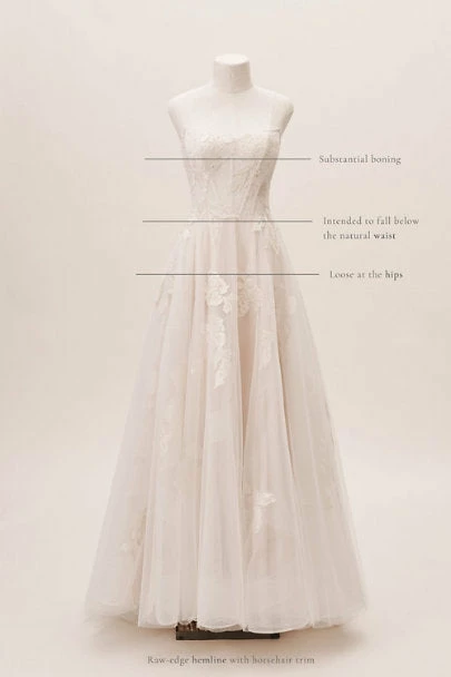 Large-scale embroidery adds dimension and texture to this strapless tulle ballgown, which gains a modern edge thanks to exposed corsetry. A sweetheart neckline completes the look. By WIllowby by Watters.Â